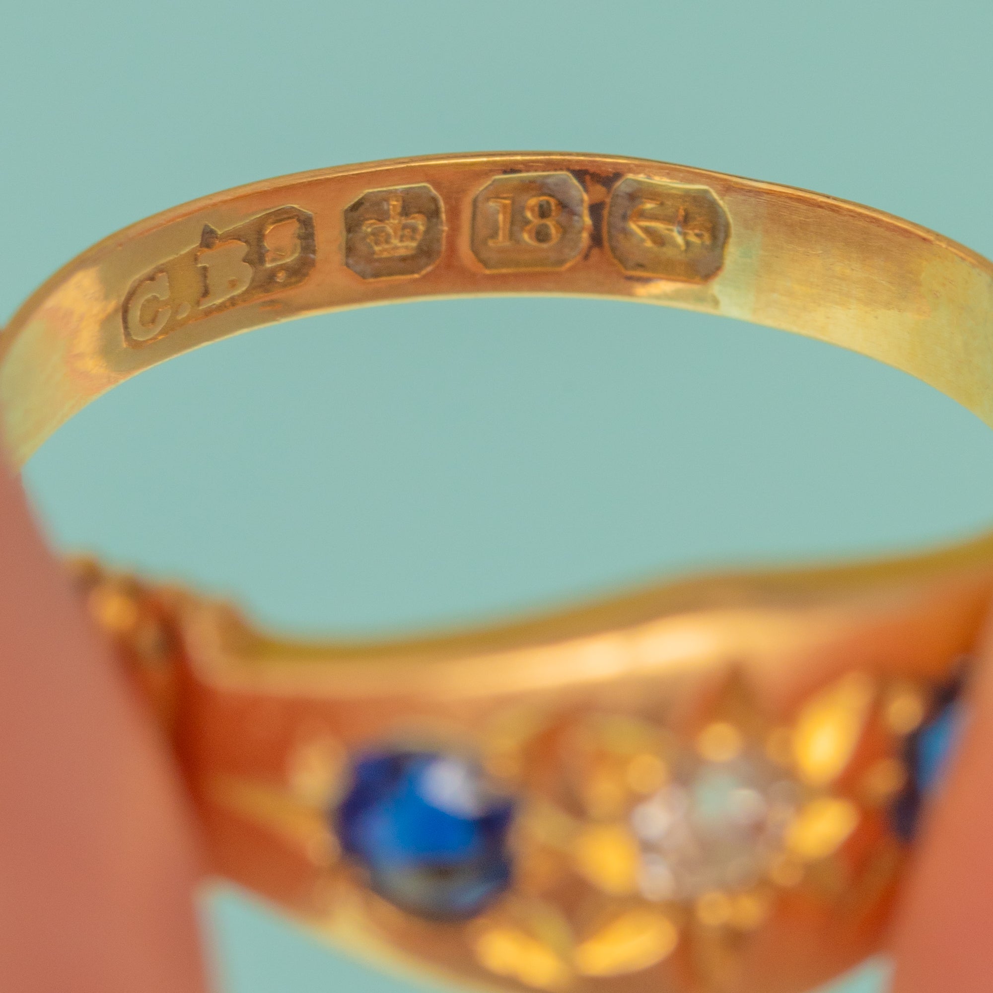 MATERIALS: Tests as 18ct Gold, Sapphire, Diamond.