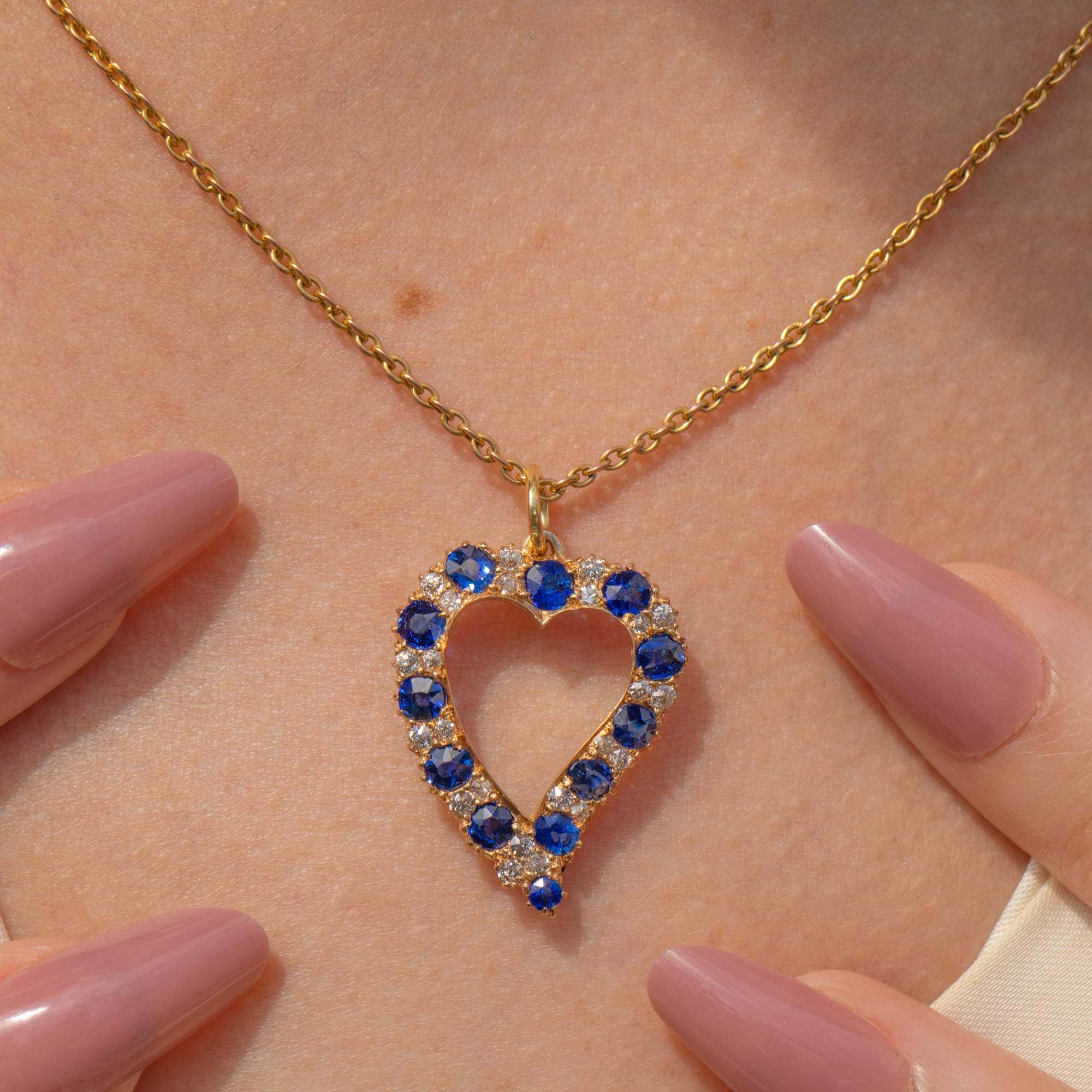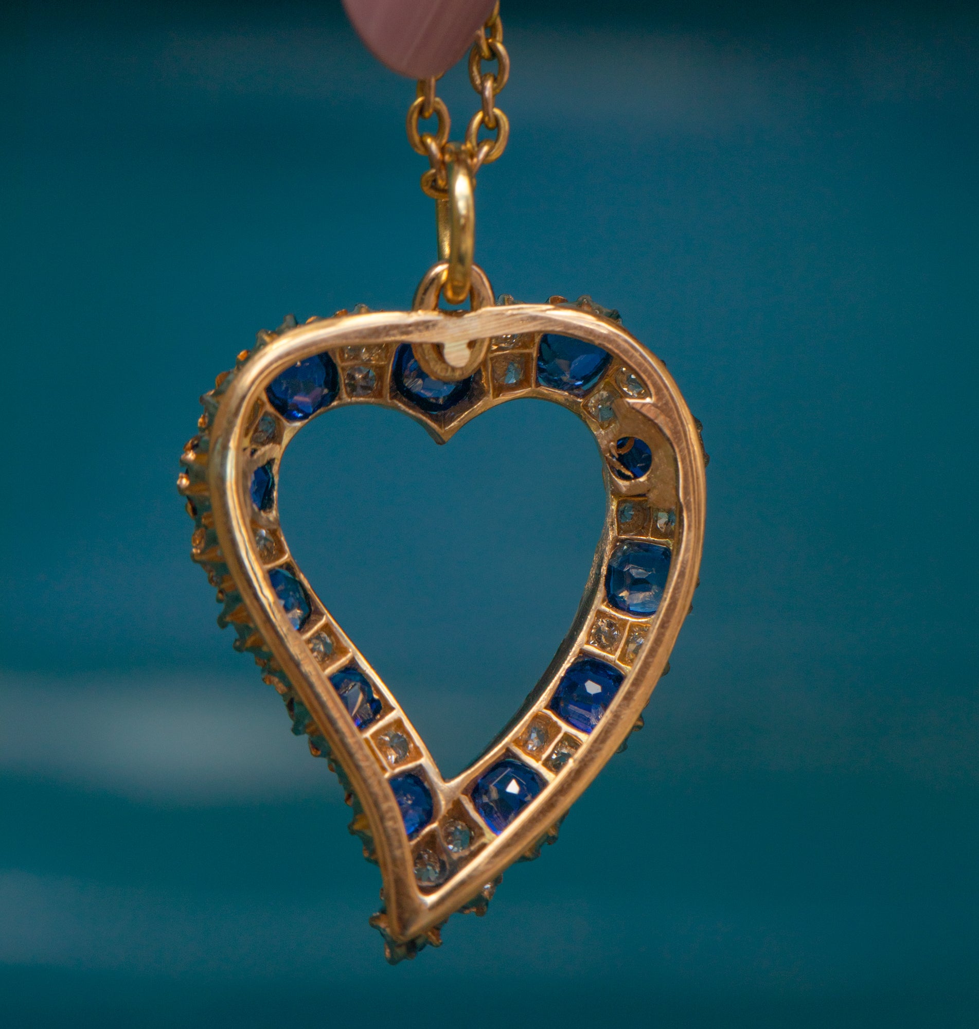 EXCELLENT. This antique 18ct Gold Sapphire Diamond witches heart pendant is in impeccable condition throughout. The hue of the 18ct Gold is remarkable, adding a touch of sunshine to any outfit. All of the Sapphires and Diamonds are intact with no signs of wear. Overall, a stunning antique love charm!