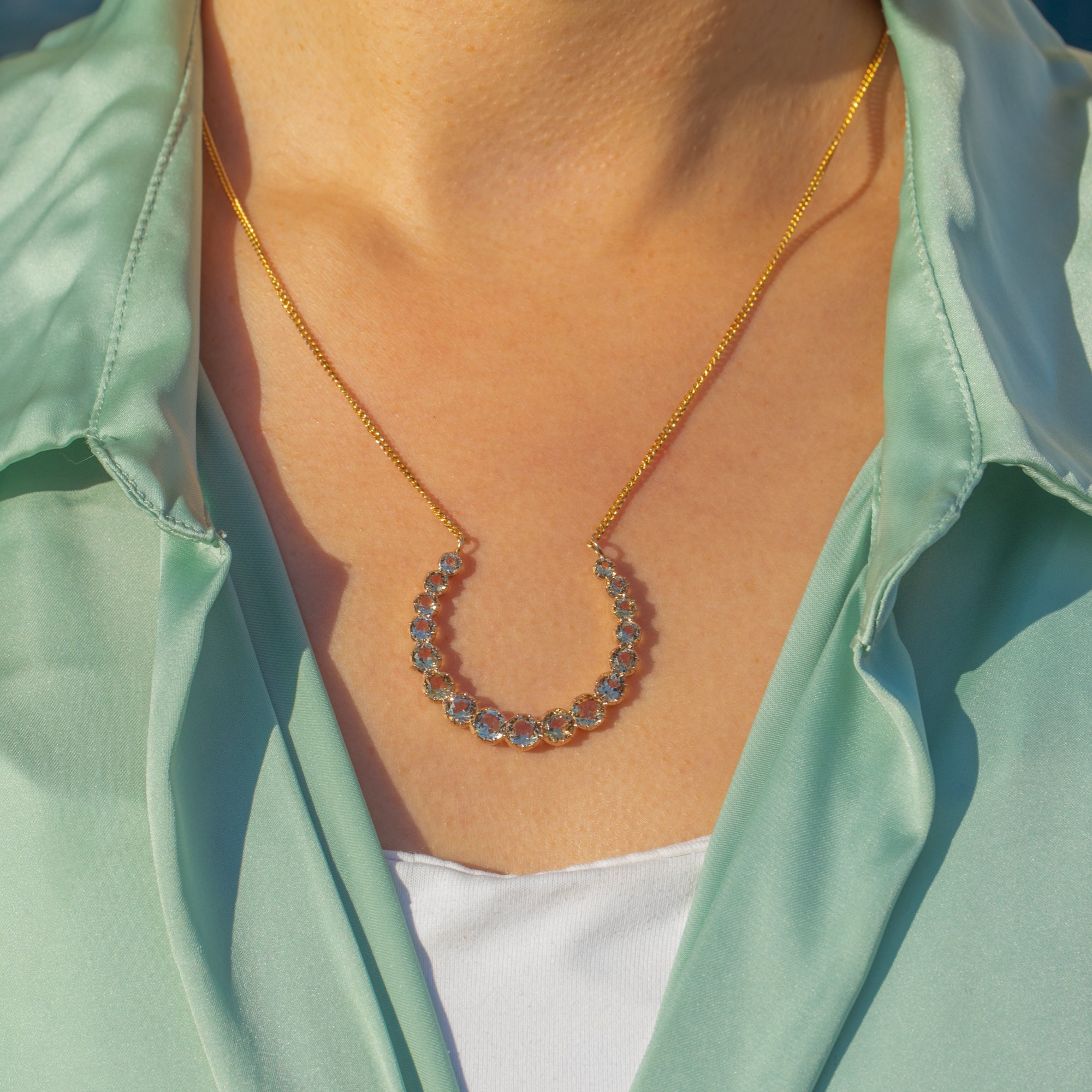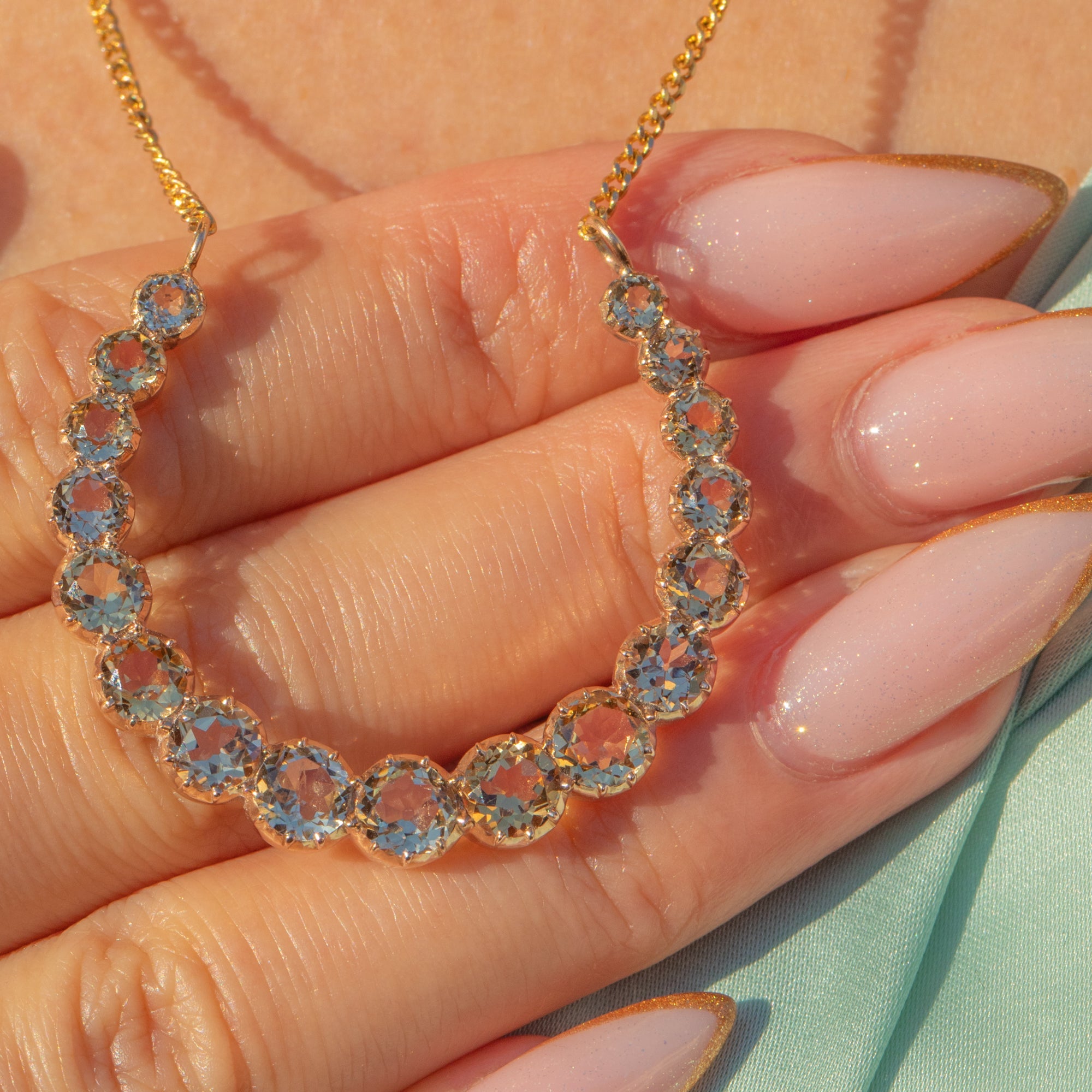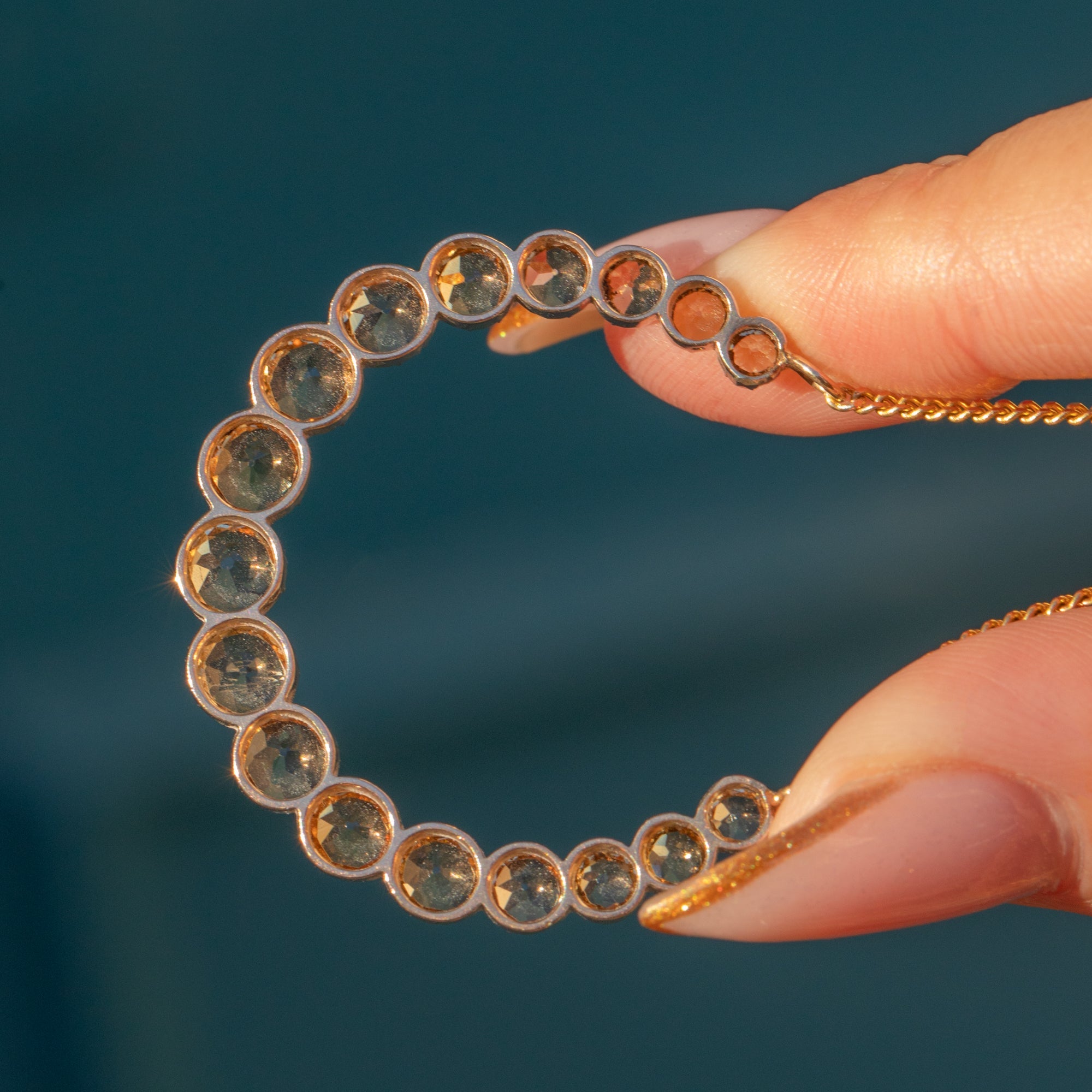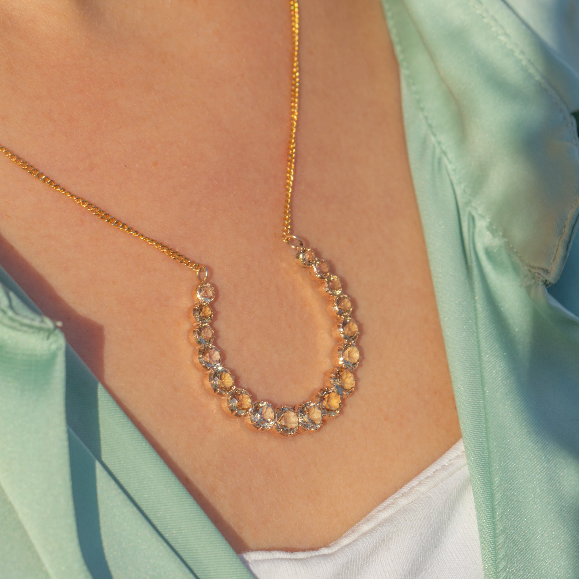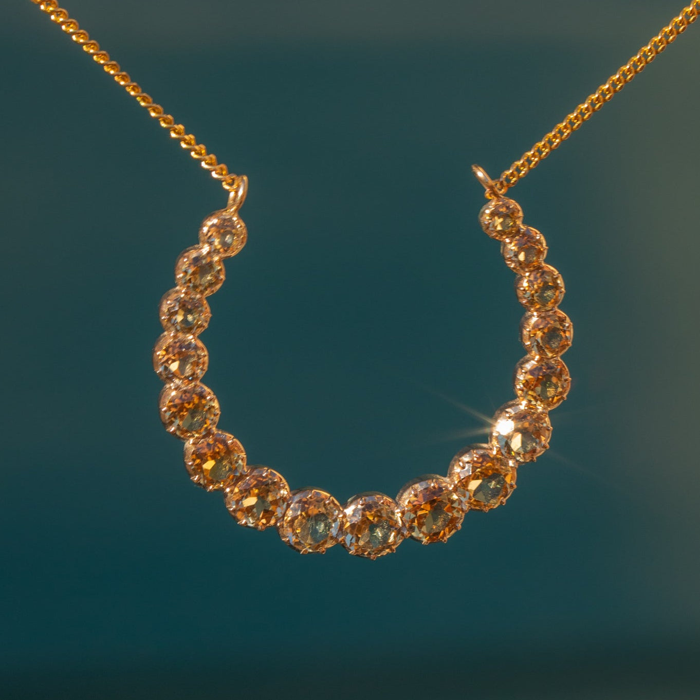 This dreamy Victorian crescent moon necklace is set with a glowing row of pale champagne Topaz, graduating gently around the curve for a soft, sparkling shimmer. The stones are collet-set in warm 15ct Gold, giving that classic mid-19th century look with a refined, minimal profile that sits beautifully at the collarbone.