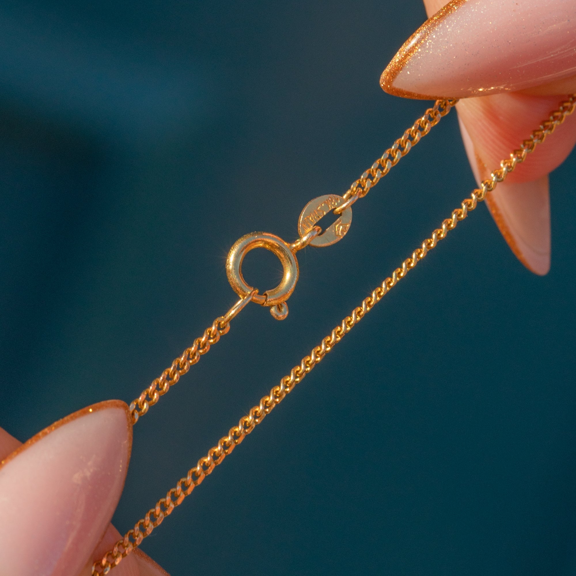 STAMPS: 18K SPAIN and an obscured maker's stamp to the chain (later added).