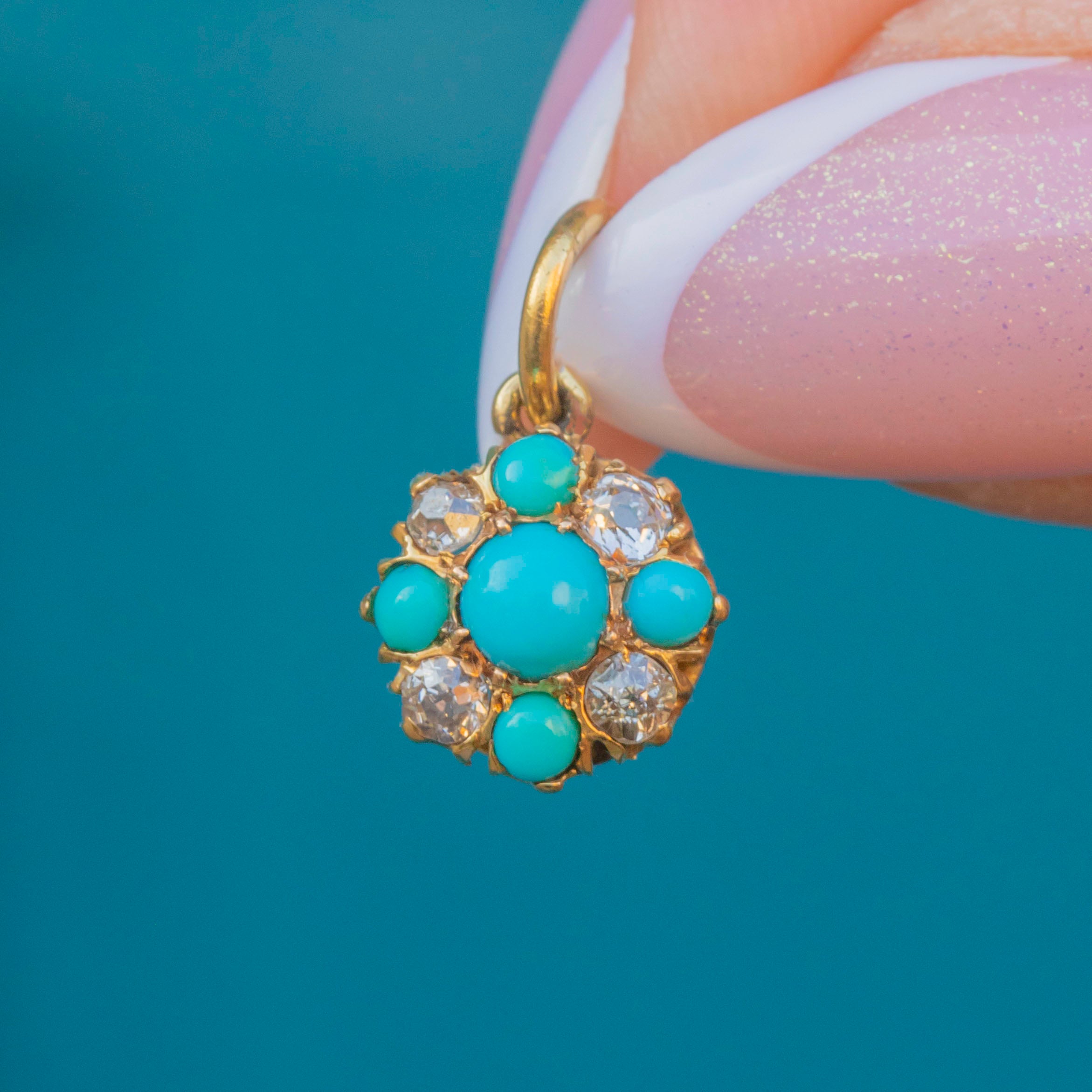 This antique 18ct Gold Turquoise Diamond cluster charm is the perfect dainty treasure! Alternating duck egg blue Turquoise cabochons and contrasting scintillating Diamonds form the eye-catching cluster, which glistens and sparkles under the light.