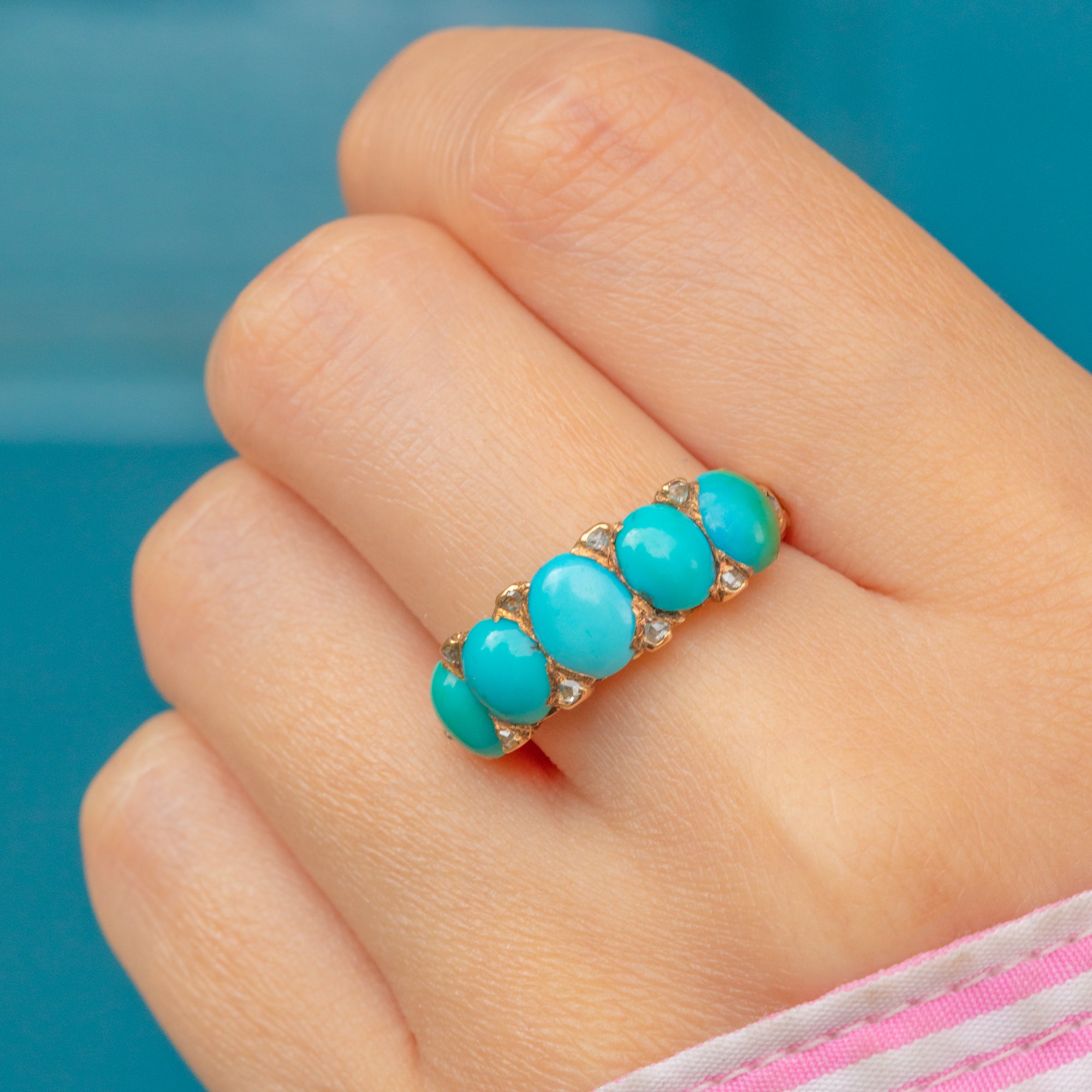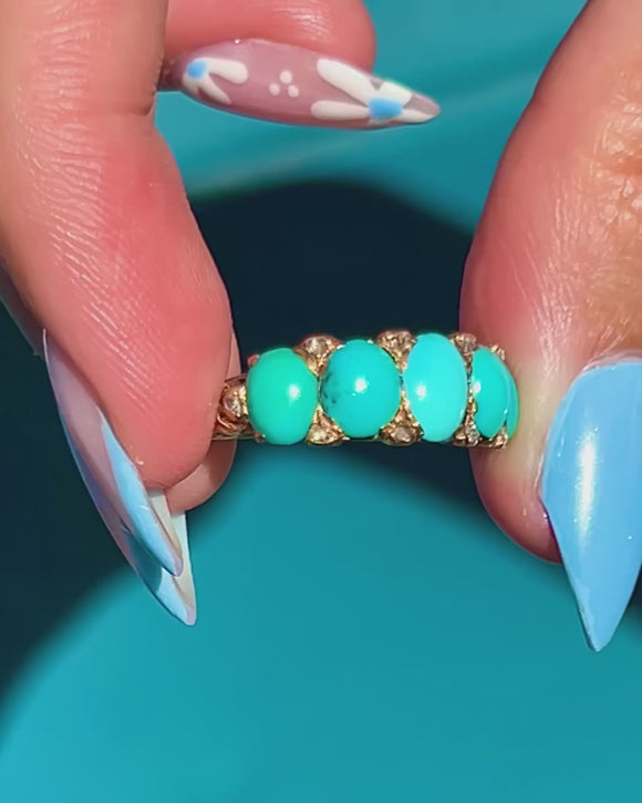 A striking Victorian Turquoise ring, with rose-cut Diamond spacers for added sparkle. A classic Victorian combination, this 18ct Gold ring provides the finger with great coverage due to its half-hoop design.
