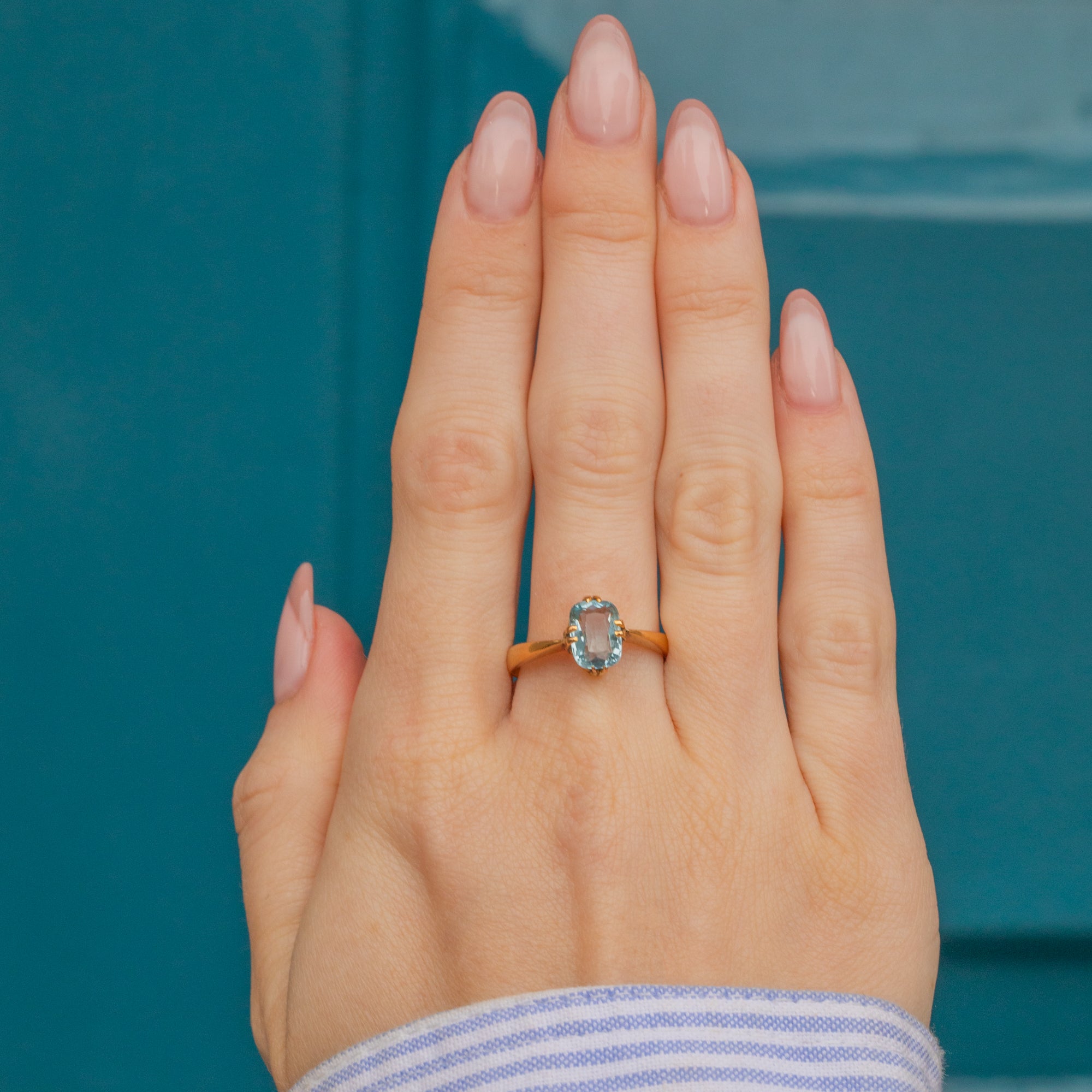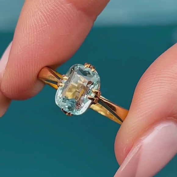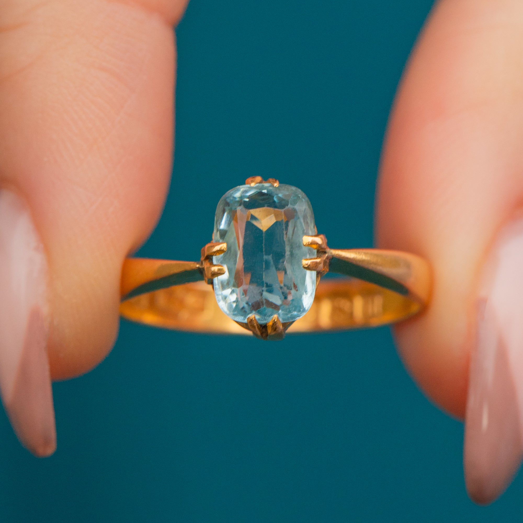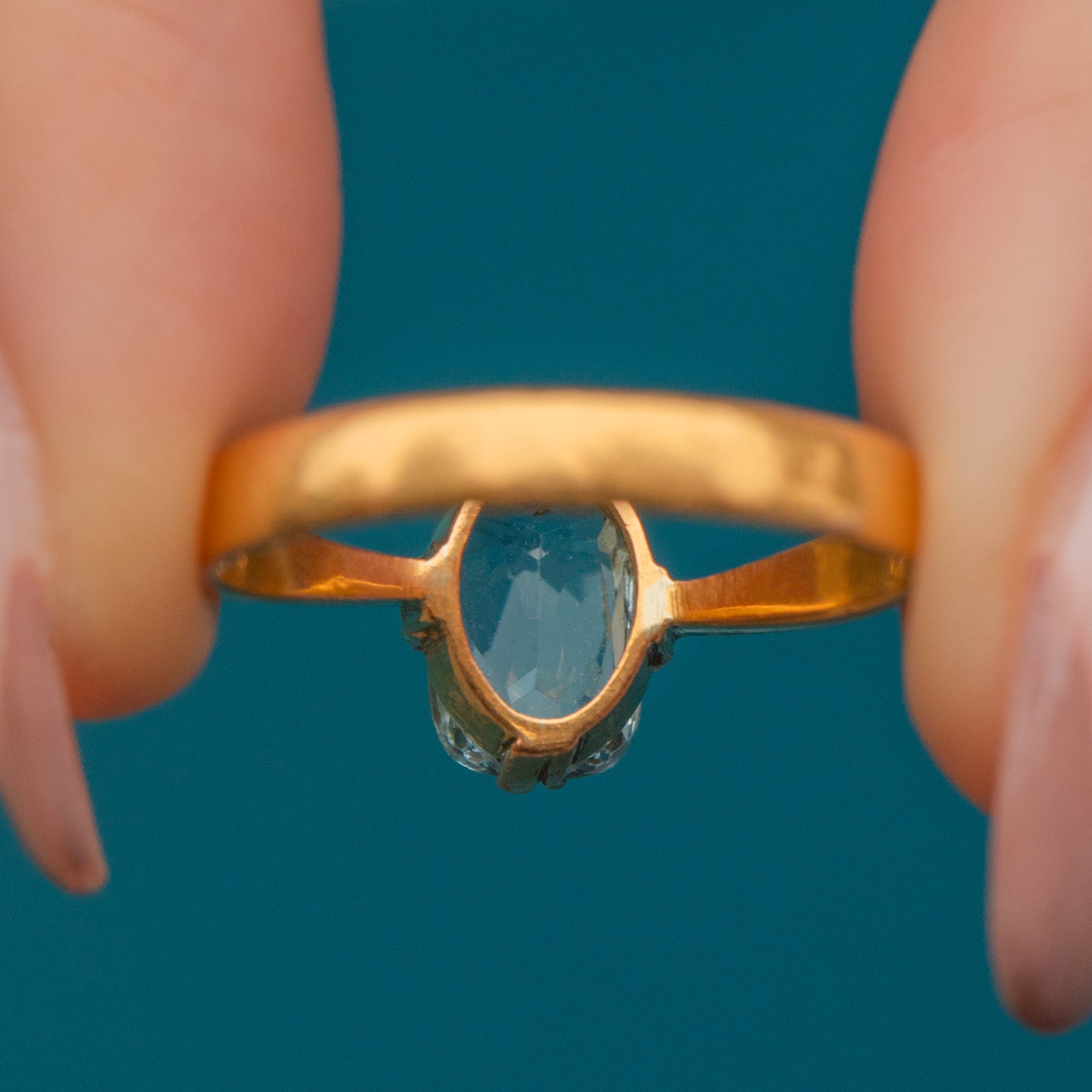 VERY GOOD-EXCELLENT. This antique 22ct Gold Aquamarine solitaire ring is in wonderful condition. The Gold is sumptuous with an even saturation throughout, with only minor age-related wear on the back of the band. The Aquamarine is pristine, with no chips or abrasions, and is secure within its claw settings. One of the double claws appears to have been previously repaired, but this is only noticeable under close inspection and has been carried out very well. The full set of hallmarks are chunky and easy to read, dating this exquisite antique Aquamarine ring to 1911.