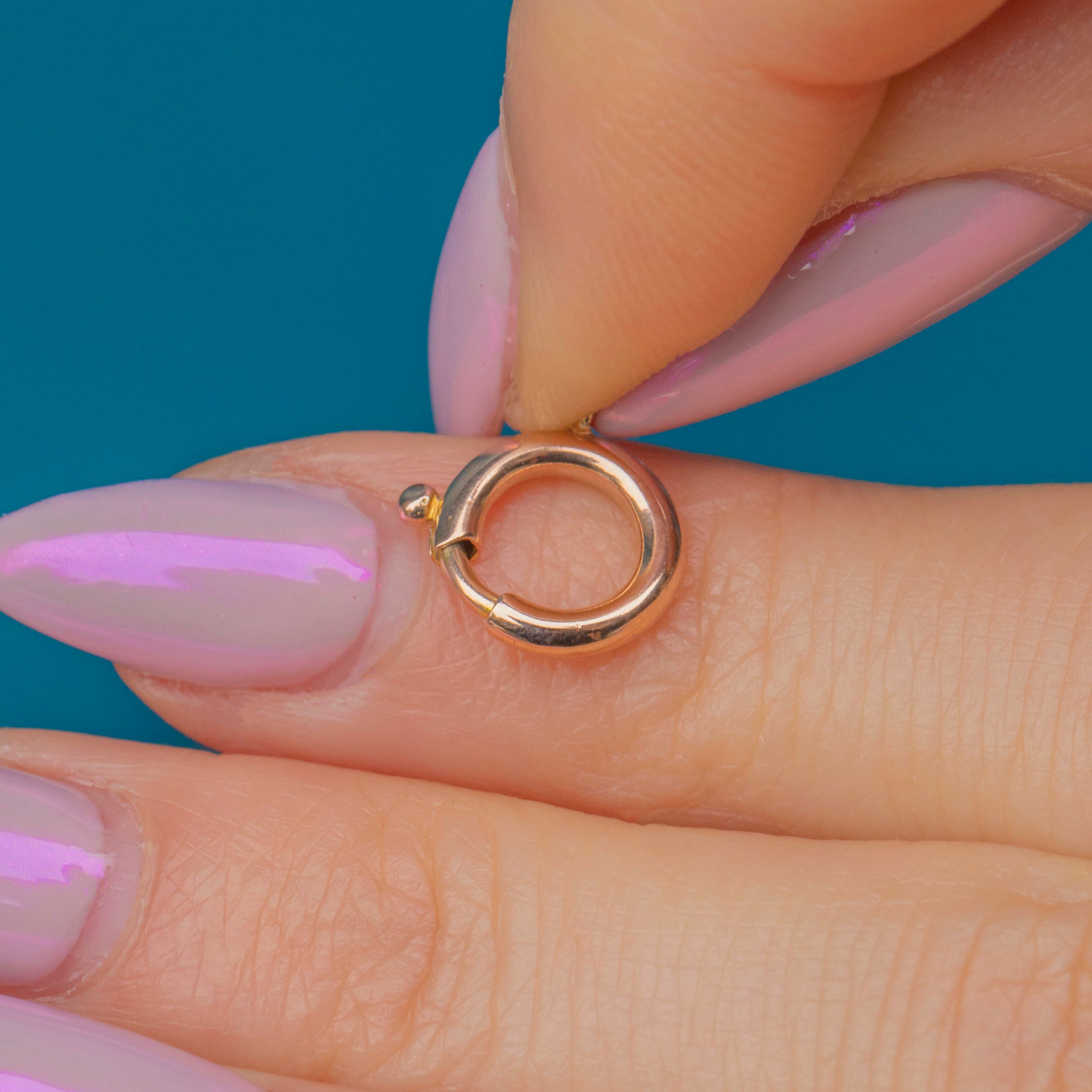 A lovely Antique Victorian bolt-ring crafted in solid 9ct Gold. Compact and beautifully made, this versatile piece is perfect for attaching charms, pendants, or fobs to your favourite antique chain.