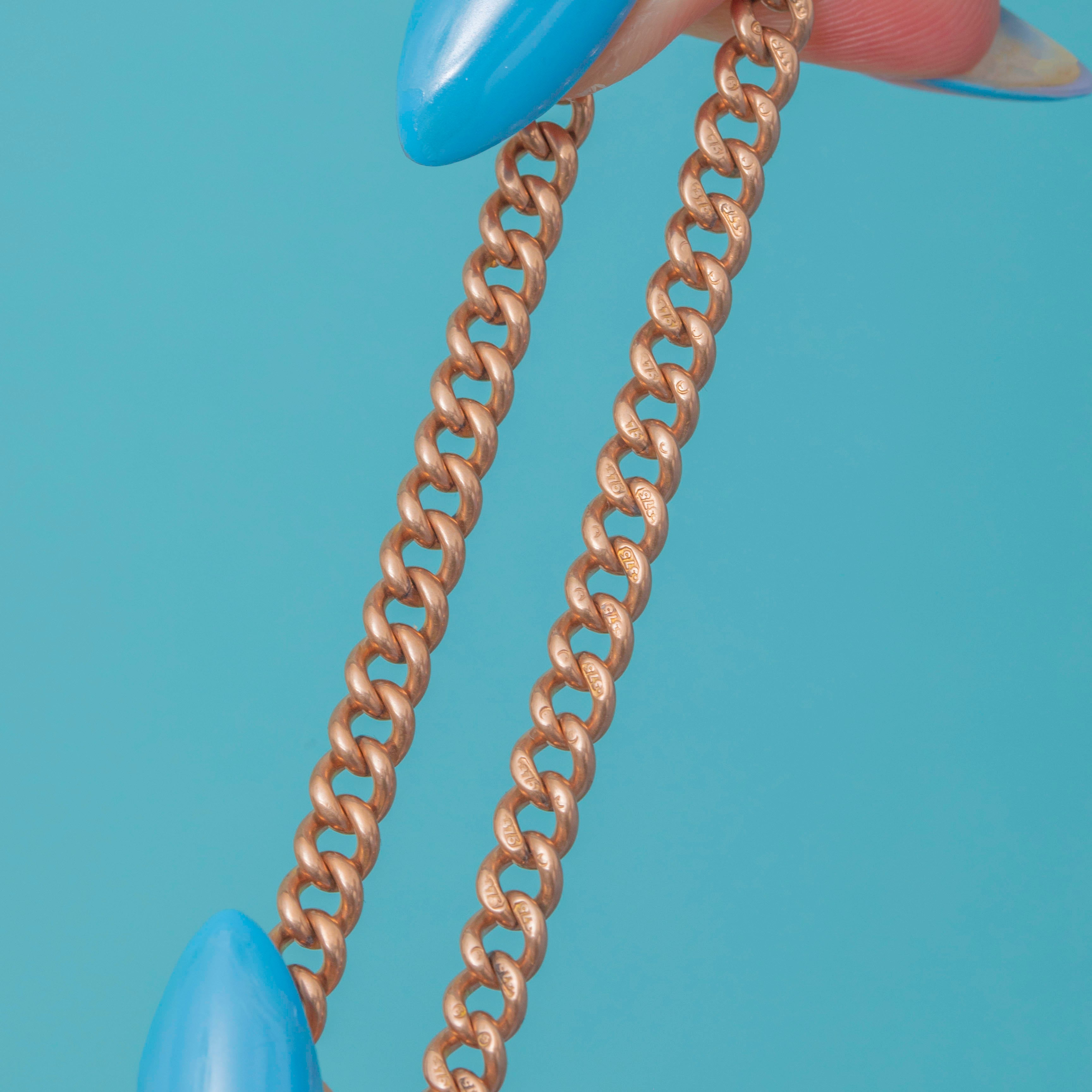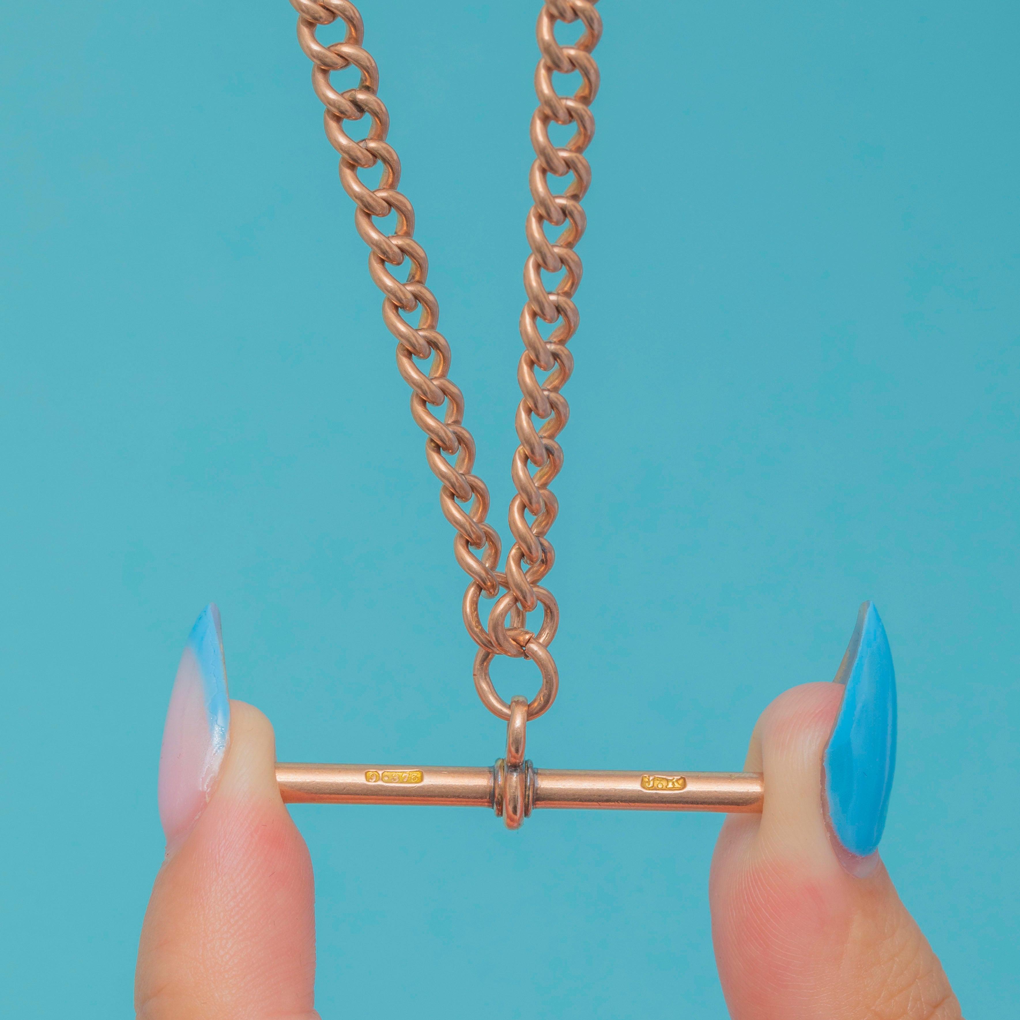 Crafted from 30 grams of solid rosy 9ct Gold, this chunky Victorian Albert chain has antique stamps on every link authenticating its high-end craftsmanship; it embodies antique charm and decadence!