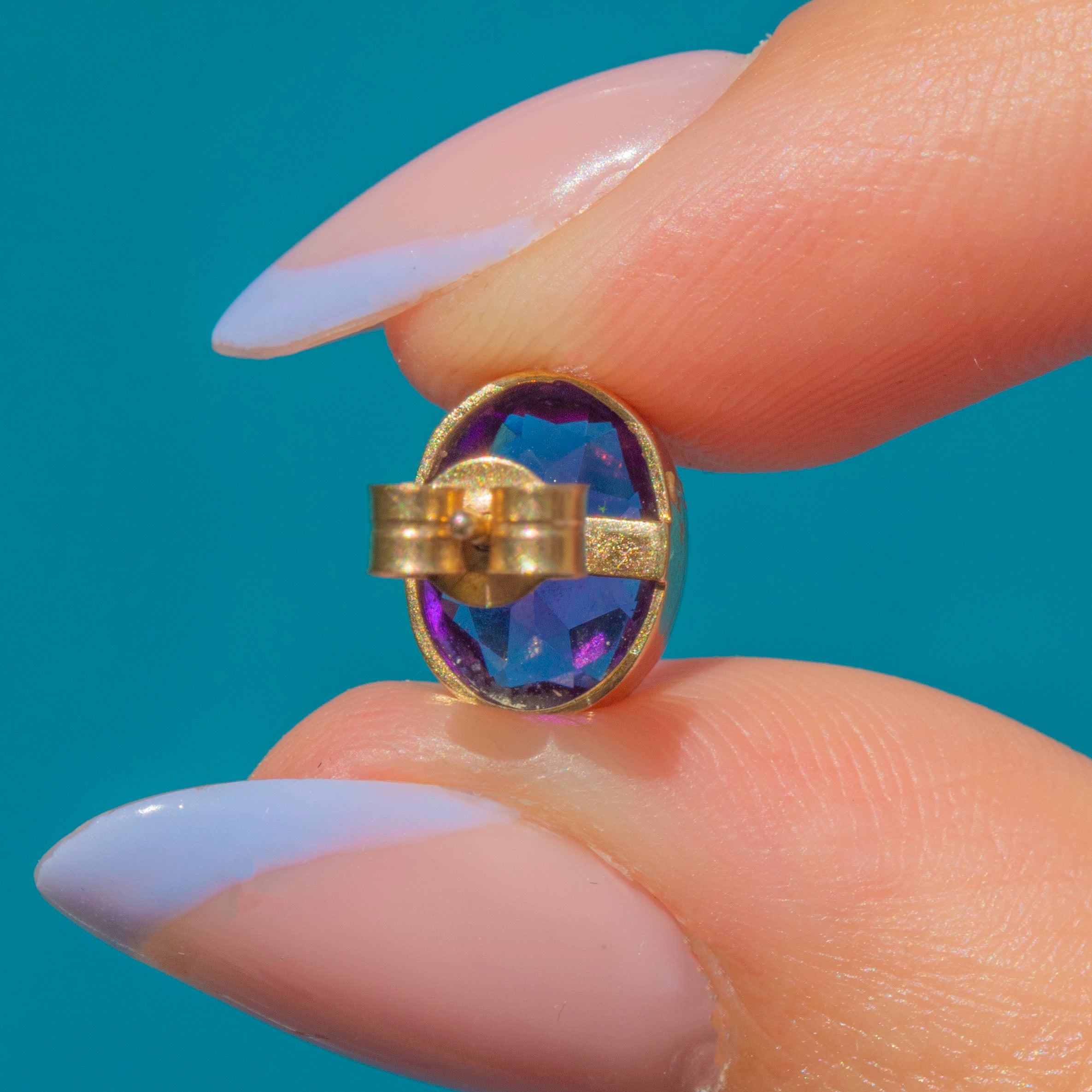 VERY GOOD-EXCELLENT: These antique 9ct Gold Amethyst bezel-set stud earrings are in wonderful condition. The Amethysts have a deeply saturated hue and crisp facets that are free from chips or abrasions. The Gold is buttery and the bezels robust, with only minor surface wear commensurate with age. With secure posts and snug-fitting butterfly backs, you can enjoy wearing these antique Amethyst earrings with absolute confidence!