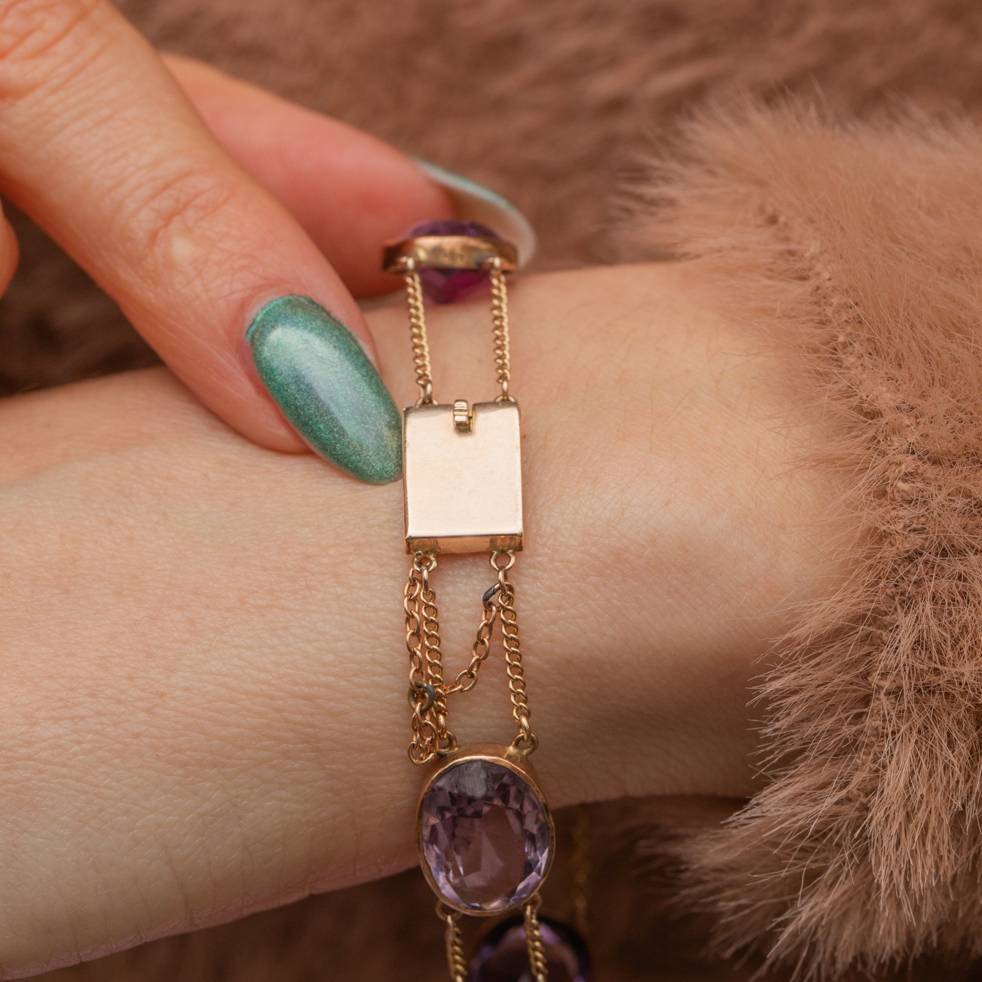 VERY GOOD. This antique 9ct Gold Amethyst bracelet is in very good condition. This bracelet has six lovely Amethysts that are all securely set, with a deep purple hue and only some minor surface abrasions visible on some of the stones. The Gold is buttery throughout, there are some solder marks visible from where the setting has been adjoined but this is merely aesthetic and only noticeabke under close inspection. The chain links are all secure with one replacement link on the safety chain from a previous repair. Each component is firmly affixed and the the tongue clasp is in perfect working condition proviidng you with a secure closure. This splendid Victorian bracelet will make a wonderful addition to your collection!