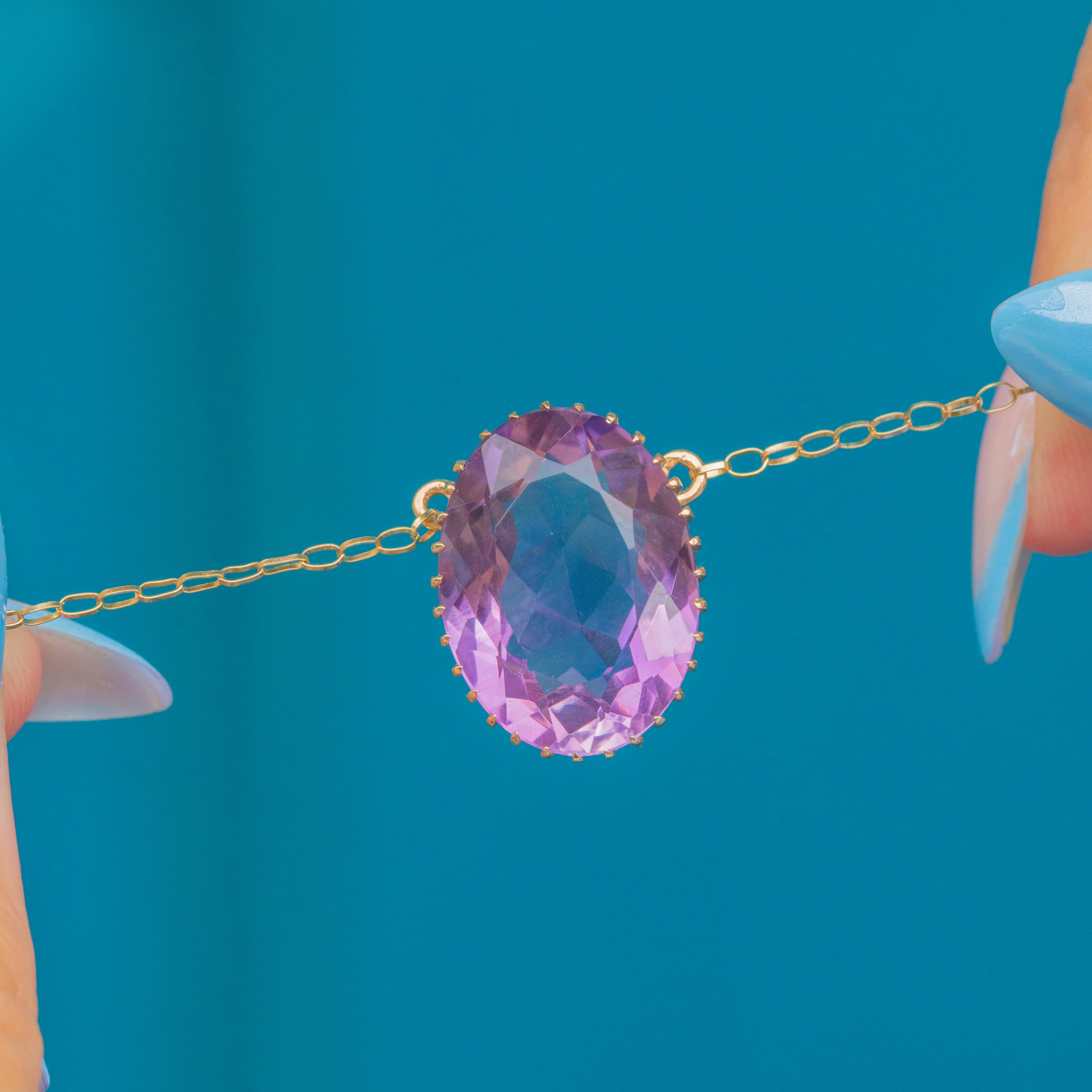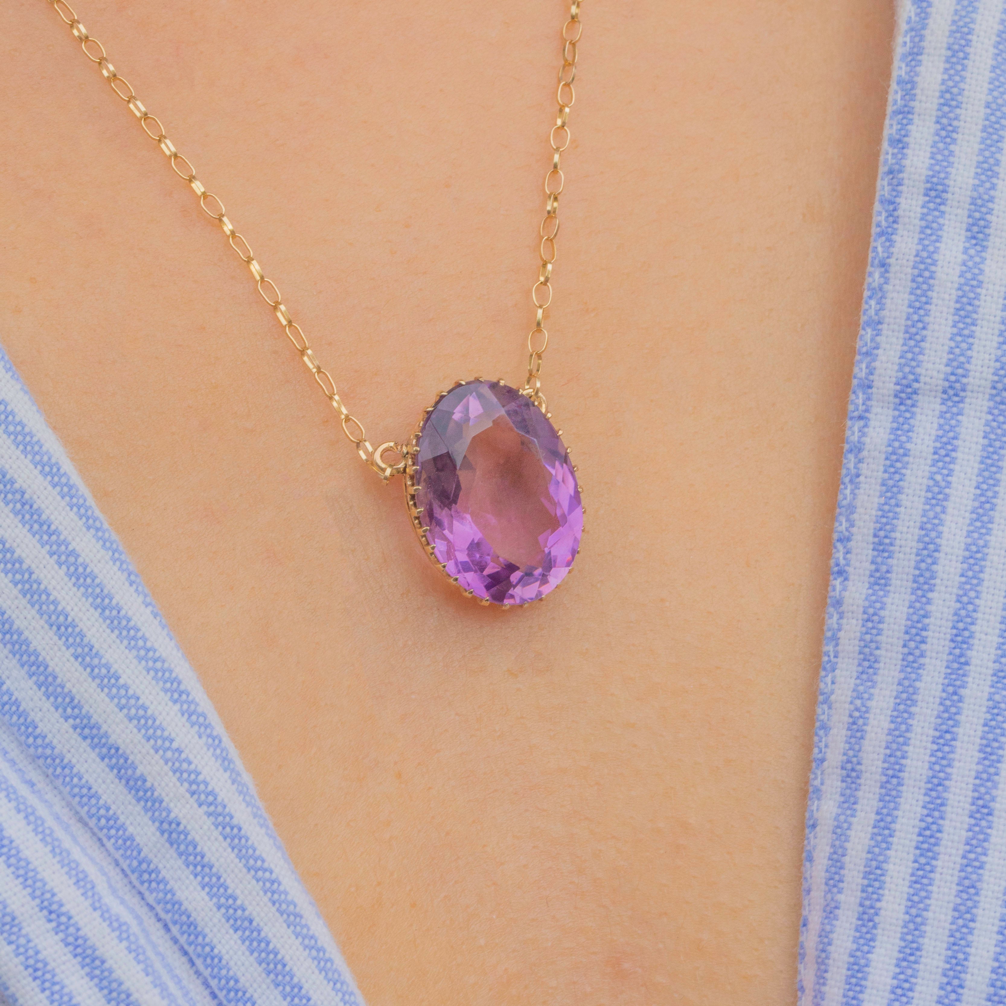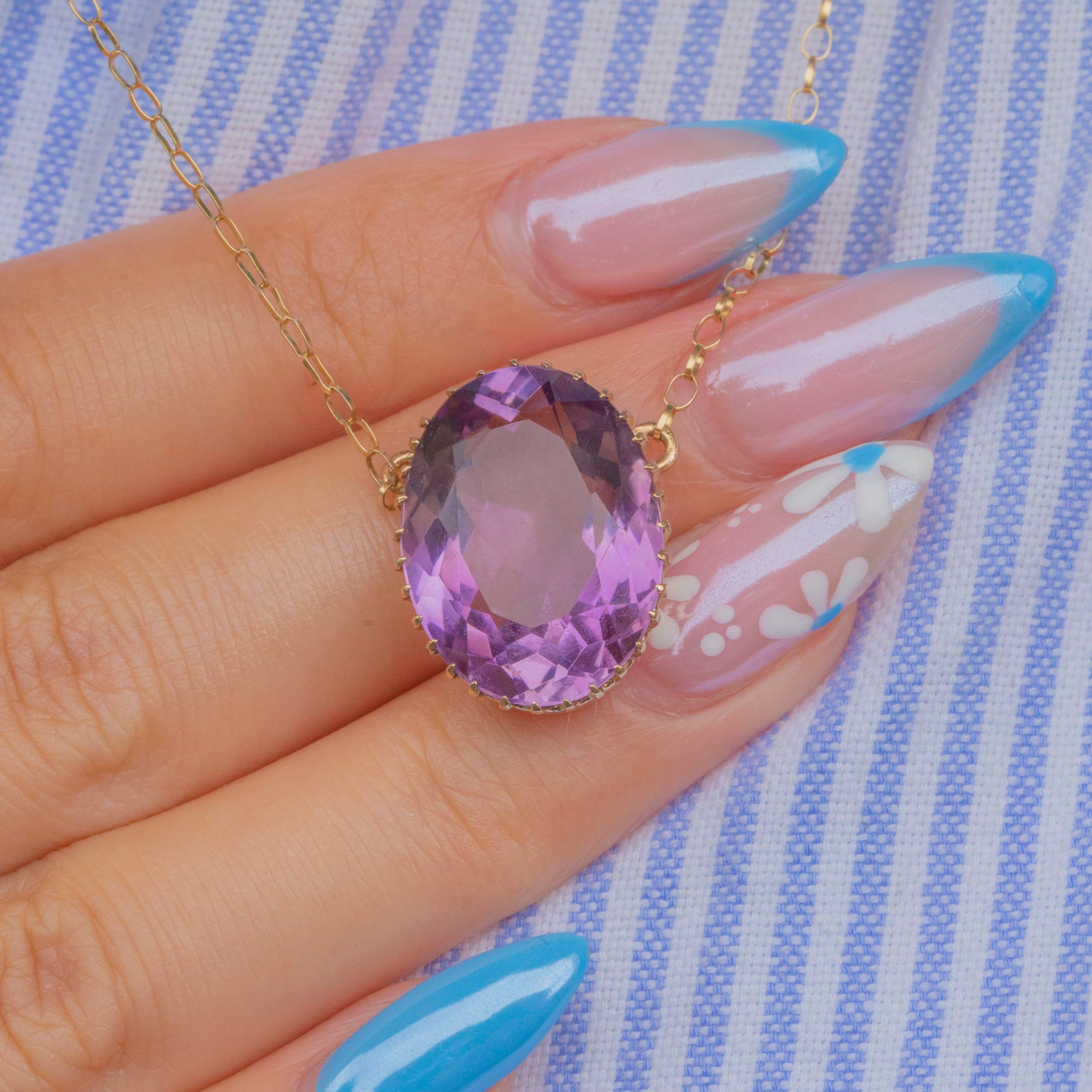 EXCELLENT: The Amethyst is secure in its claw settings and free from chips or abrasions. The chain links are all securely connected and the necklace closes with a bolt ring clasp for secure wear!