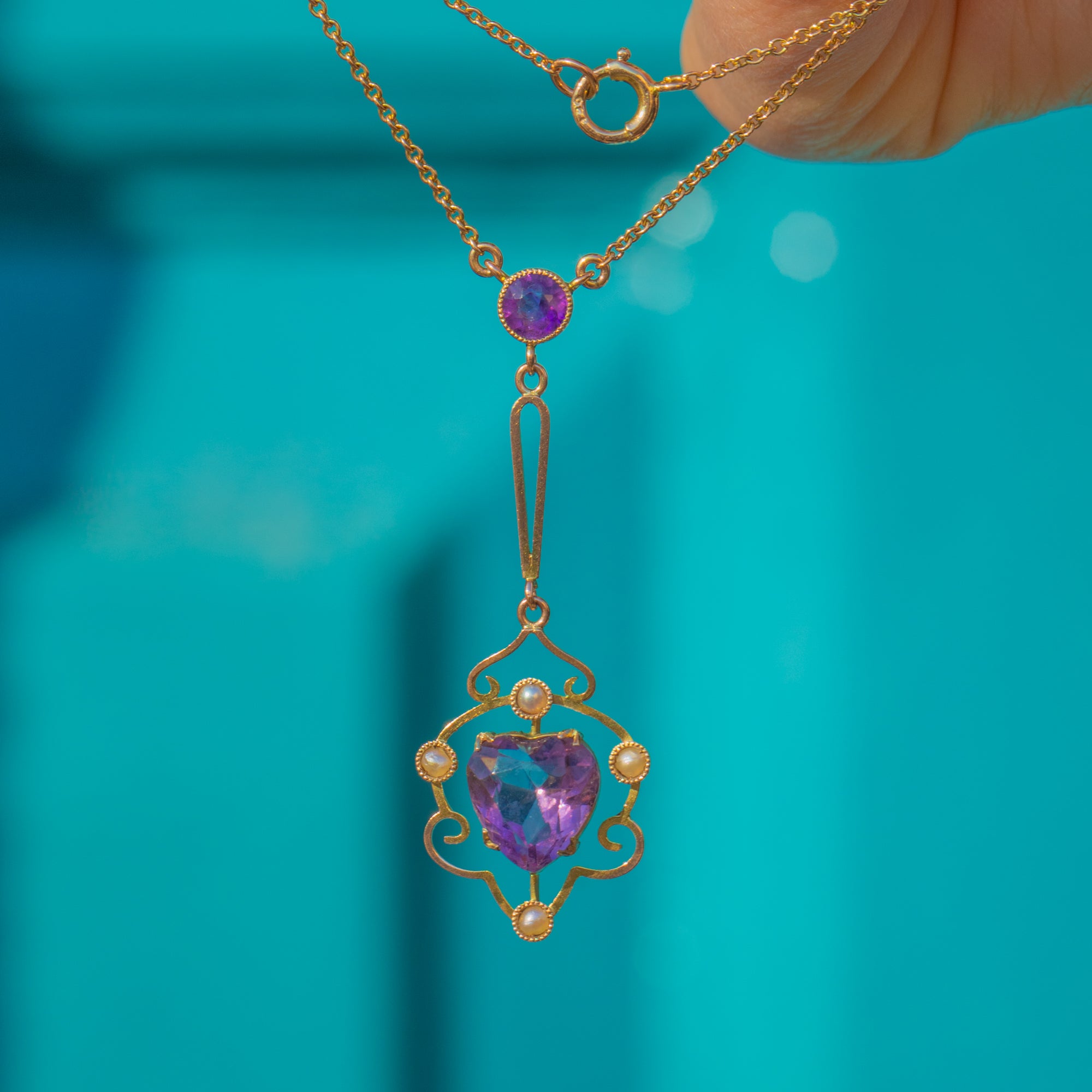 Antique 9ct Gold Amethyst Pearl Heart Necklace, 2.10ct