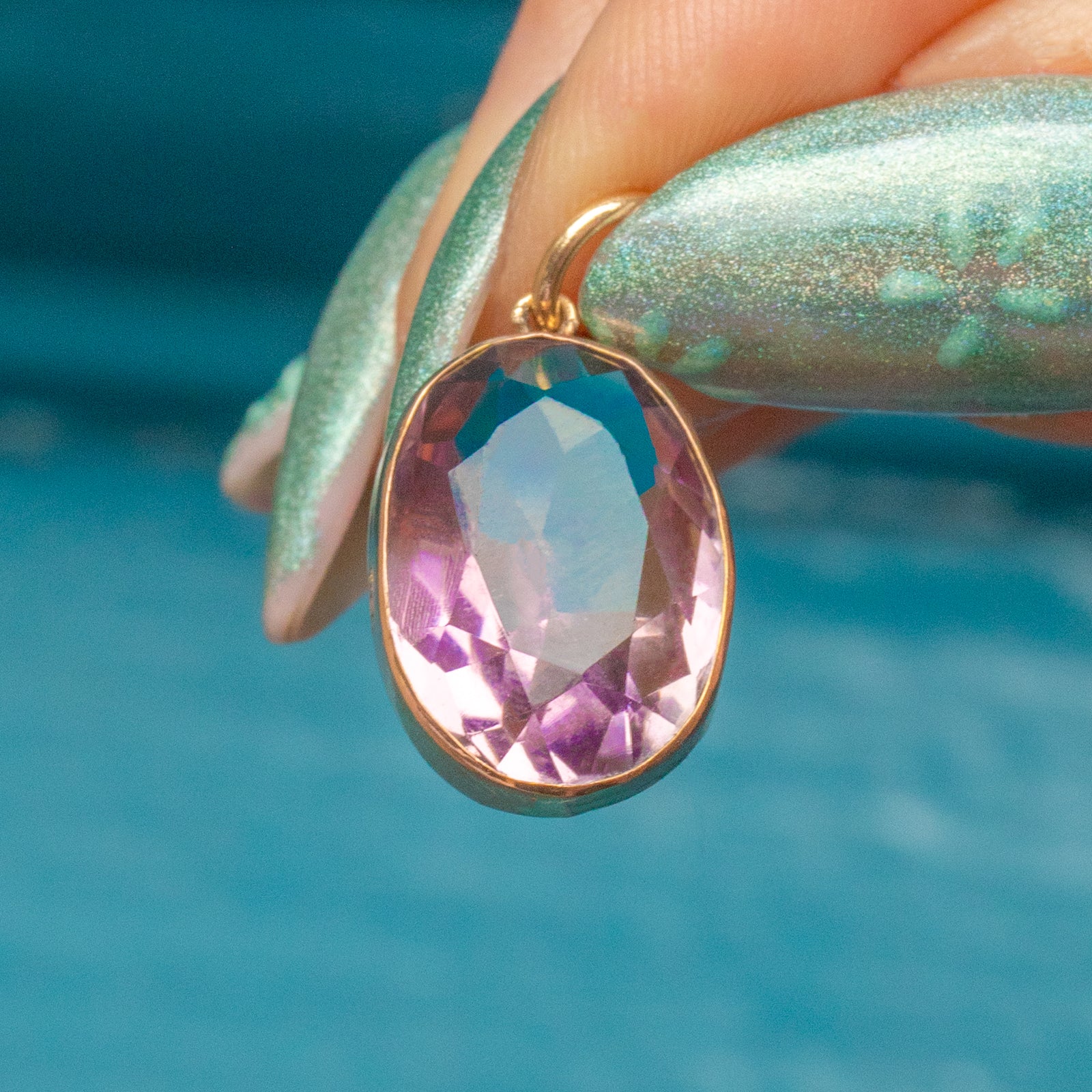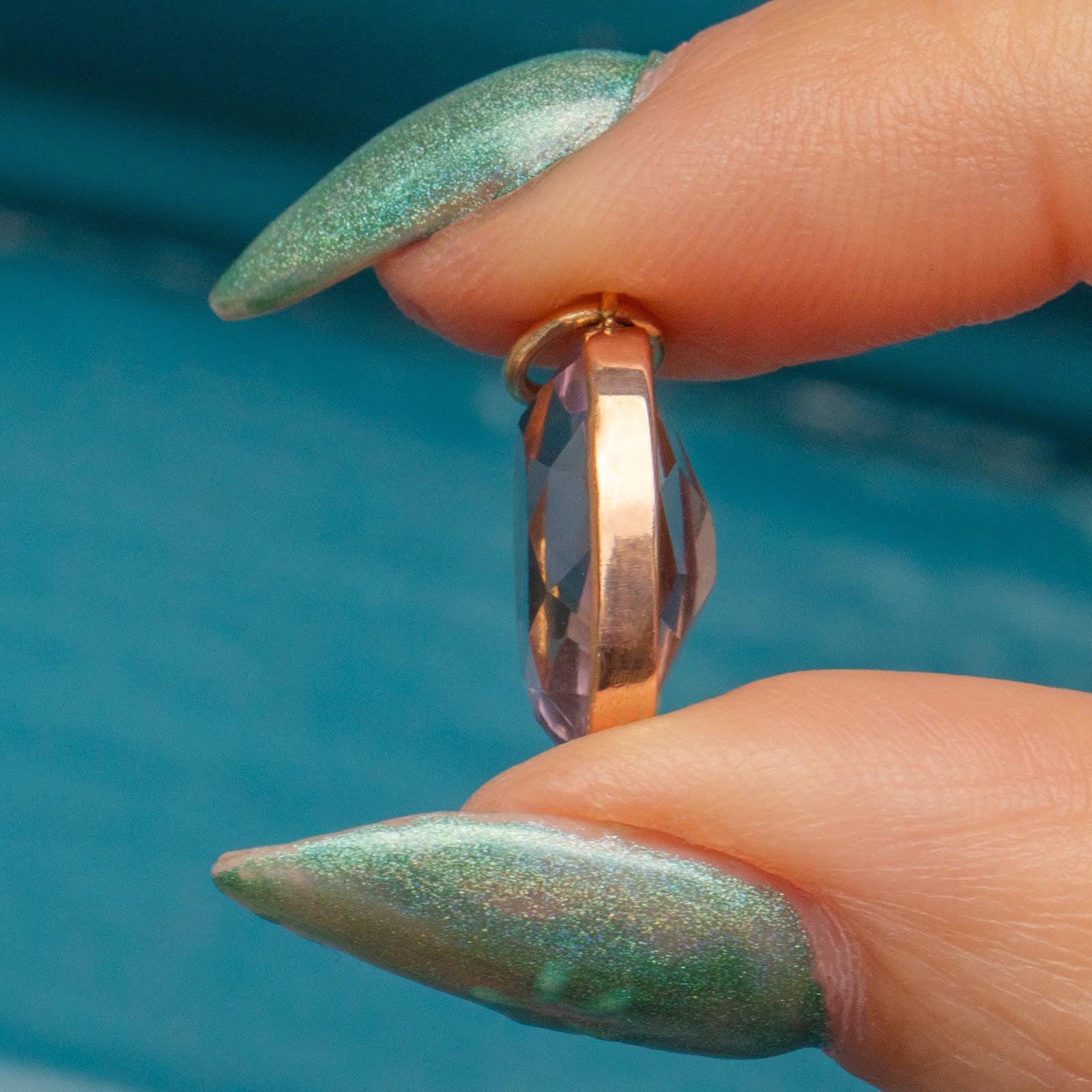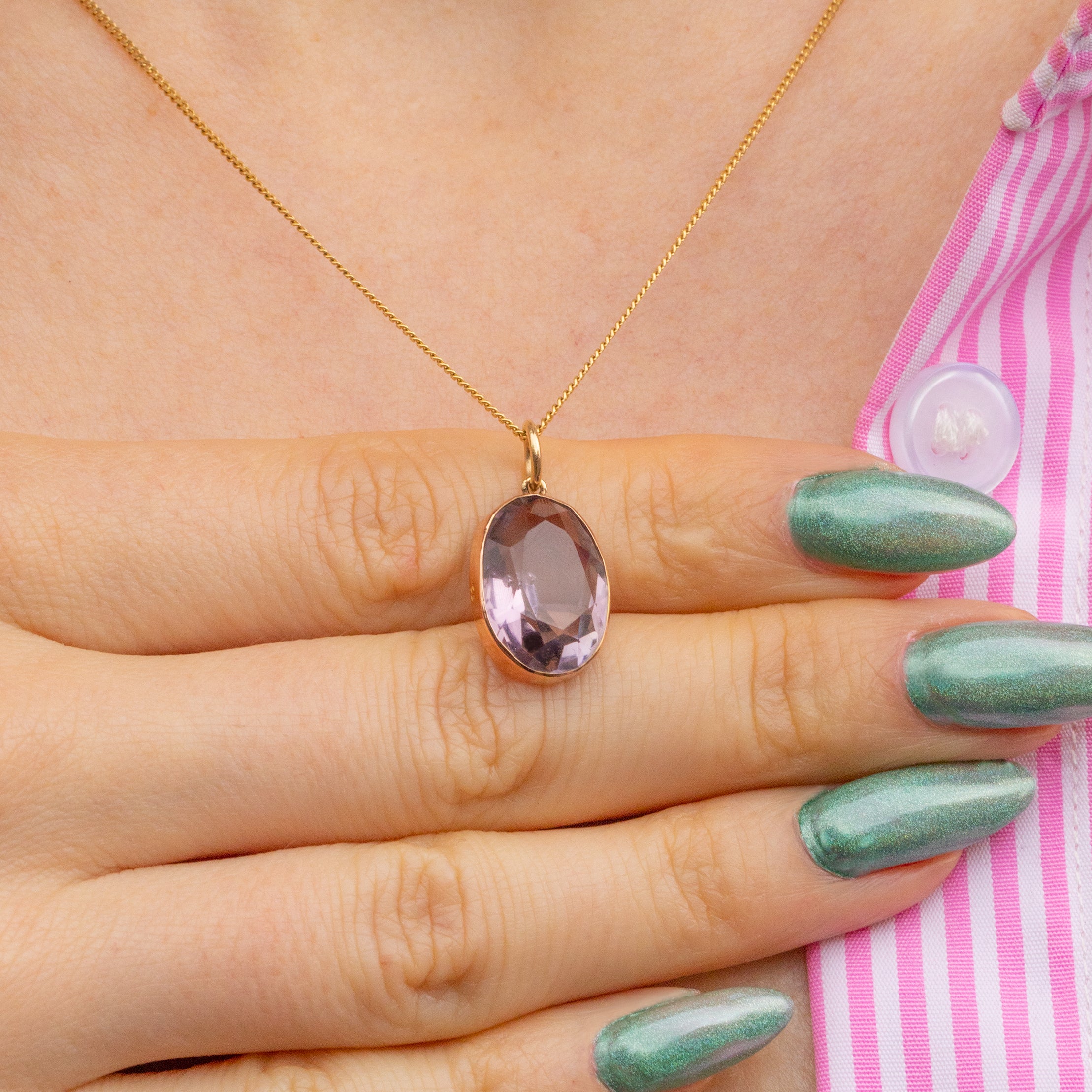 We can smell the lavender just by looking at this antique 9ct Gold Amethyst pendant! Lilac hues dance between her fabulously faceted form, perfect for bringing a soft pop of colour to any attire.