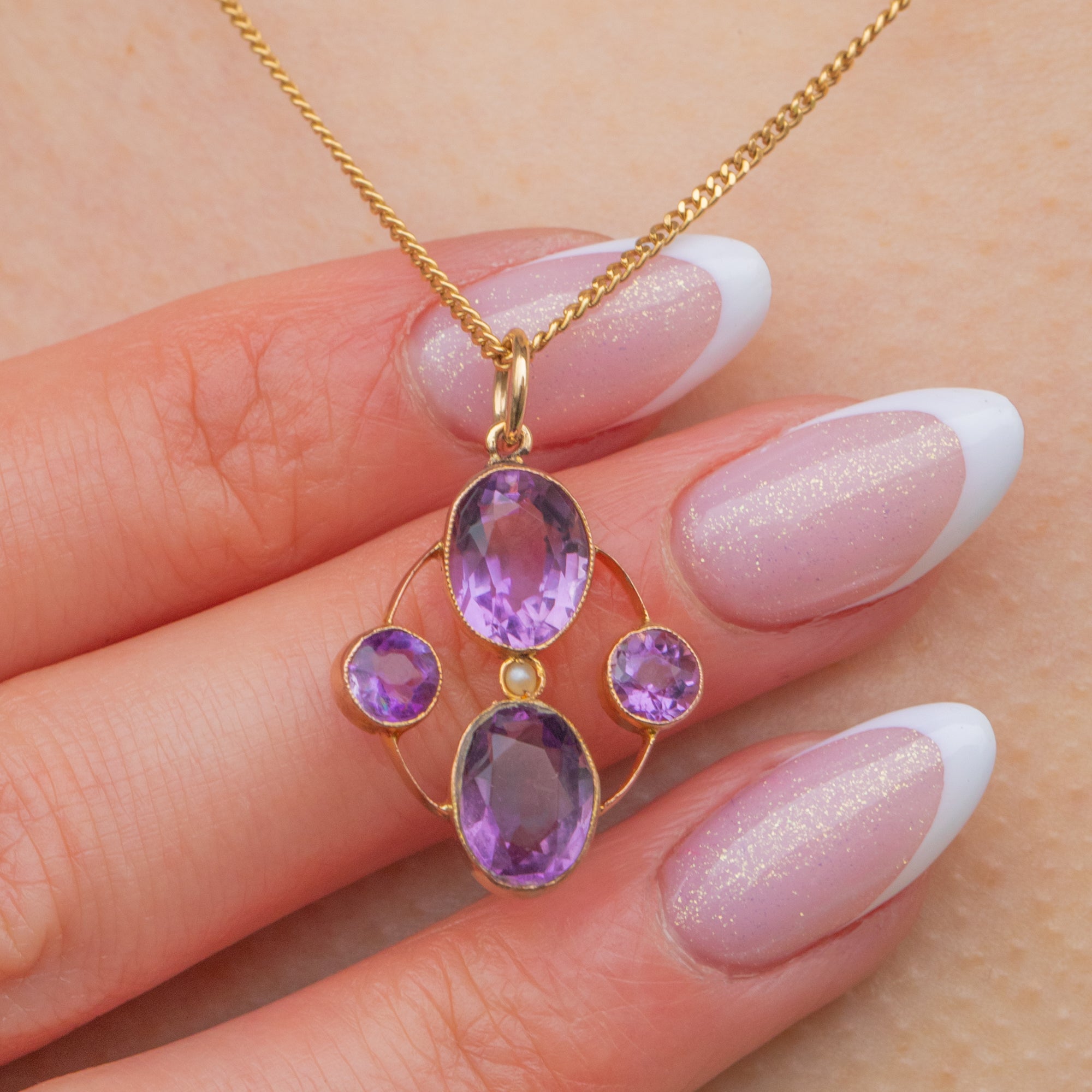 MATERIALS: Tests as 9ct Gold, Amethysts, Seed Pearl