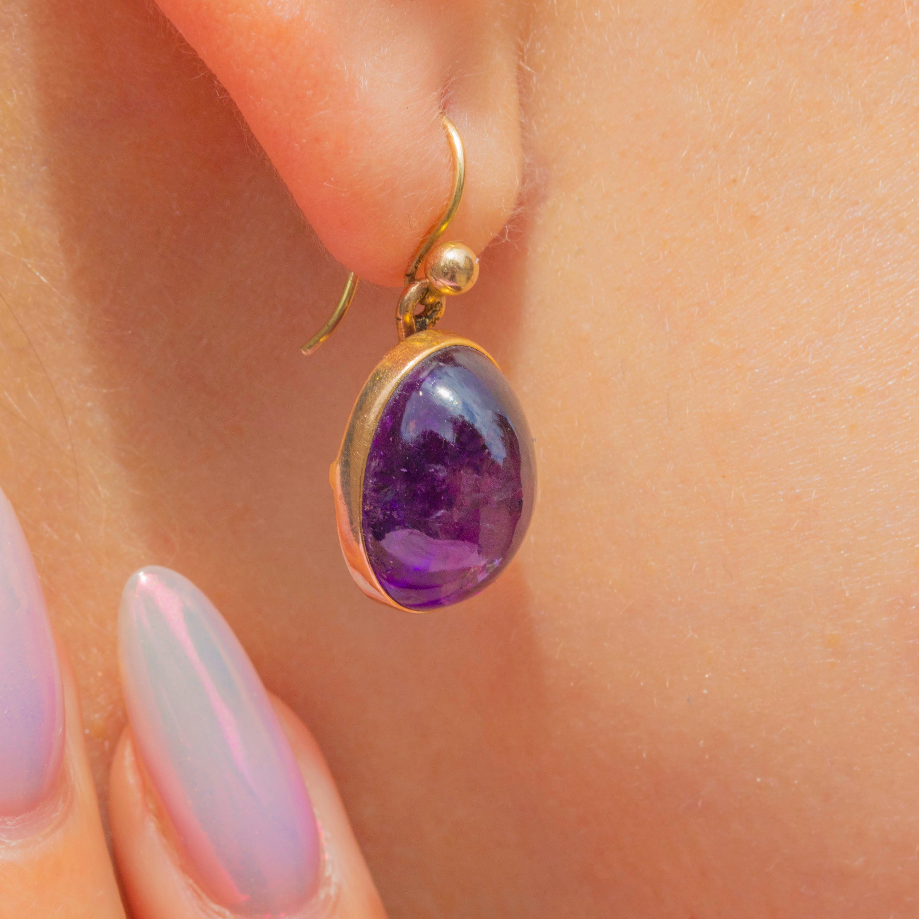 Each Amethyst has been cut into a striking sugarloaf cabochon, with its glossy domed profile radiating saturated deep Royal purple hues. Hugged by sumptuous 9ct Gold bezels and dancing with movement as they suspend from matching hooks, these Art Deco earrings are a colourful delight!