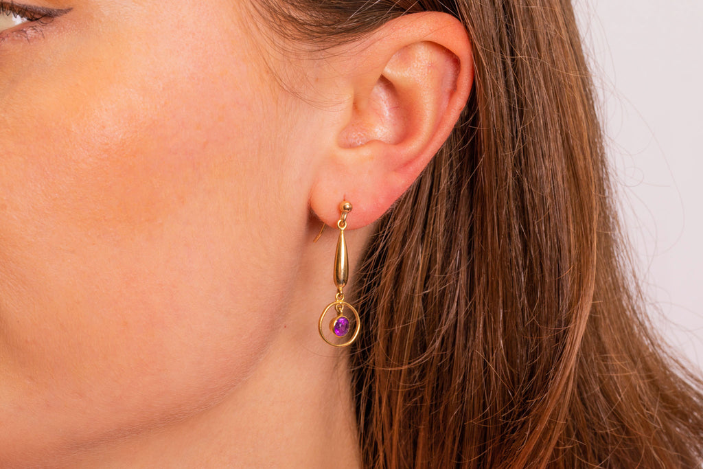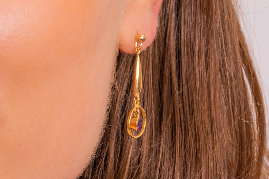 The most delightful pair of antique 9ct Gold Amethyst target drop earrings! Poised at the bottom of these lovely ladies is a violet Amethyst encompassed by traditionally Edwardian 'target' design, orbiting around their settings.