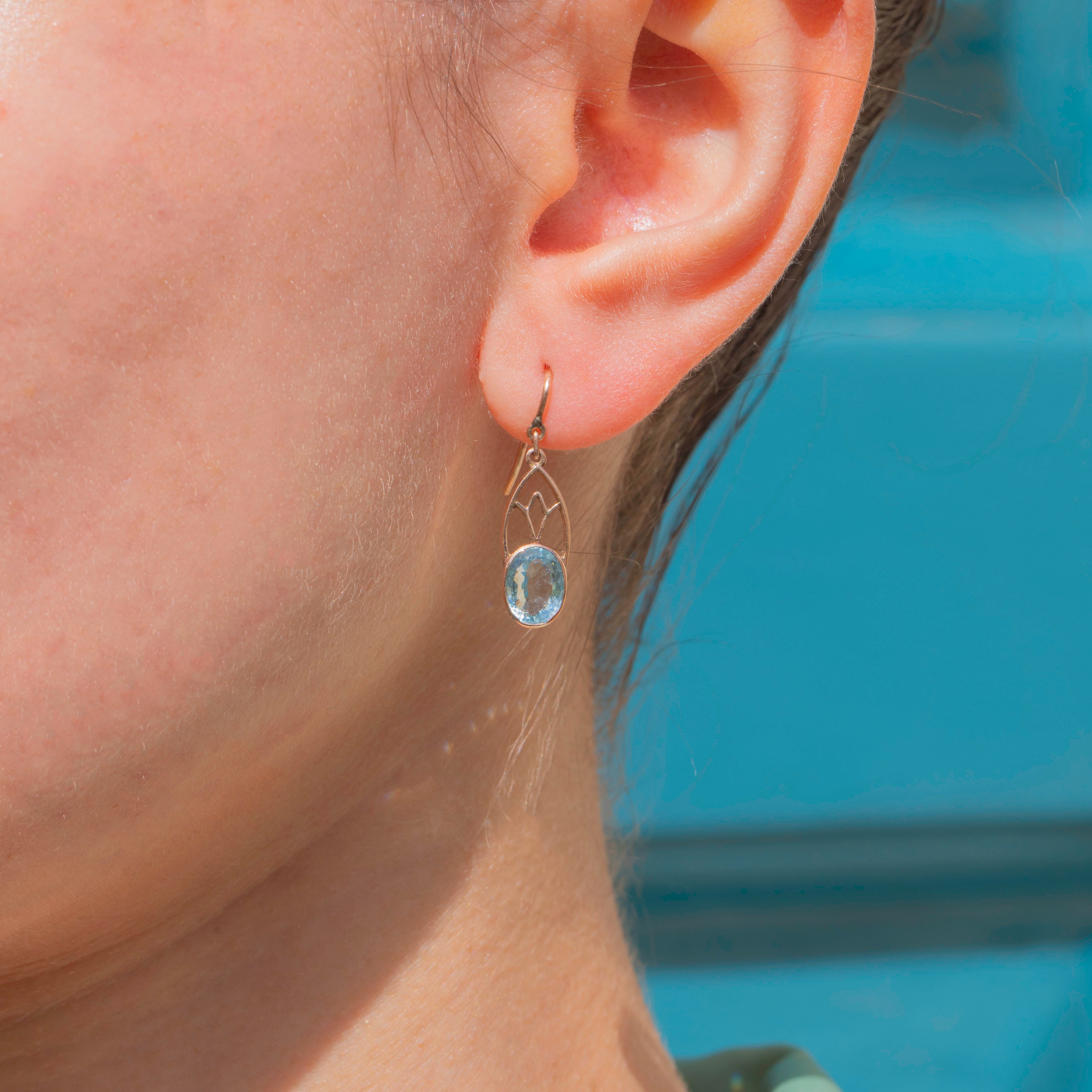 A sweet pair of antique 9ct Gold Aquamarine drop earrings, flaunting glacial hues that twinkle beneath the light.