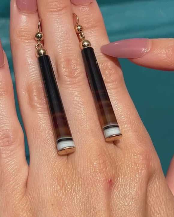 These striking antique 9ct Gold banded Agate drop earrings will add a unique flare to your lobes! This eye-catching pair frames the face beautifully, with their elongated forms bringing refinement and movement to any outfit.