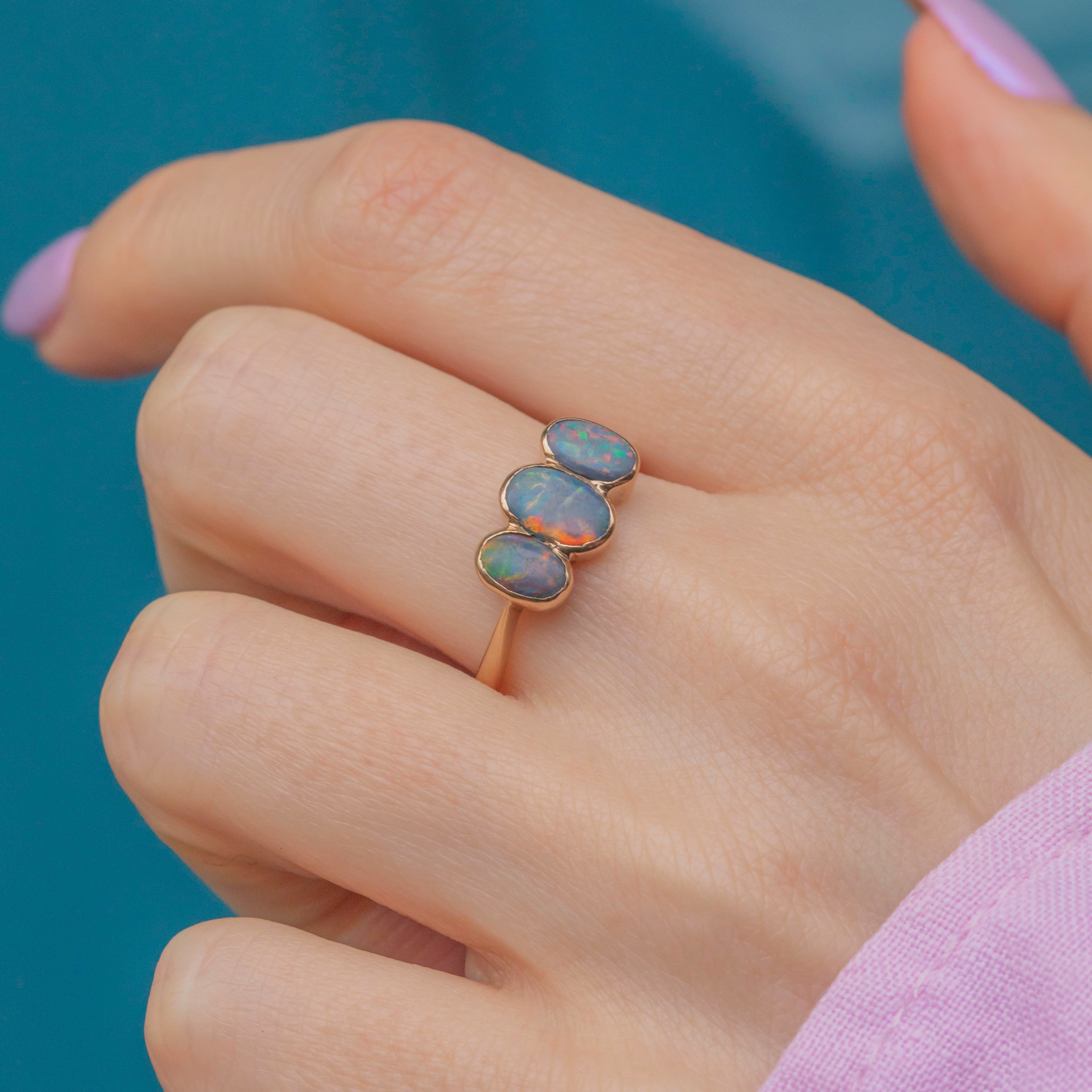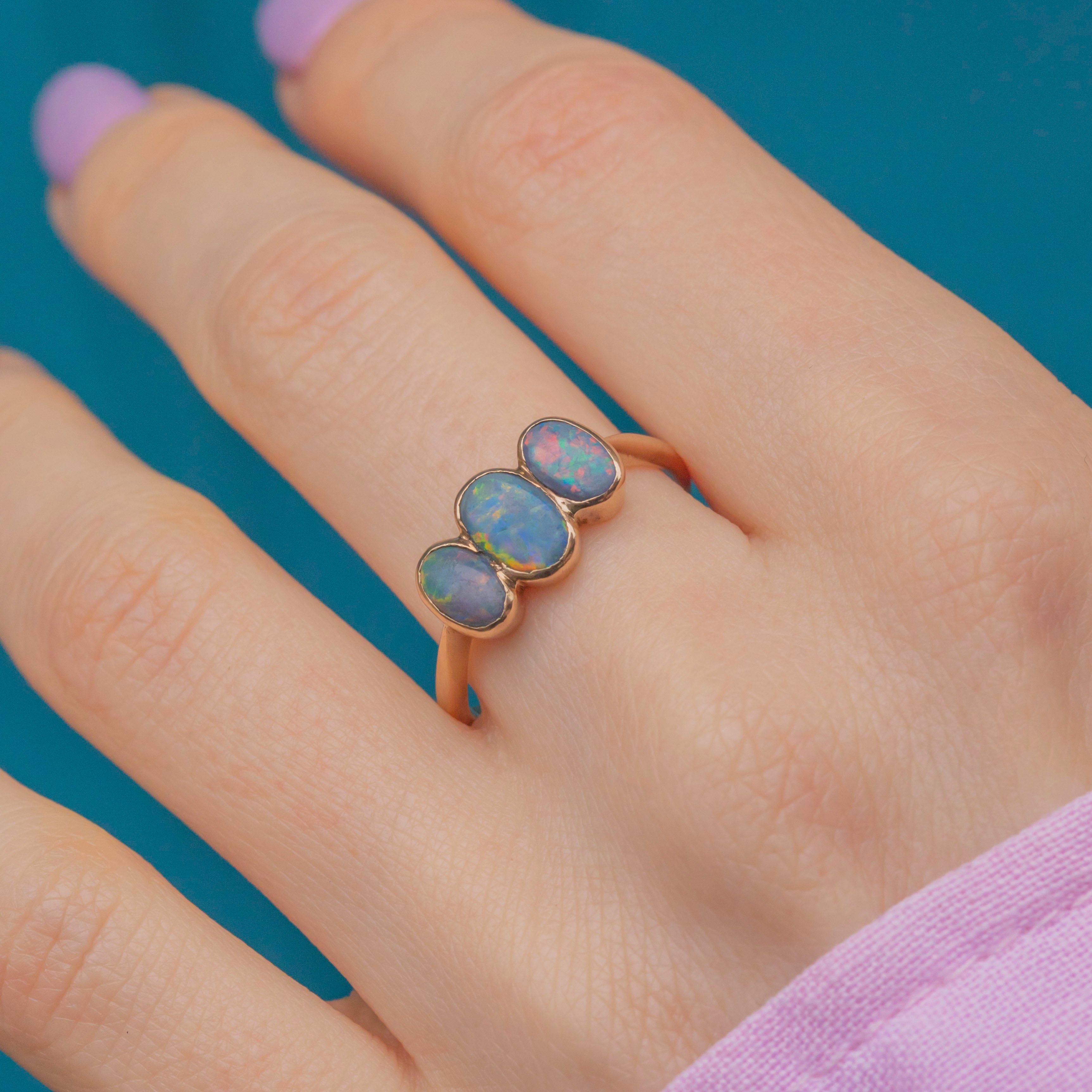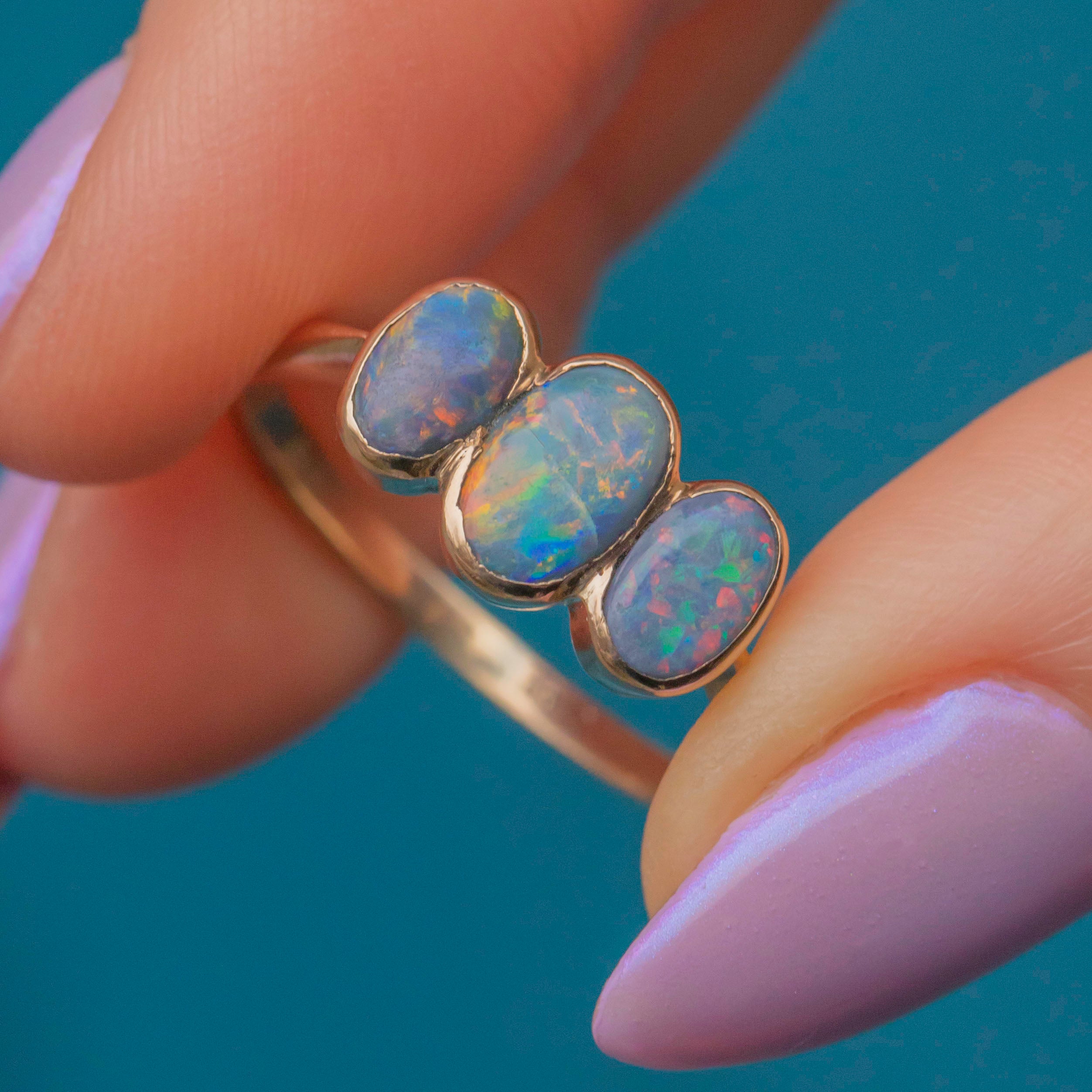 This exquisite antique 9ct Gold Black Opal three stone ring is a timeless treasure, showcasing three mesmerising Black Opals set in warm 9ct Gold. Each Opal shimmers with a captivating play of colour, displaying galactic flashes of deep blues, rich greens, fiery reds, and hints of violet as they catch the light.