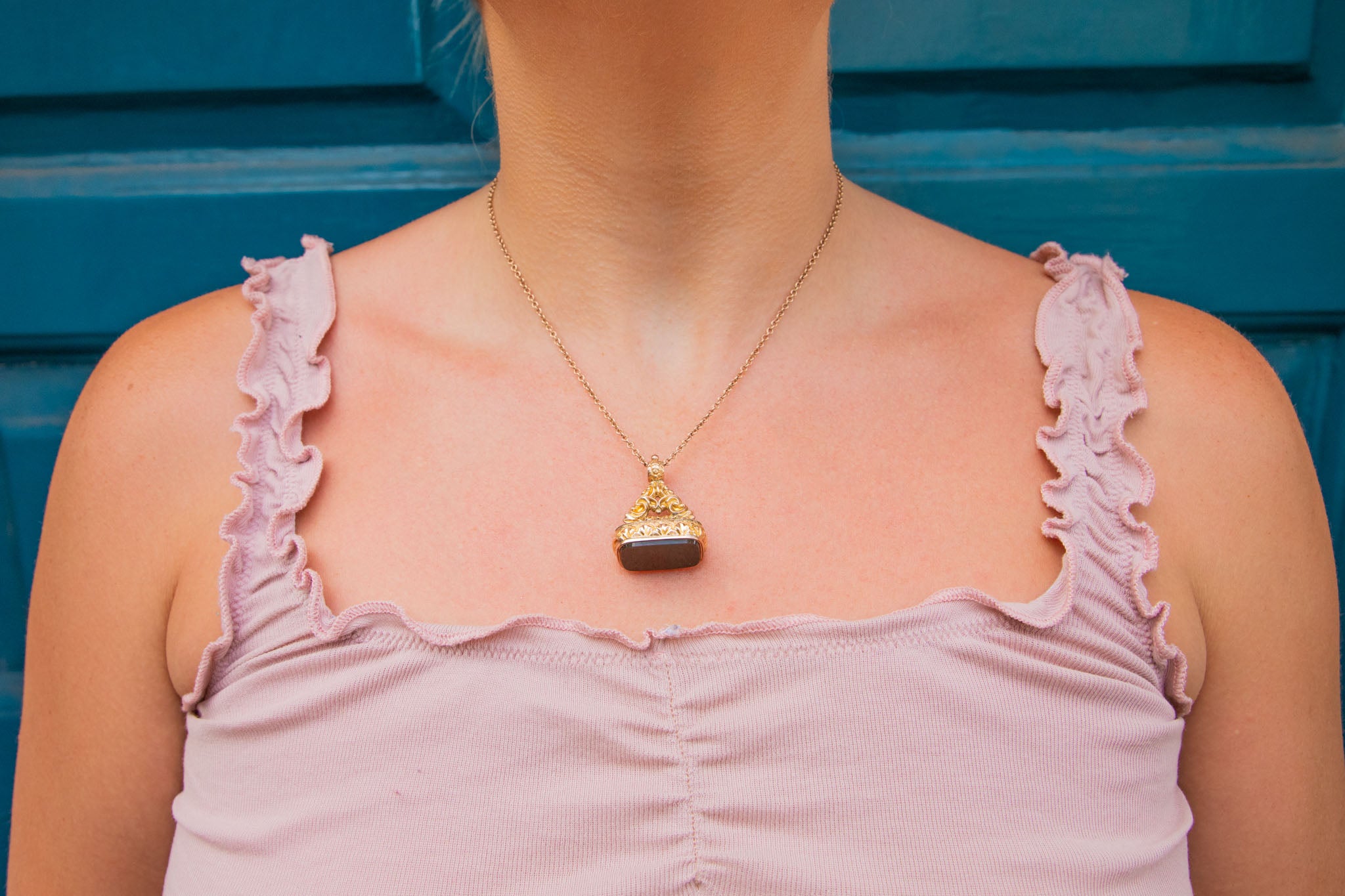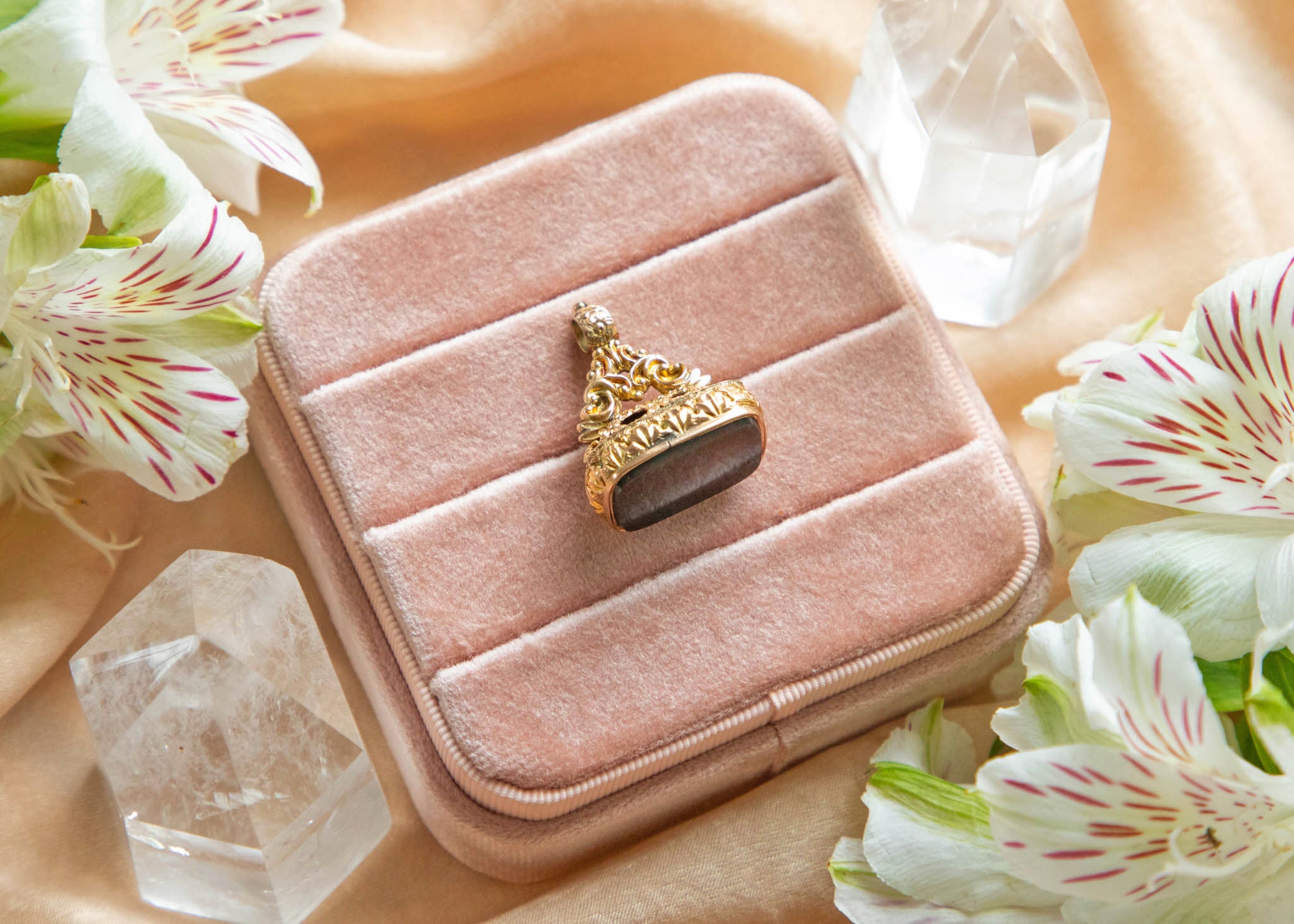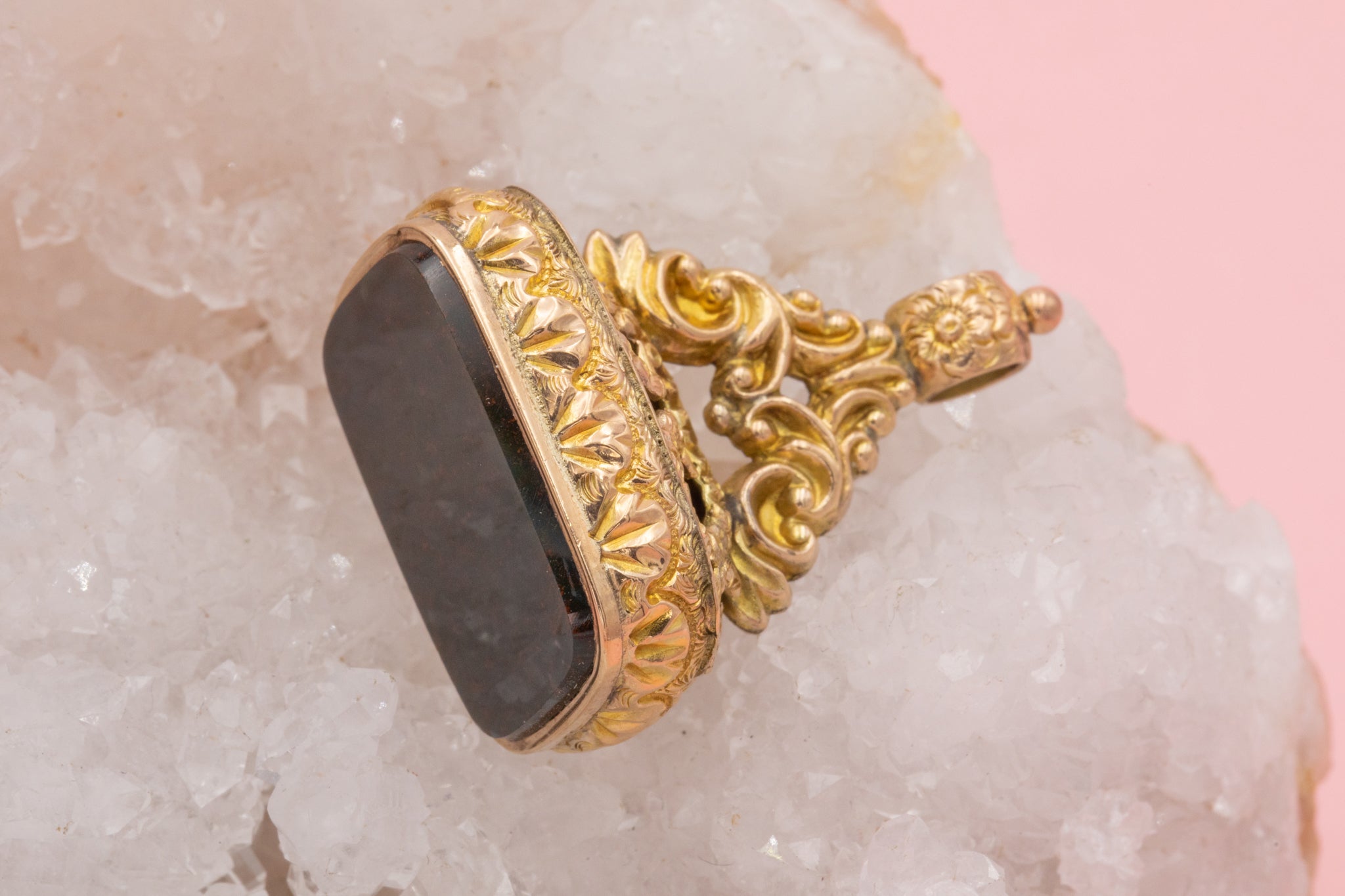 This antique 9ct Gold Bloodstone fob pendant has the most regal aura! Every inch of her radiant Gold casing is adorned with charming engravings and her inky Bloodstone boasts delicious blood-red speckles.