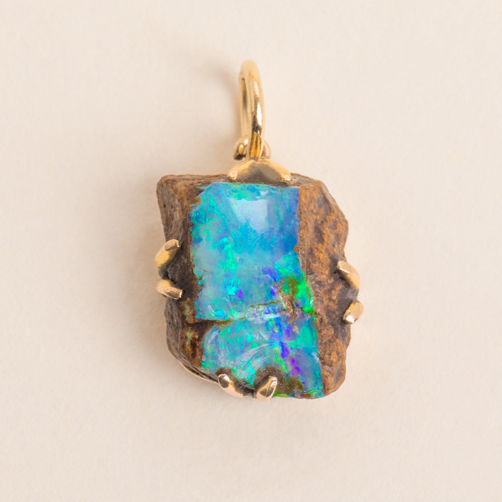 This antique 9ct Gold Boulder Opal pendant boasts natural charm, exuding the radiance of Goddess Gaia! The organically cut boulder Opal has an enchanting strip of shimmering electric blue and lime green running down its centre, which glimmers under the light.