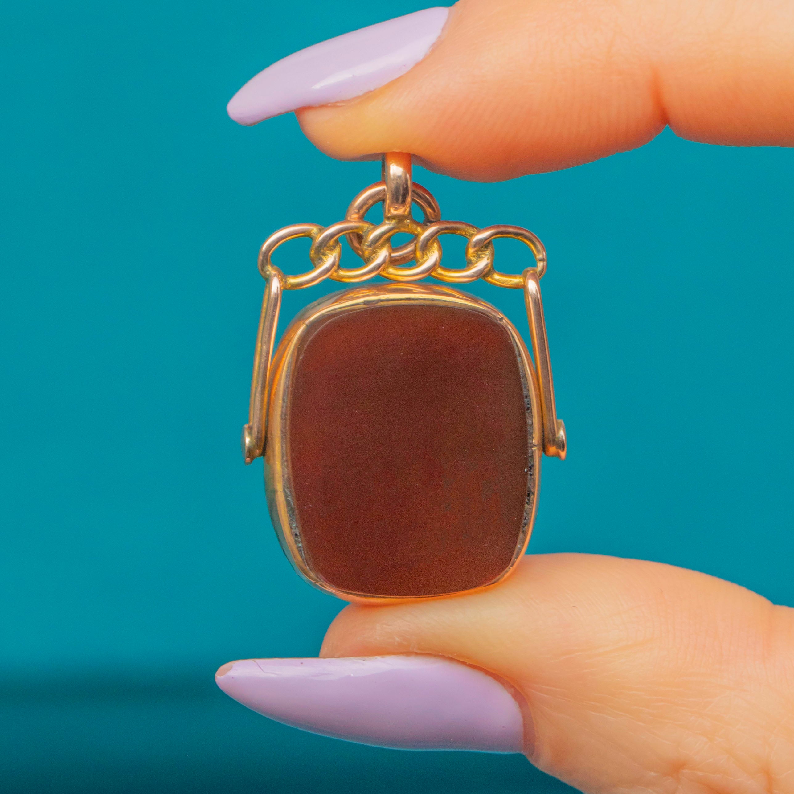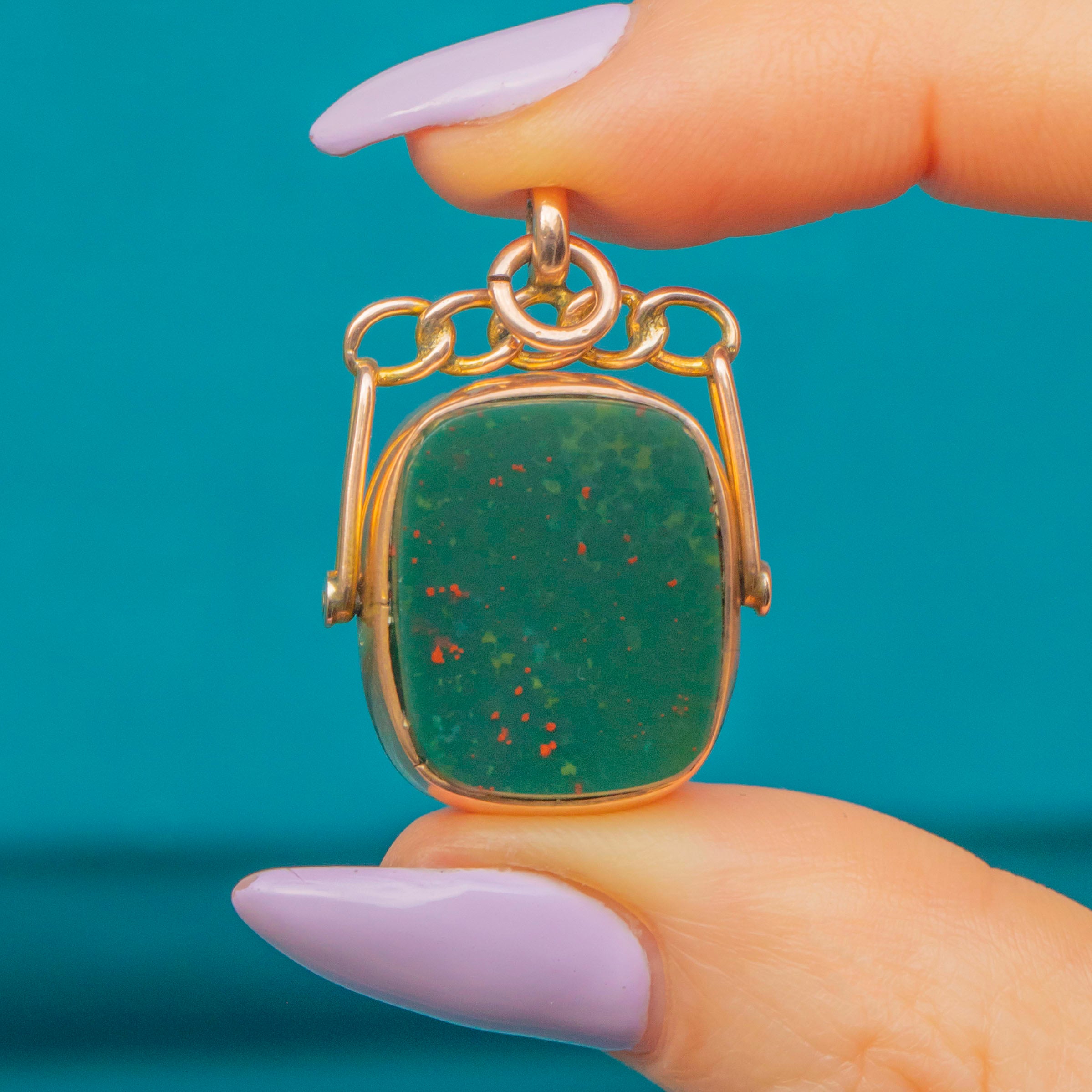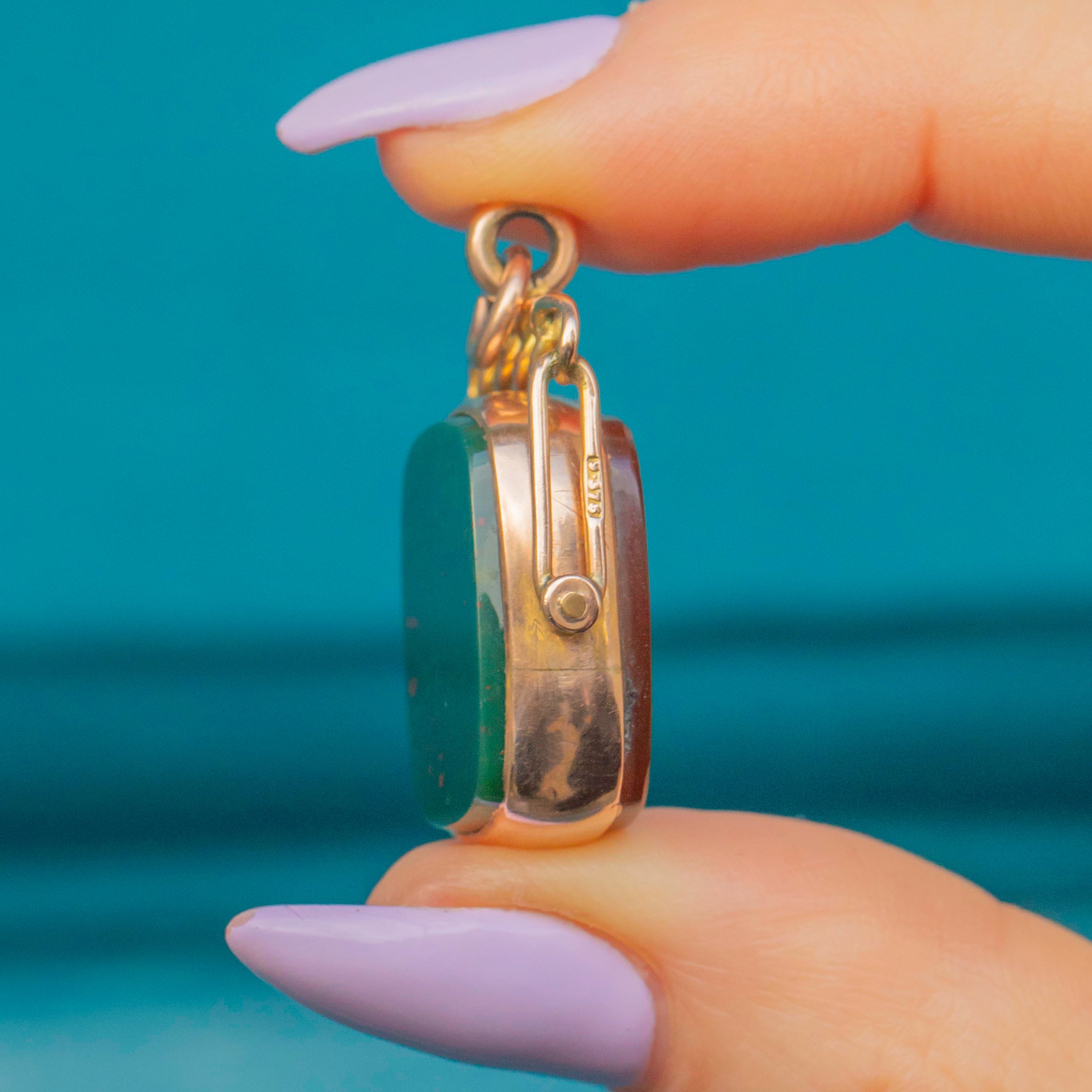 This is a charming antique 9ct Gold Bloodstone Carnelian swivel fob pendant! Highly sought after in the world of antique jewellery, this piece is inlaid with a smooth cut of deep wine red Carnelian and a softly speckled forest green Bloodstone.