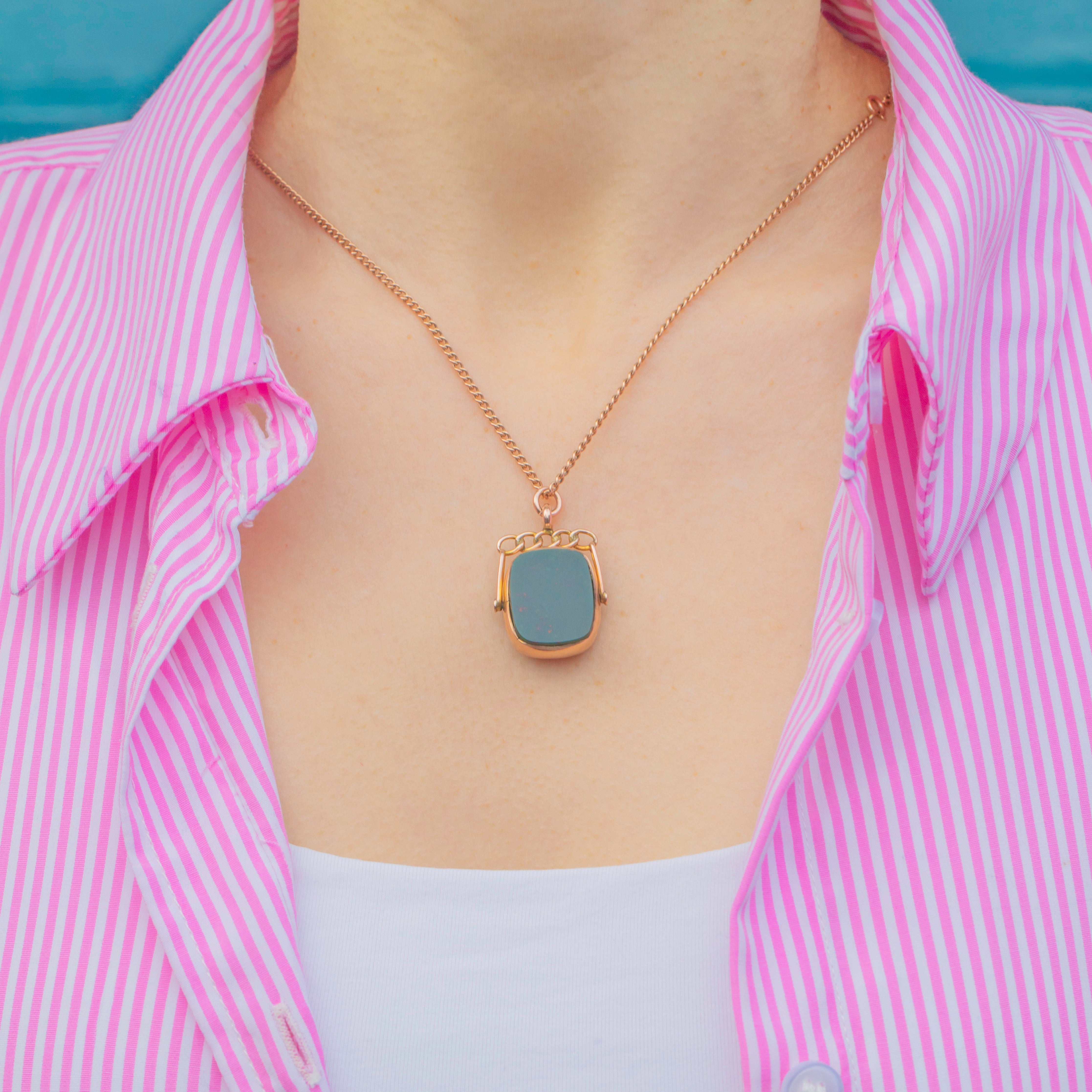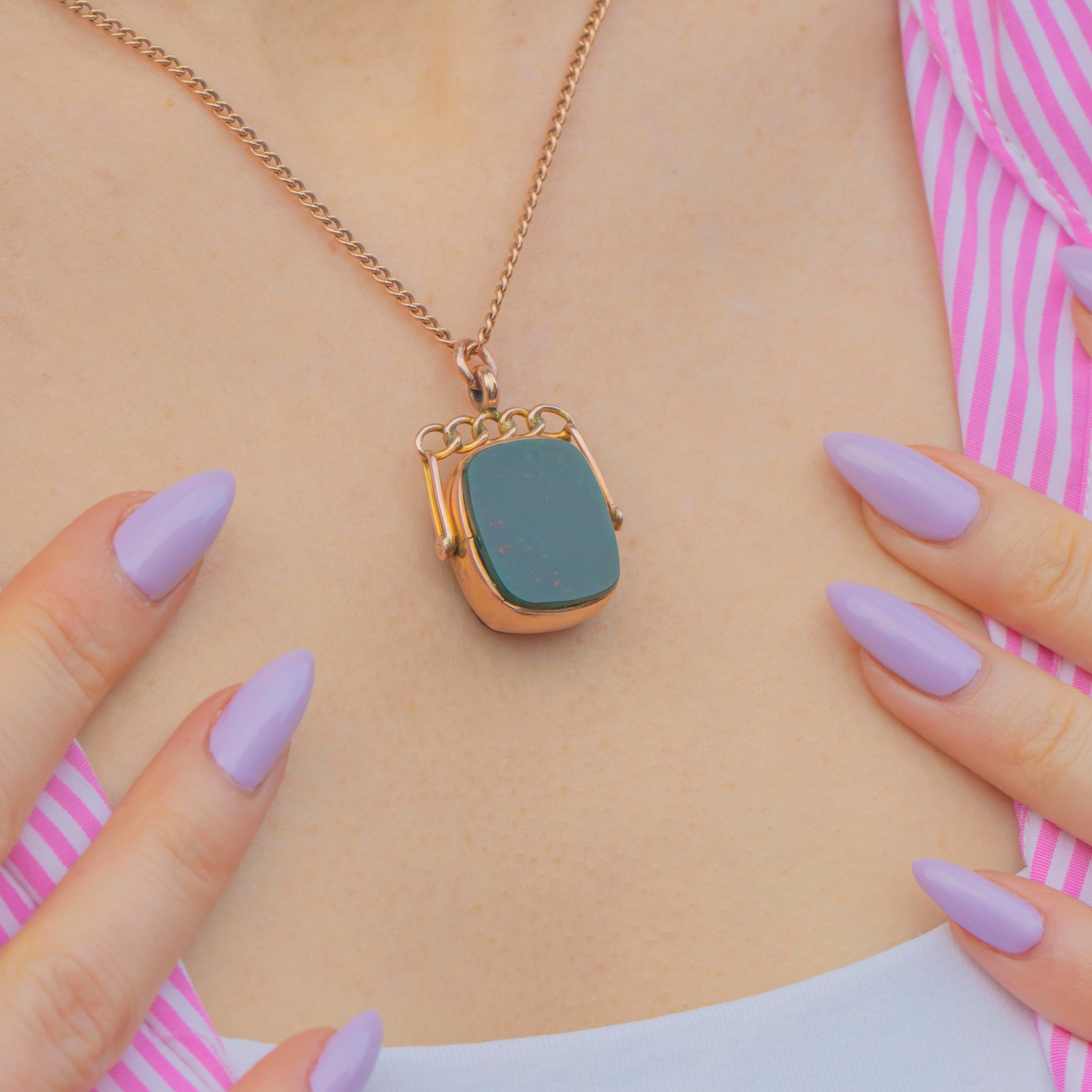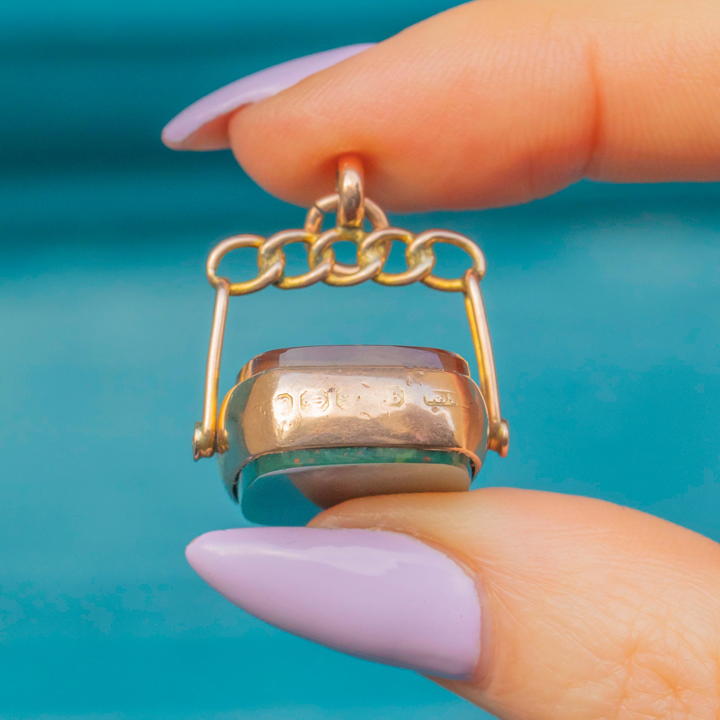 This is a charming antique 9ct Gold Bloodstone Carnelian swivel fob pendant! Highly sought after in the world of antique jewellery, this piece is inlaid with a smooth cut of deep wine red Carnelian and a softly speckled forest green Bloodstone.