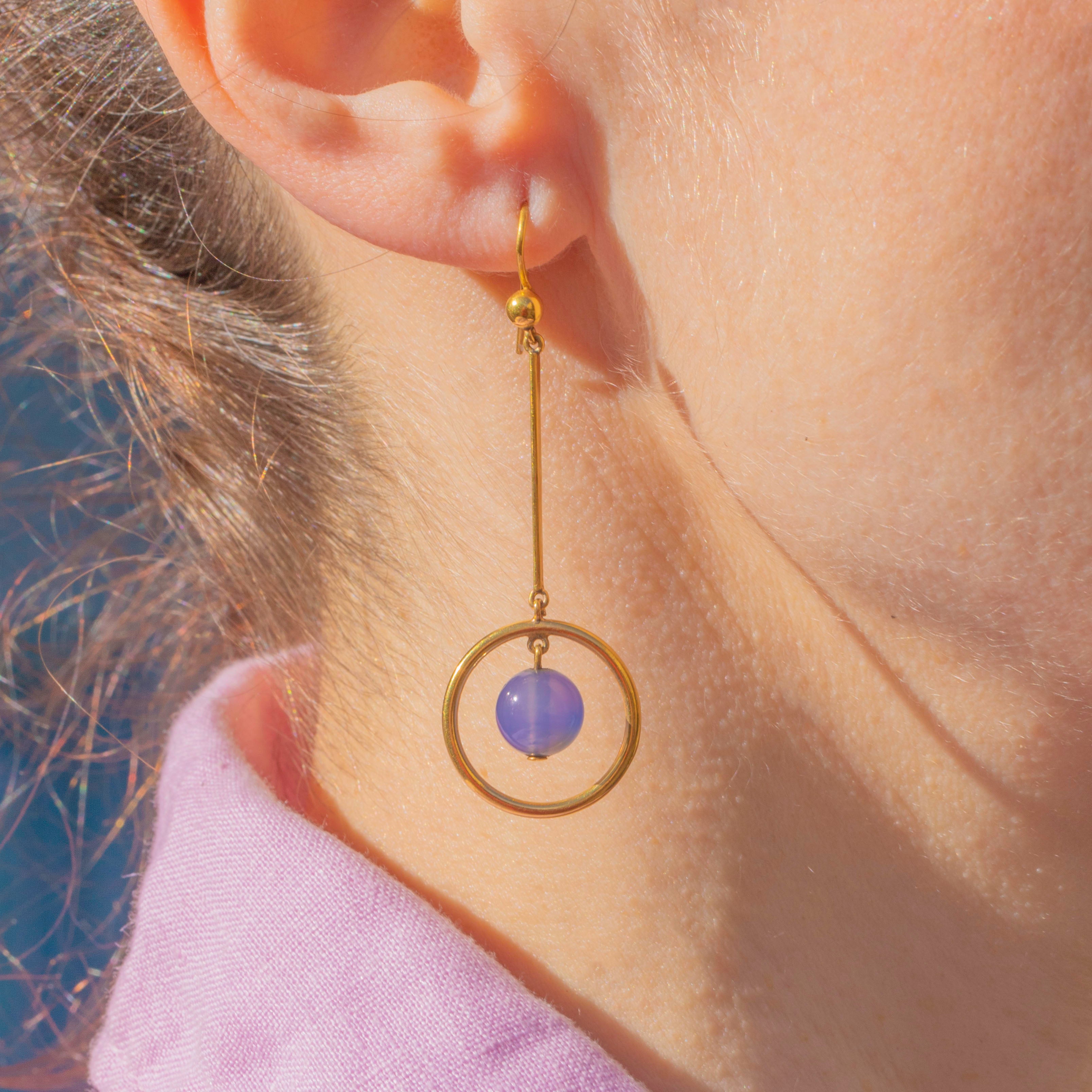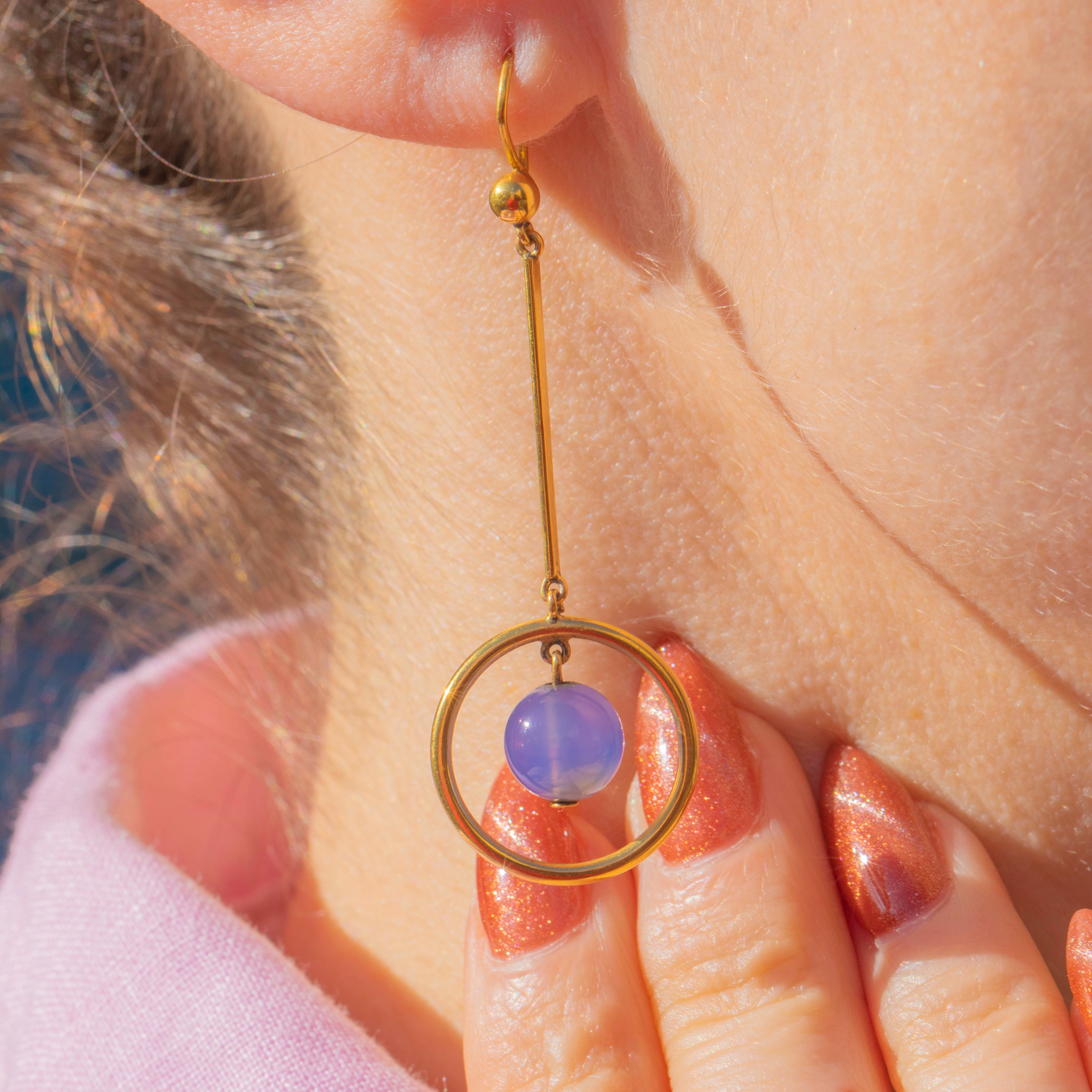 The smoothly cut Chalcedony spheres have a delightful periwinkle hue, perfectly complemented by the saturated Gold to create a stand-out pair of Victorian earrings! Each section is articulated, providing a lovely movement, and the earrings fall perfectly along the jawline, elegantly framing the face.