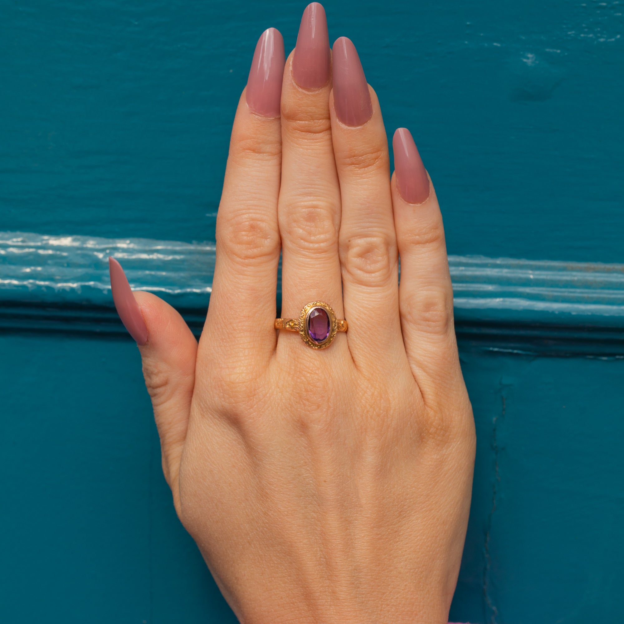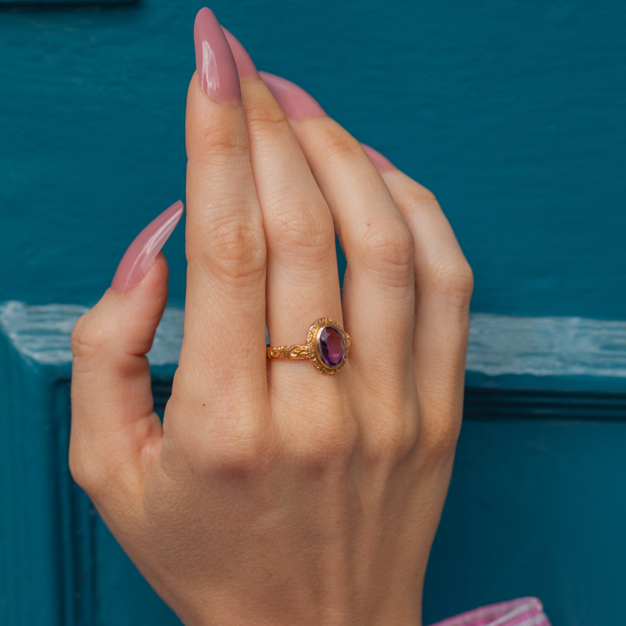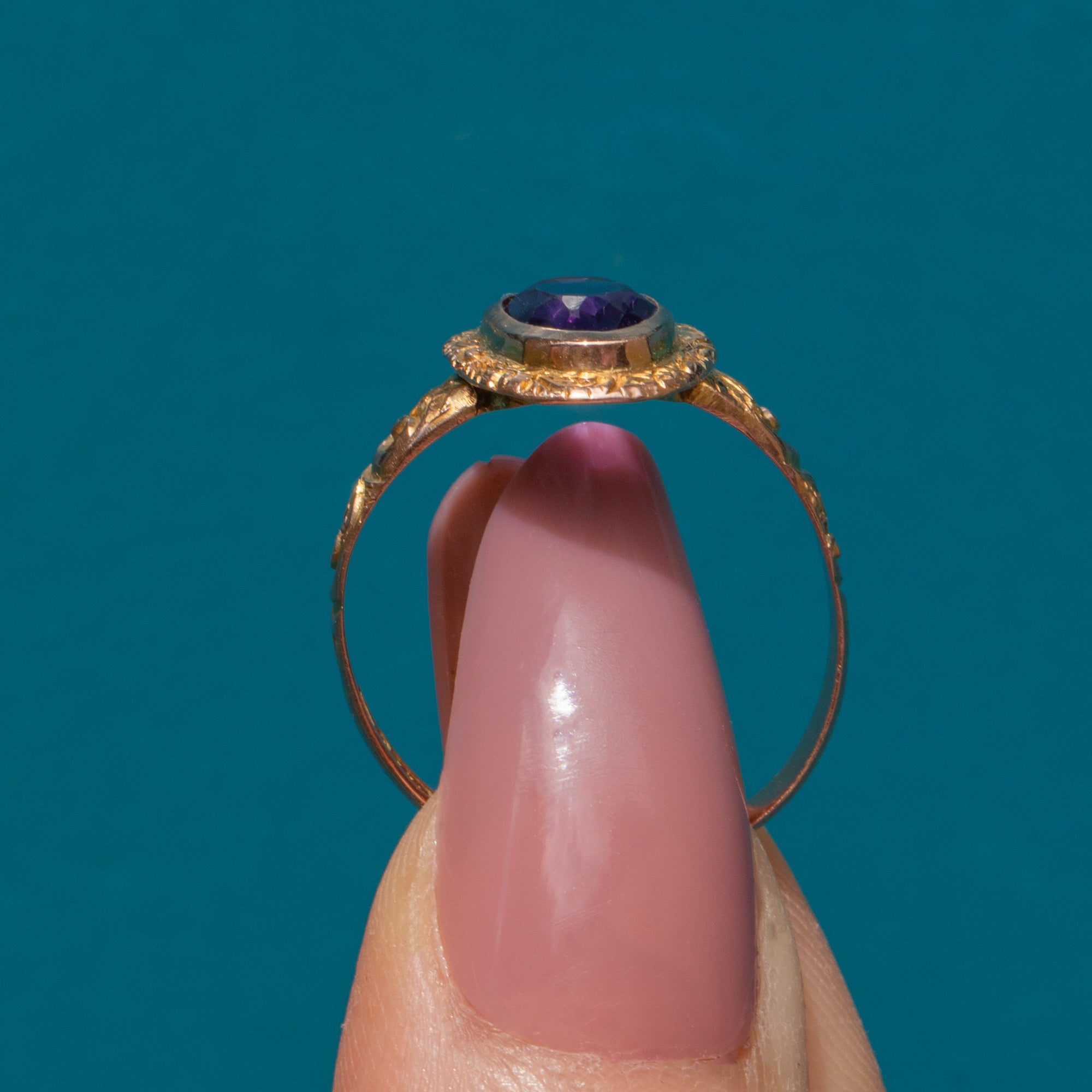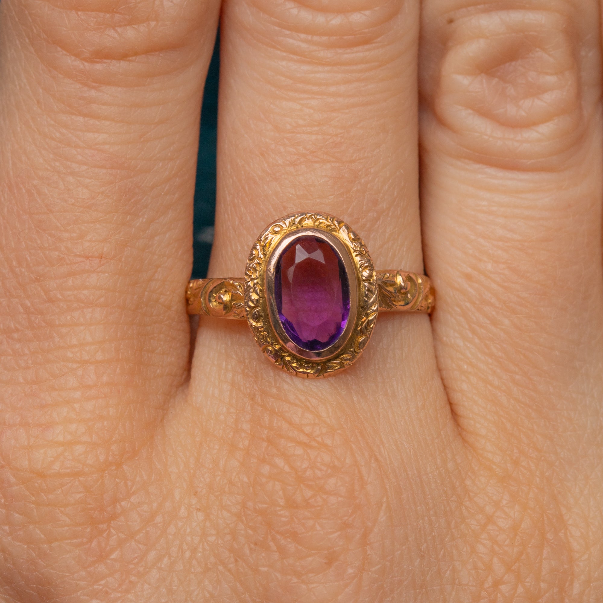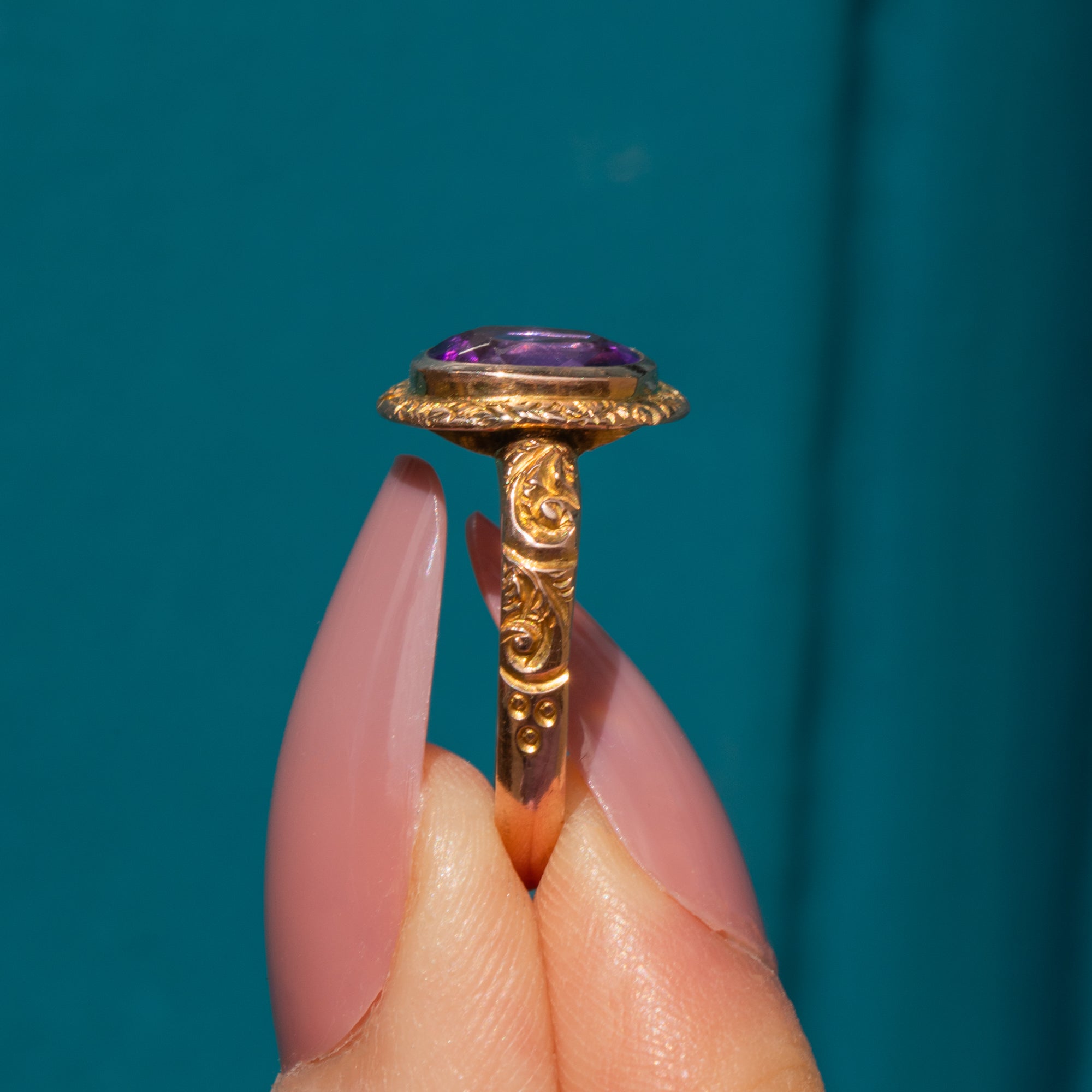 Exceptionally crafted, her 9ct Gold has been adorned with acanthus leaf engravings using the chasing jewellery technique. The texture allows this Art Deco ring to thrive beneath the light, perfect for bringing a pop of colour to your ring stack.