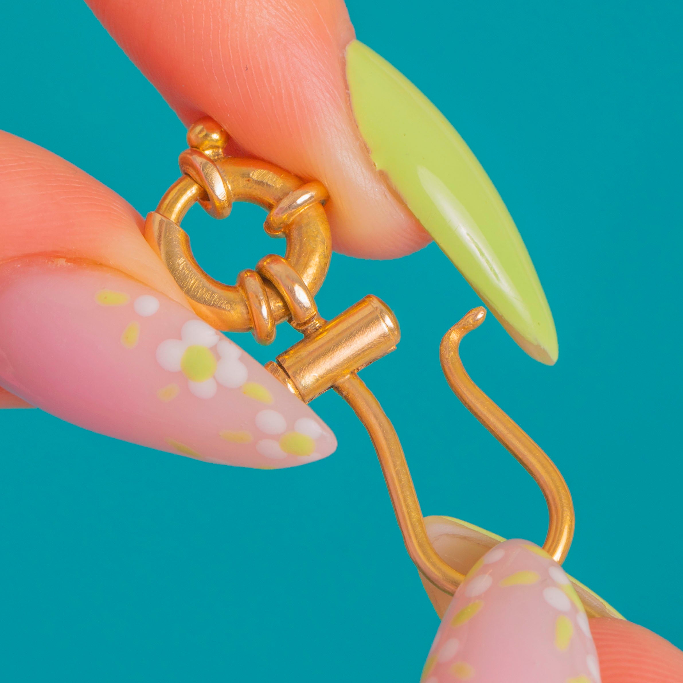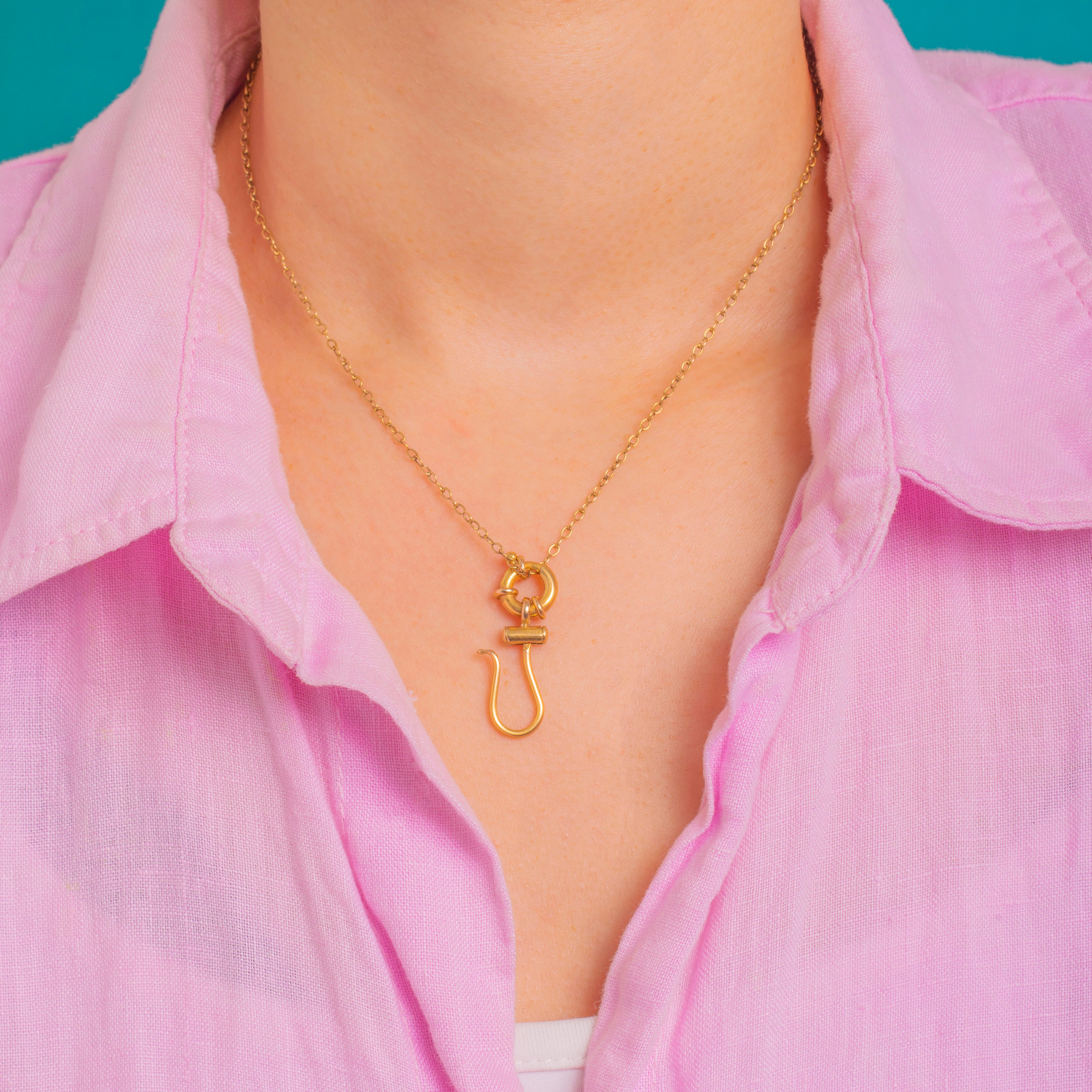 A sculptural Victorian 9ct Gold bolt-ring and hook with satisfyingly chunky contours and clean, utilitarian lines. The articulated drop brings together a circular bolt ring detailed with three wrapped loops, a smooth tubular barrel, and an S‑shaped hook, creating a tactile, minimalist silhouette in warm Gold.