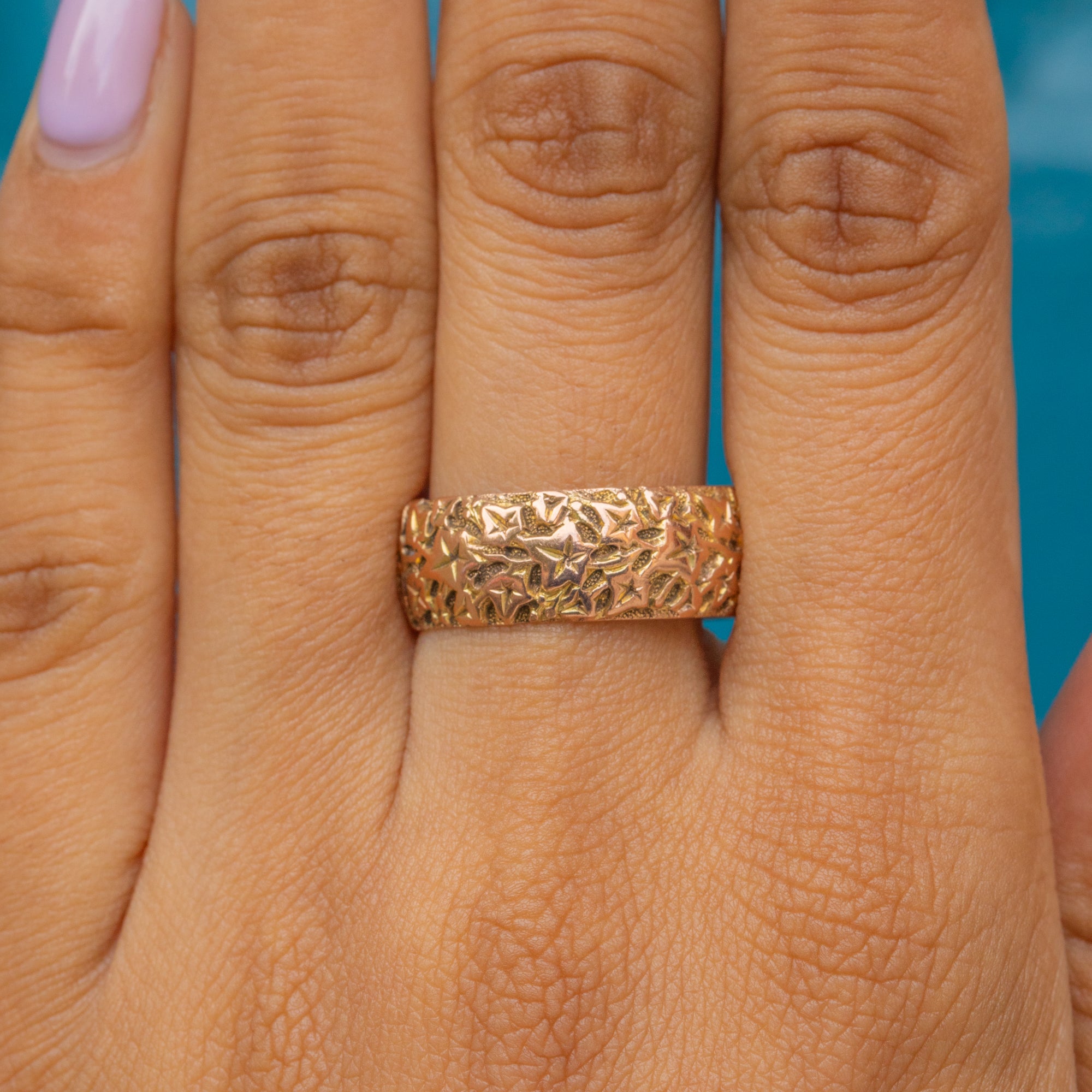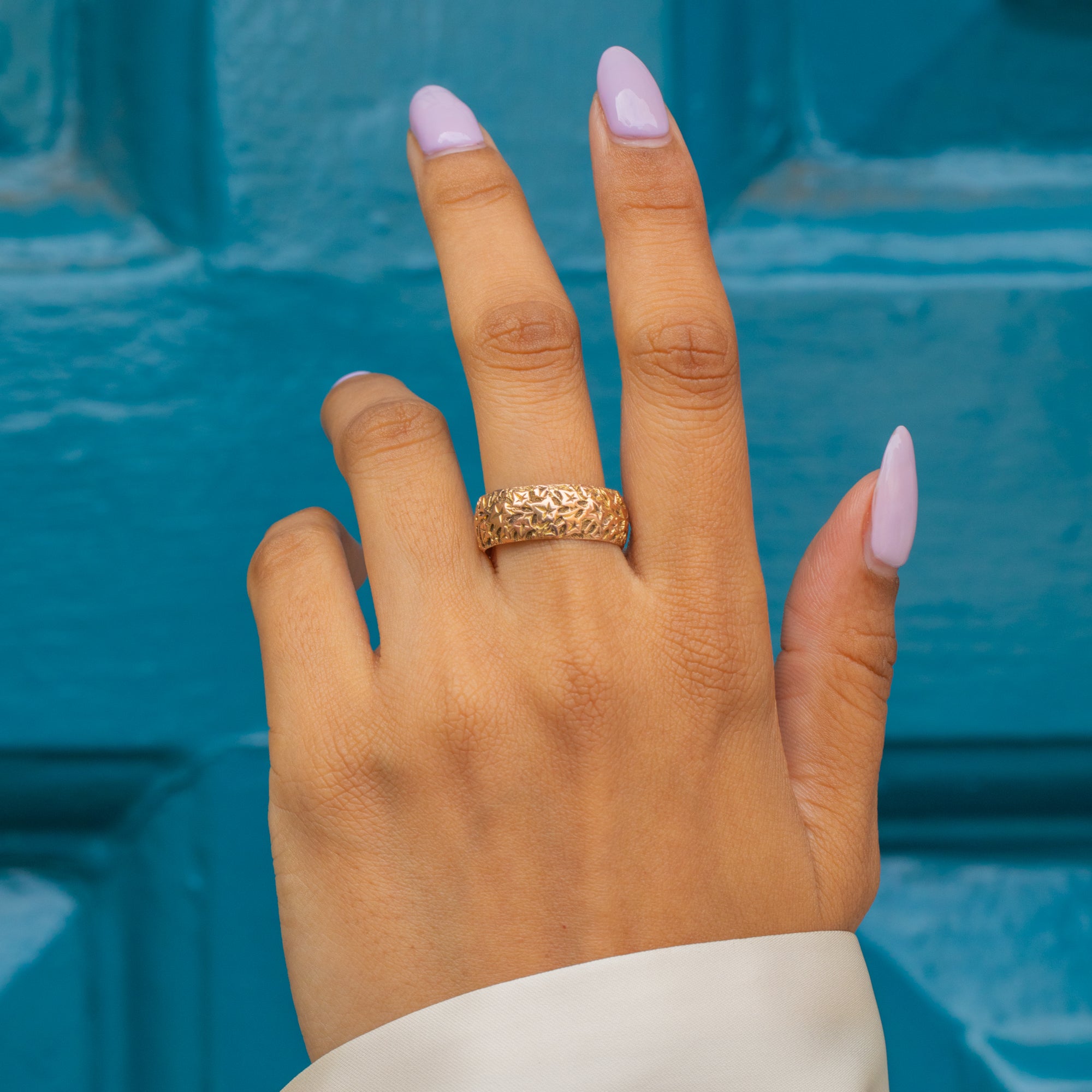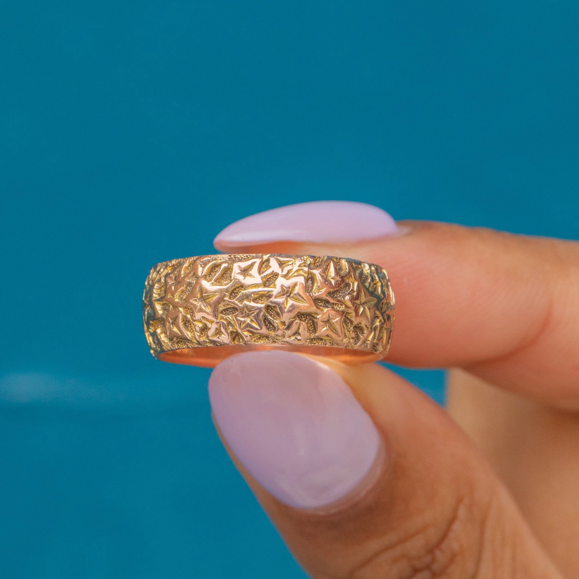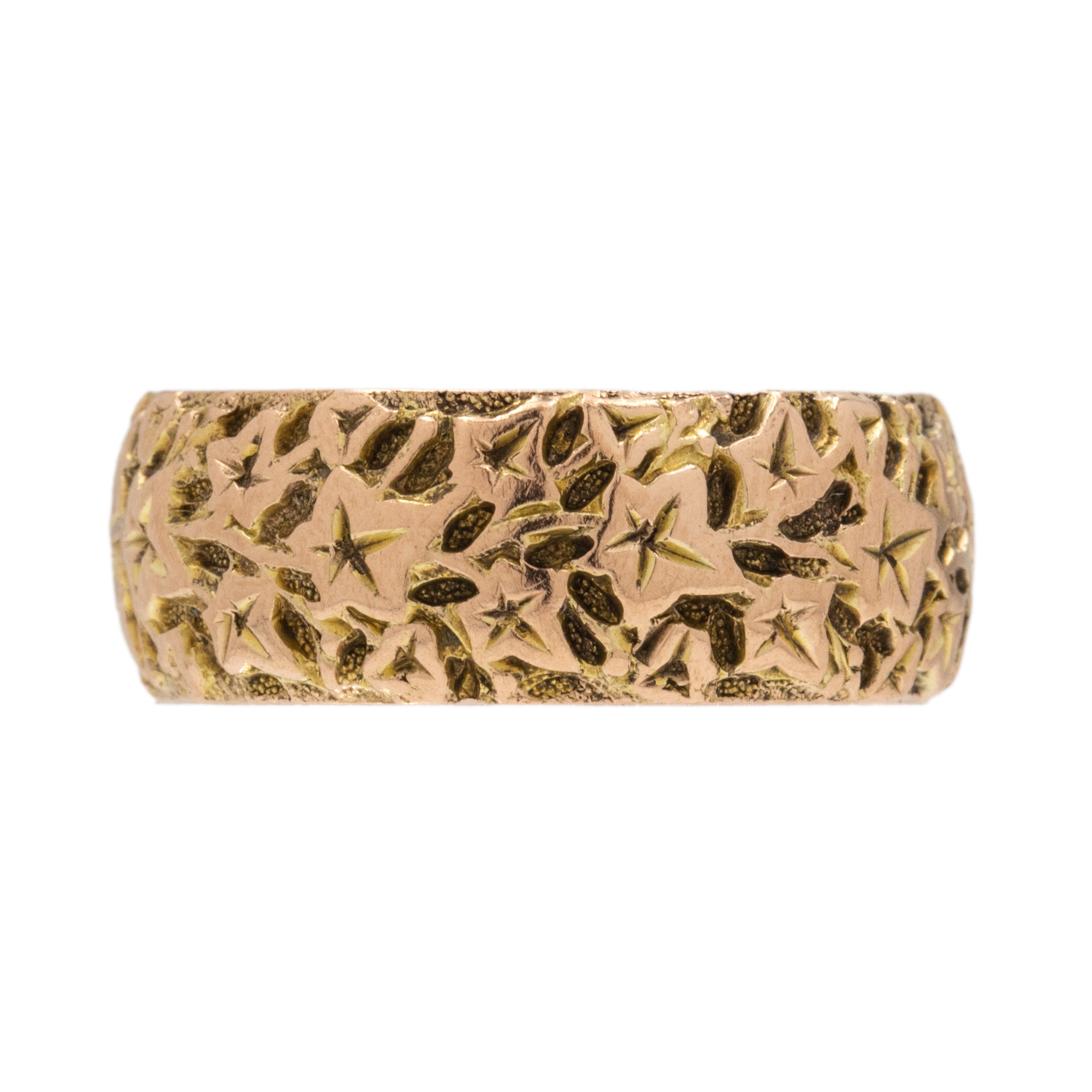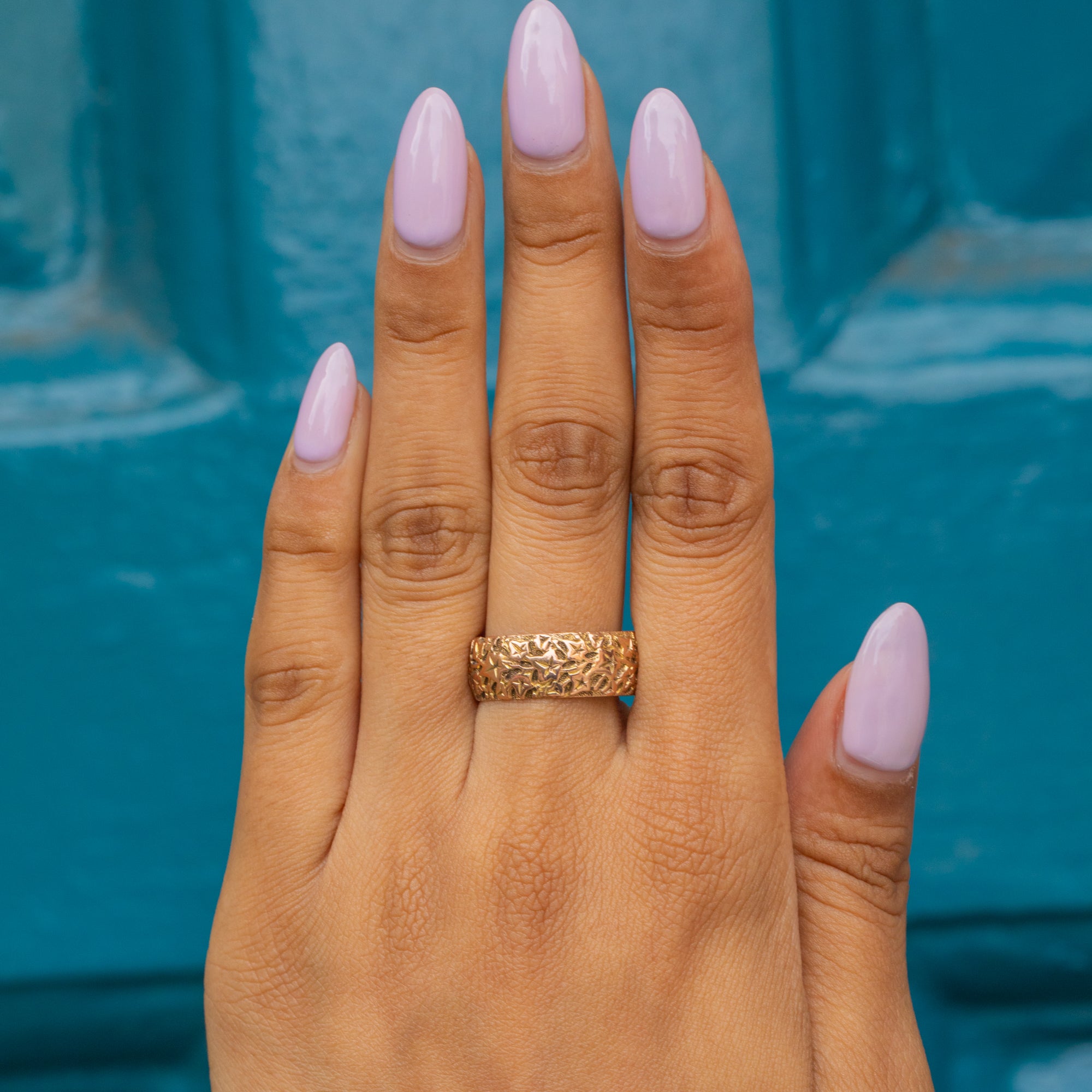 EXCELLENT. This antique 9ct Gold chunky ivy leaf engraved ring is in fantastic condition throughout. The Gold has an even rosy hue throughout and the engraved details have remained crisp. The band is robust and free from any dings with a full set of hallmarks allowing us to accurately date this Victorian Gold band to 1876, making her a fine collector's piece!