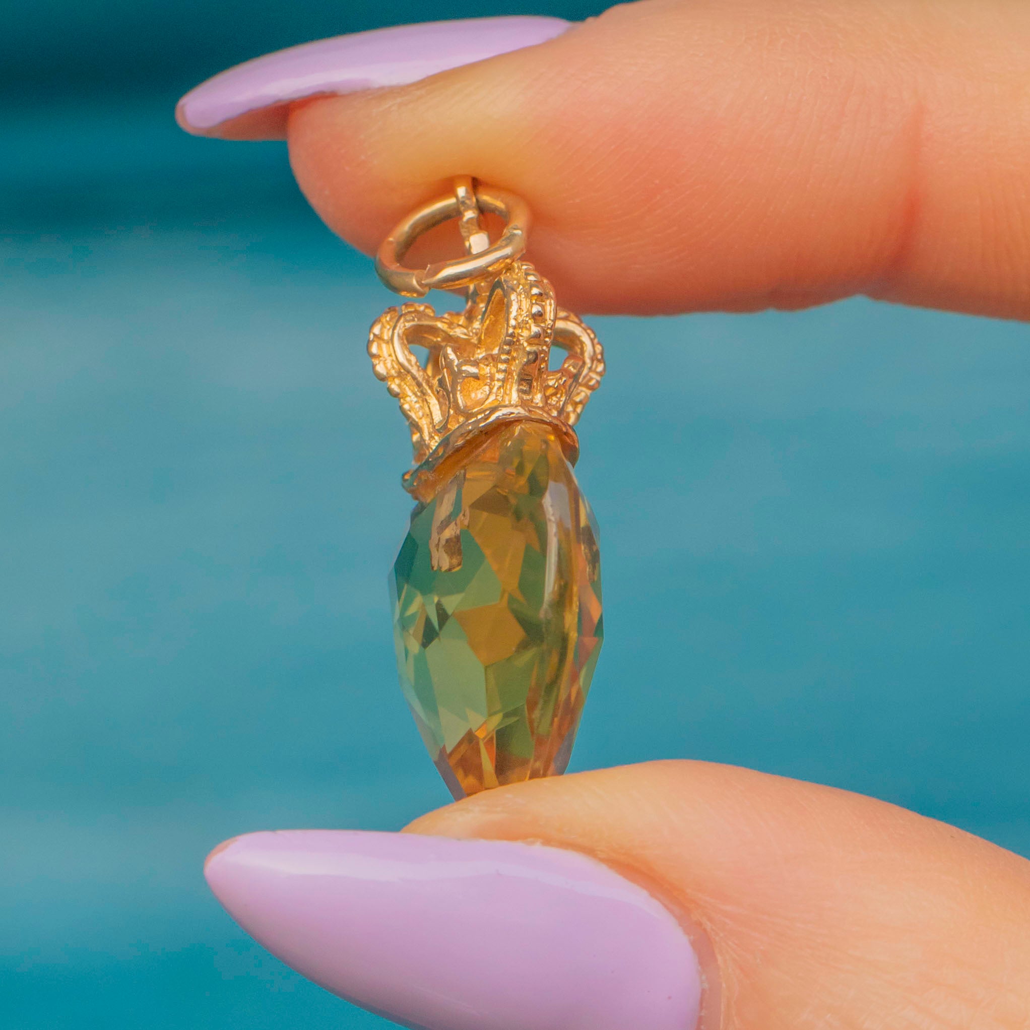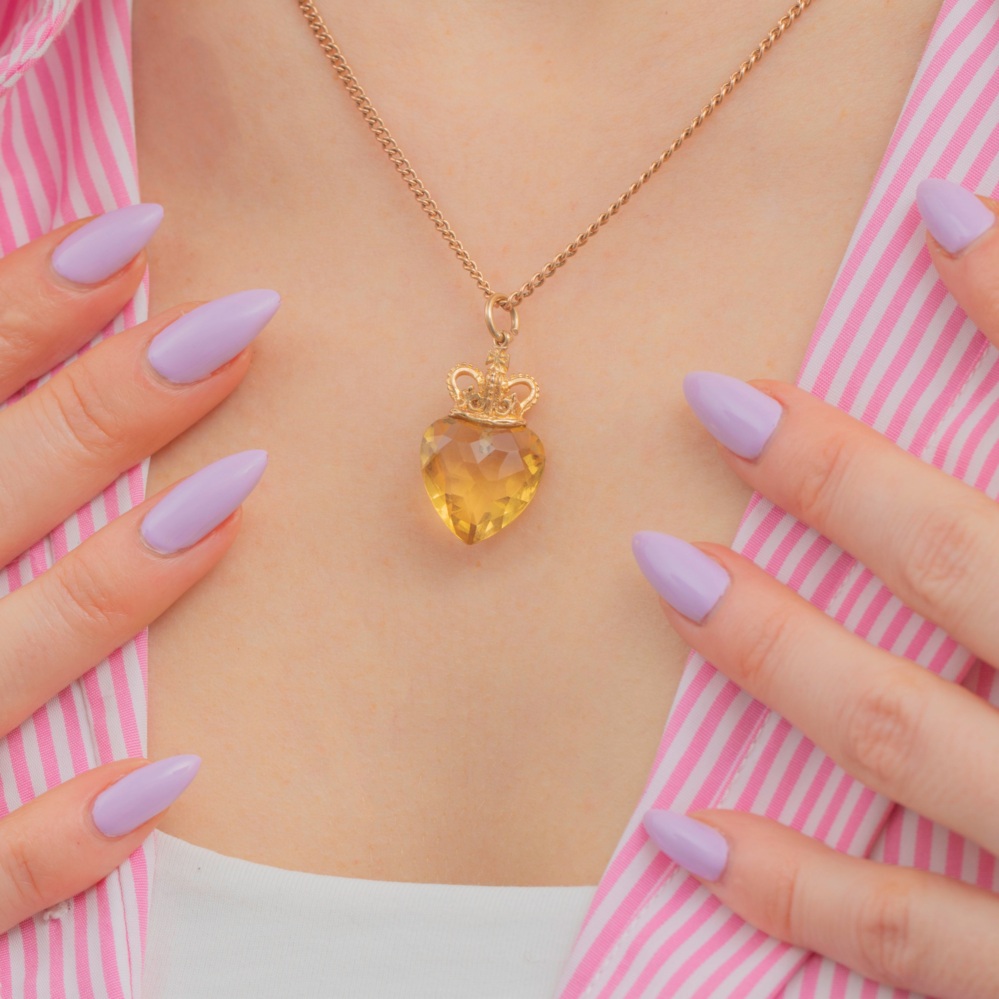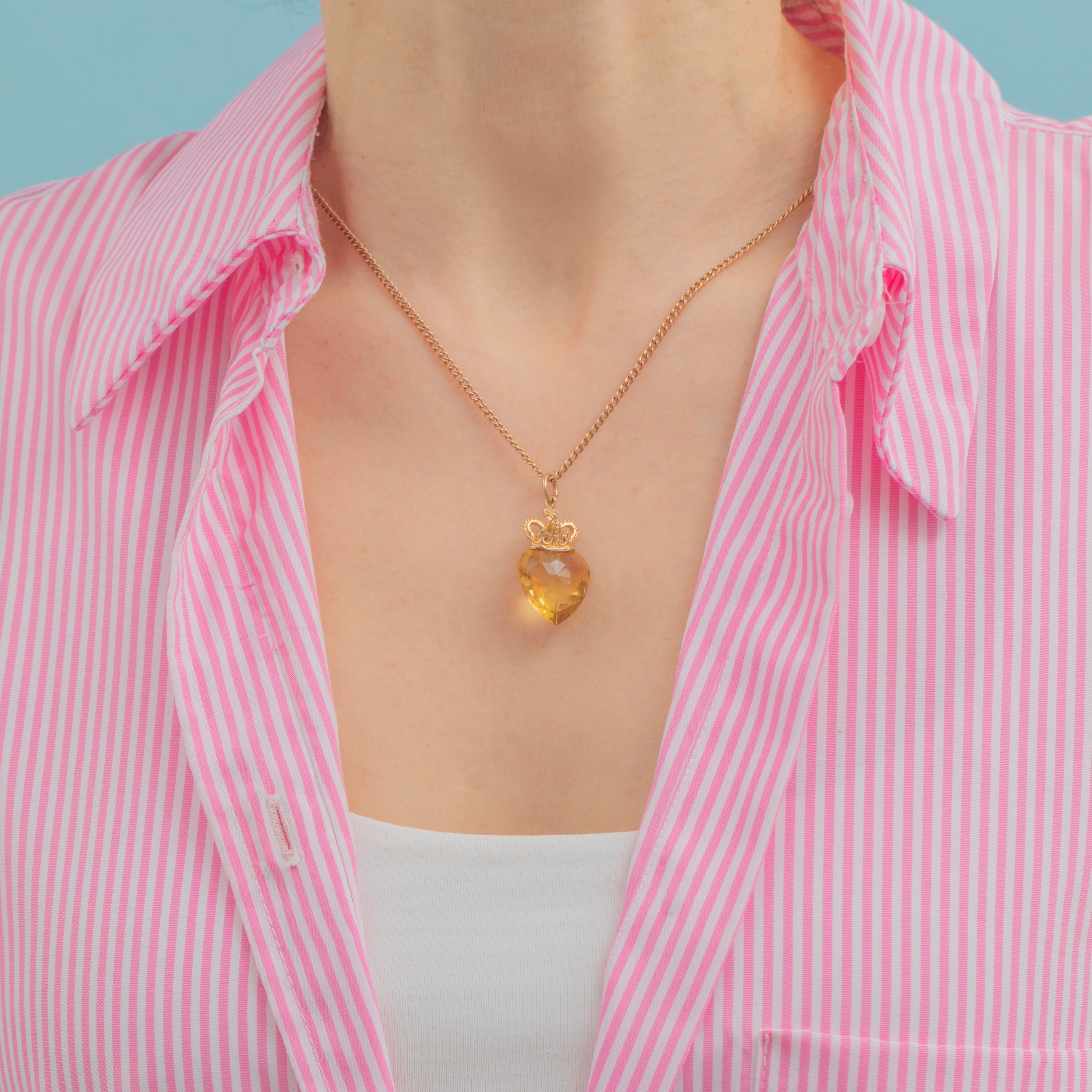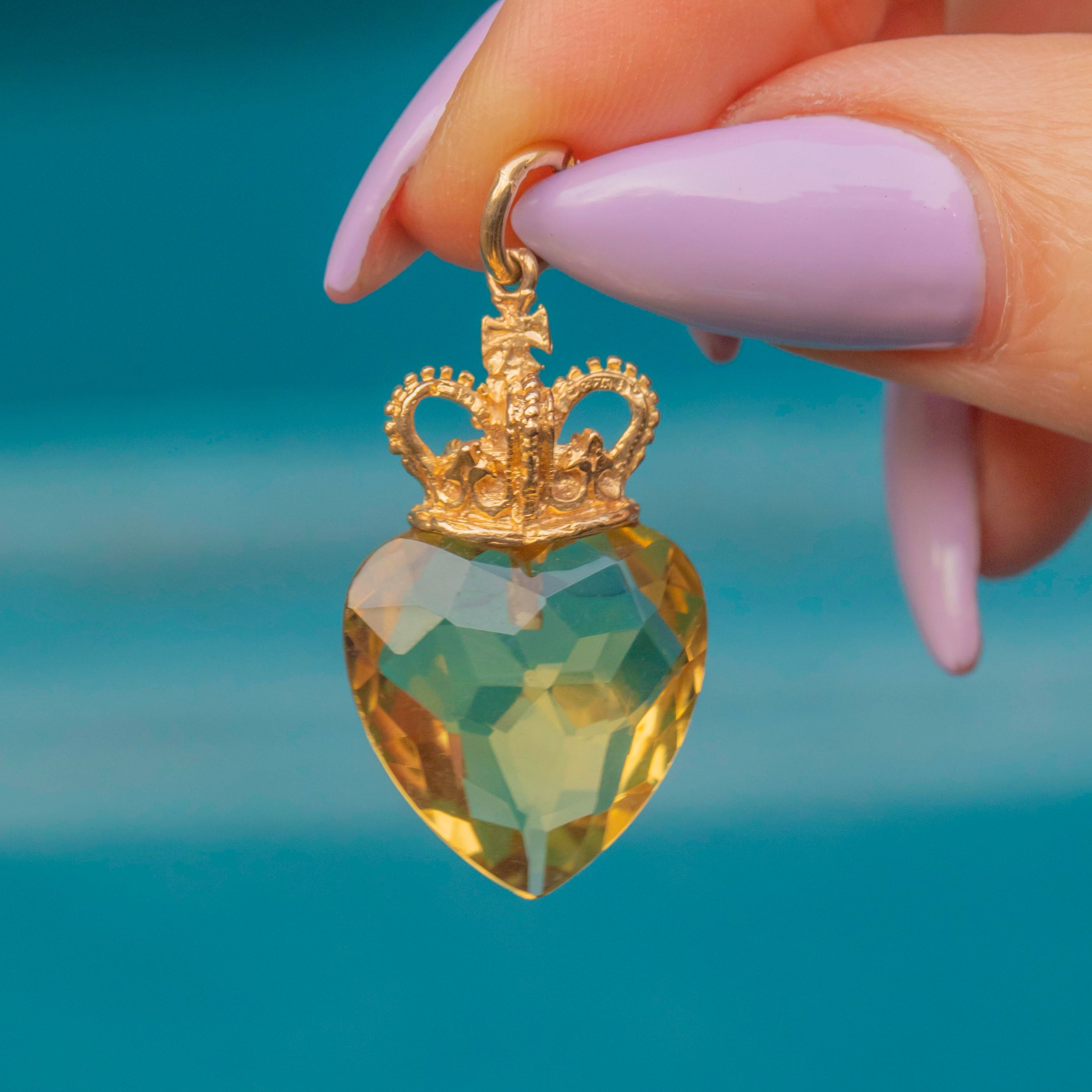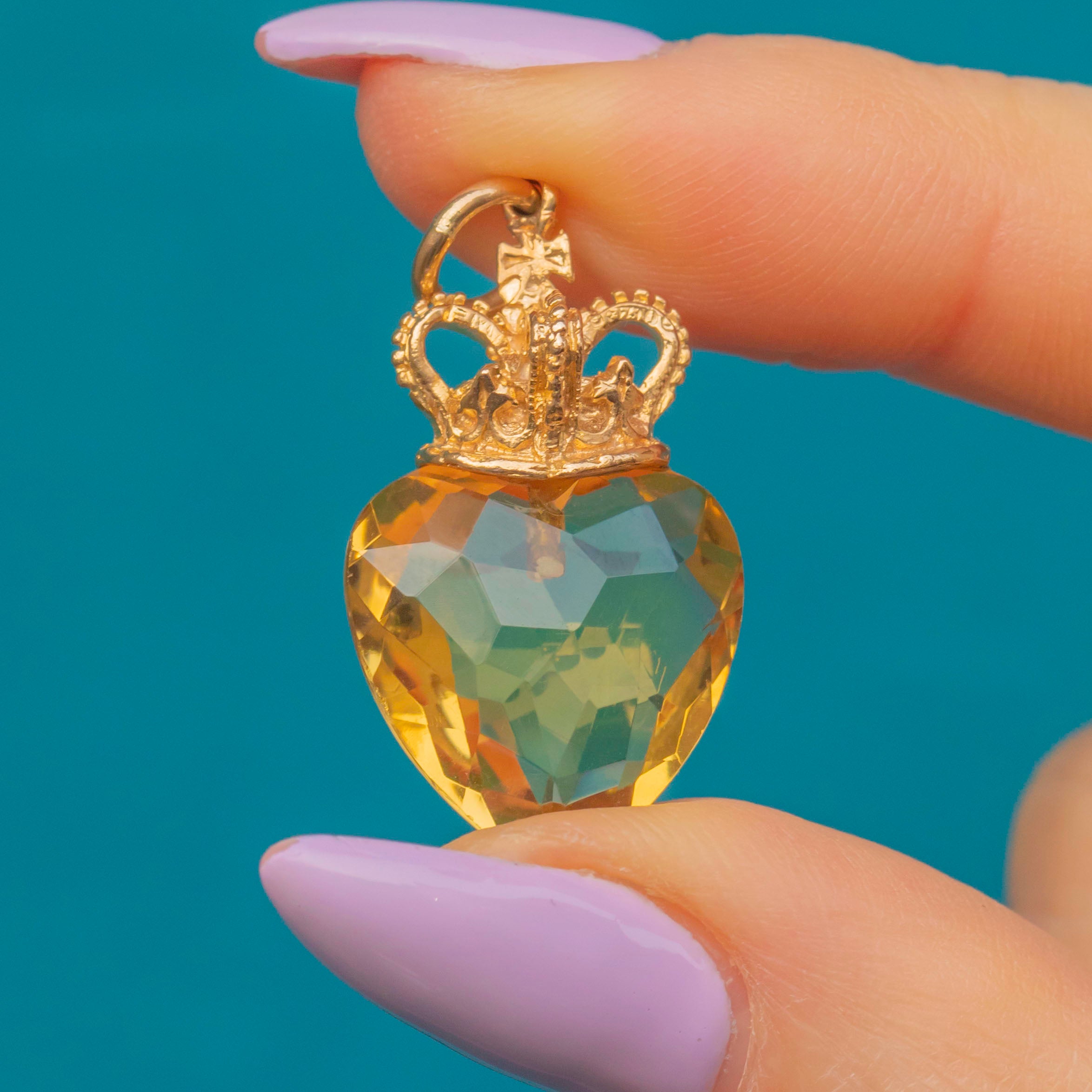 EXCELLENT. This 9ct Gold Citrine crowned heart pendant is in excellent condition. The Citrine has crisp facets and is free from any chips or abrasions. The Gold is luminous and the details on the crown have all remained defined. With a secure jump ring, you can wear her with confidence.