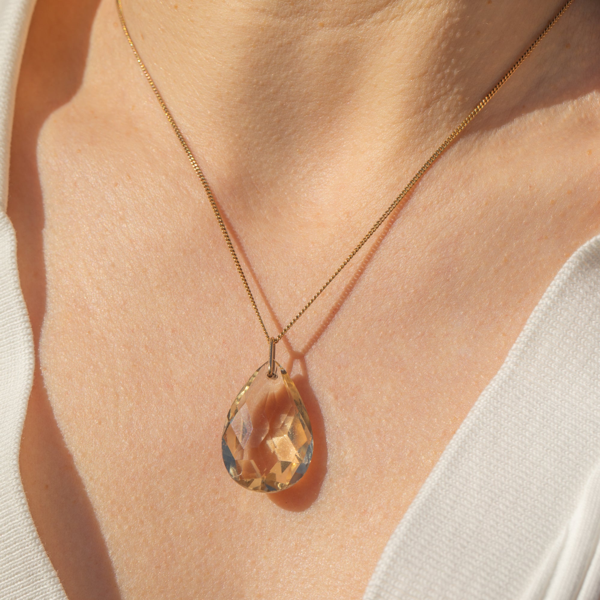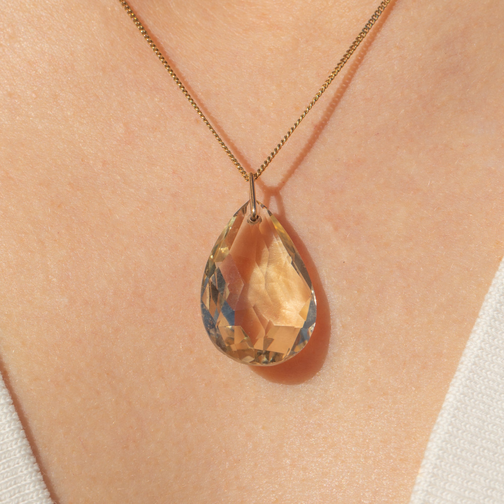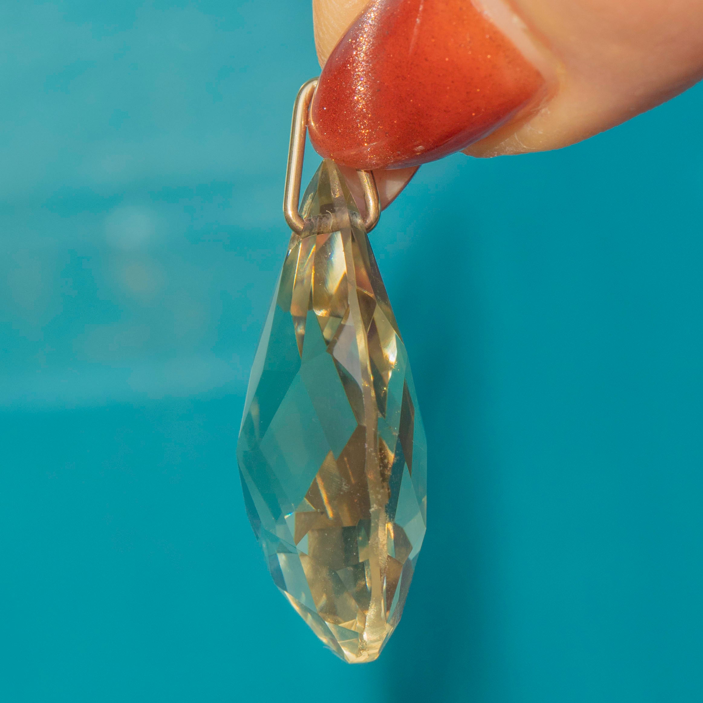 VERY GOOD. This antique 9ct Gold Citrine pear drop pendant is in very good condition. The Citrine has a delightful pale yellow hue with crisp cut facets. Under close inspection, there are some minor fleabites on the surface of the Citrine, which is to be expected from an exposed gemstone of such great age. The solid Gold bale is securely affixed to the Citrine, allowing you to confidently suspend it from a fine Gold chain!