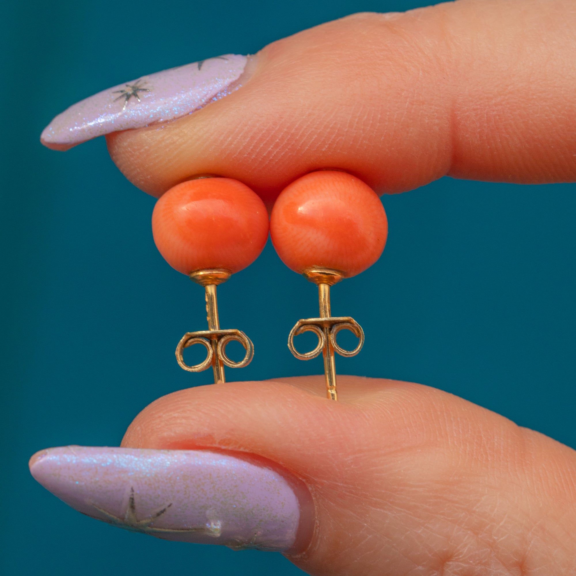 EXCELLENT. A stunning pair of antique 9ct Gold Coral stud earrings! In excellent condition, these earrings wear securely with butterfly backs and have smooth Coral gemstones that have lasted incredibly well through time.