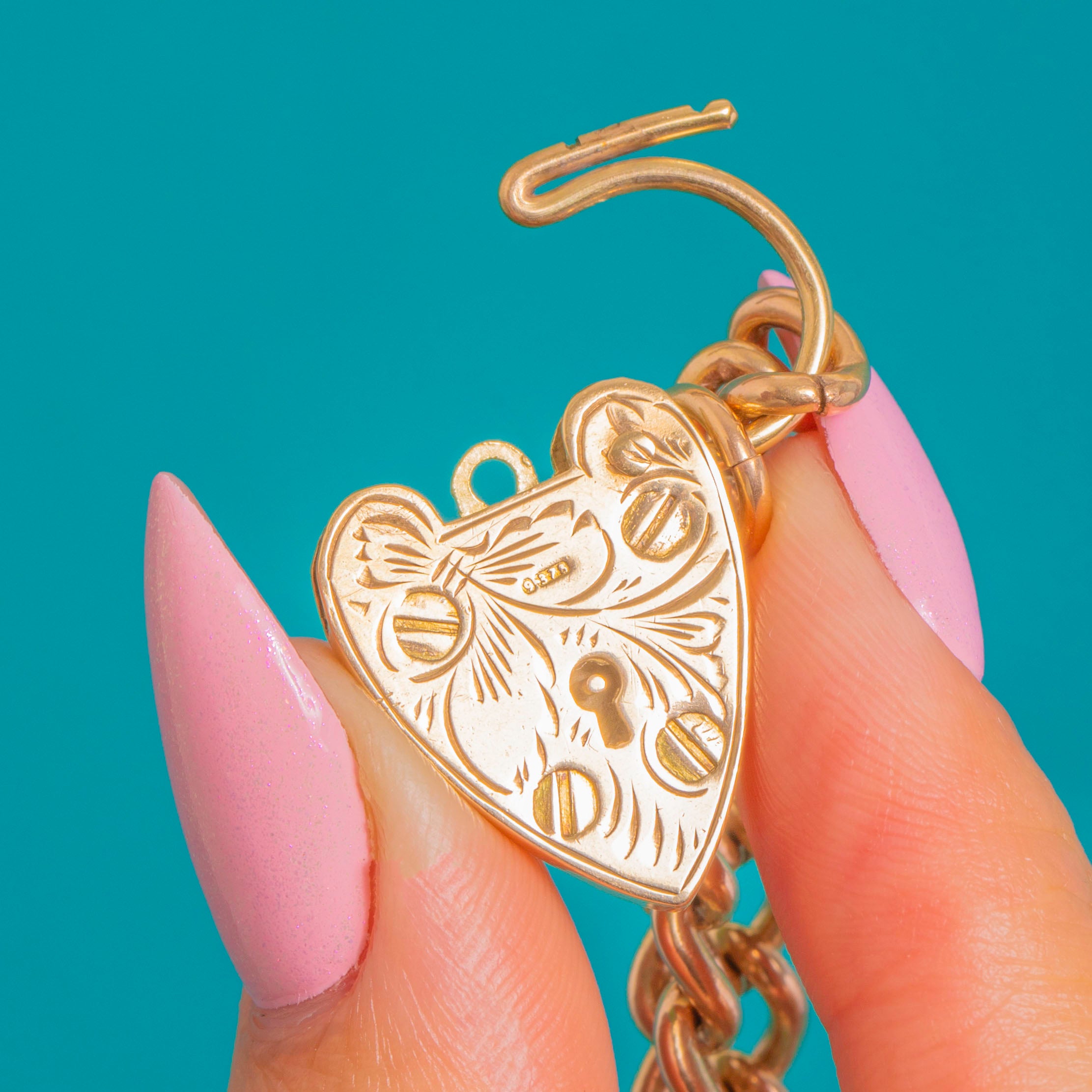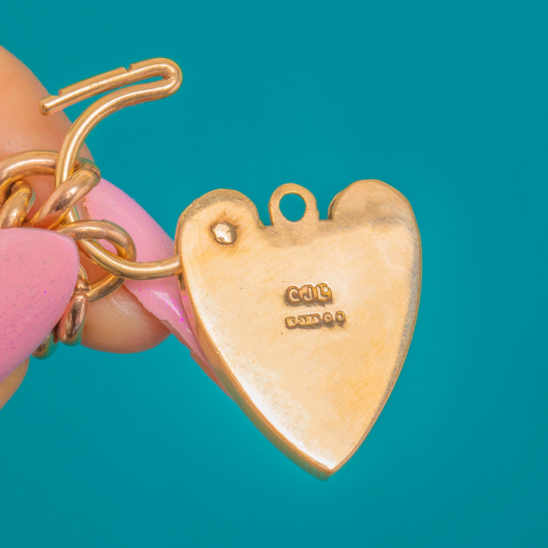 The heart padlock is removable and functions as the clasp, giving you the option to wear it on other chains or bracelets as you please. The uniform curb links drape smoothly on the wrist, while the crisp engravings and clear hallmarks on the padlock underscore its quality. A timeless, wearable treasure with true sentimental charm.