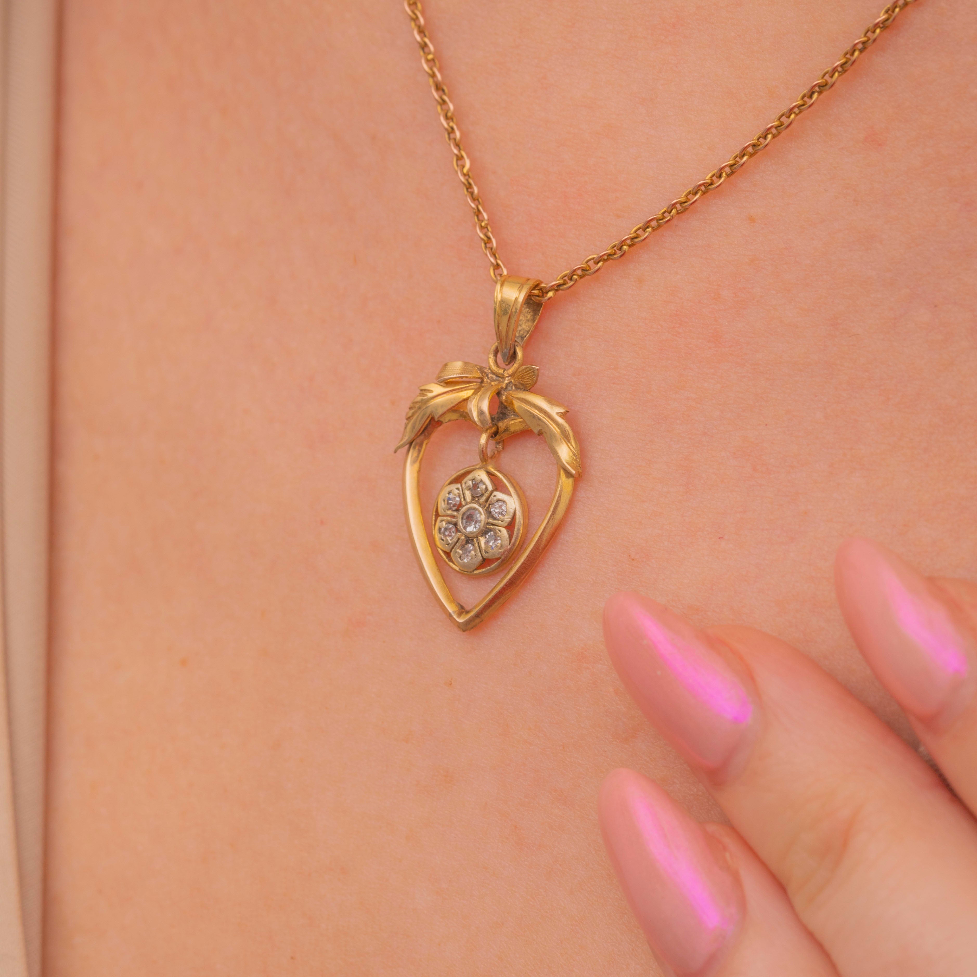 Add a touch of antique charm to your collection with this 9ct Gold Diamond floral heart drop pendant!