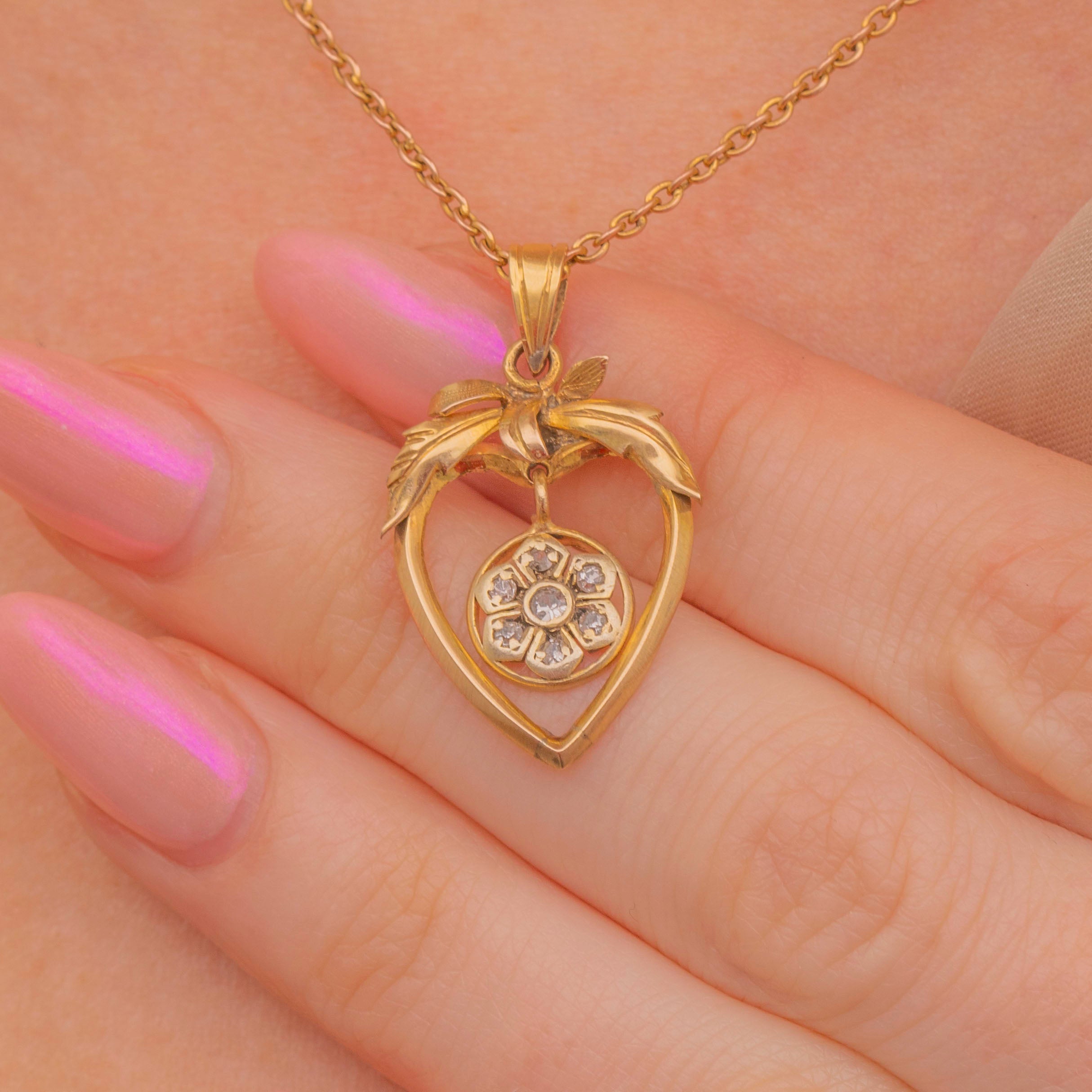VERY GOOD: This antique 9ct Gold Diamond floral heart drop pendant is in very good condition. She has been well crafted, and each Diamond sits securely within their setting. There are some minor signs of wear to the Gold commensurate with age, however this does not affect her beauty nor functionality.