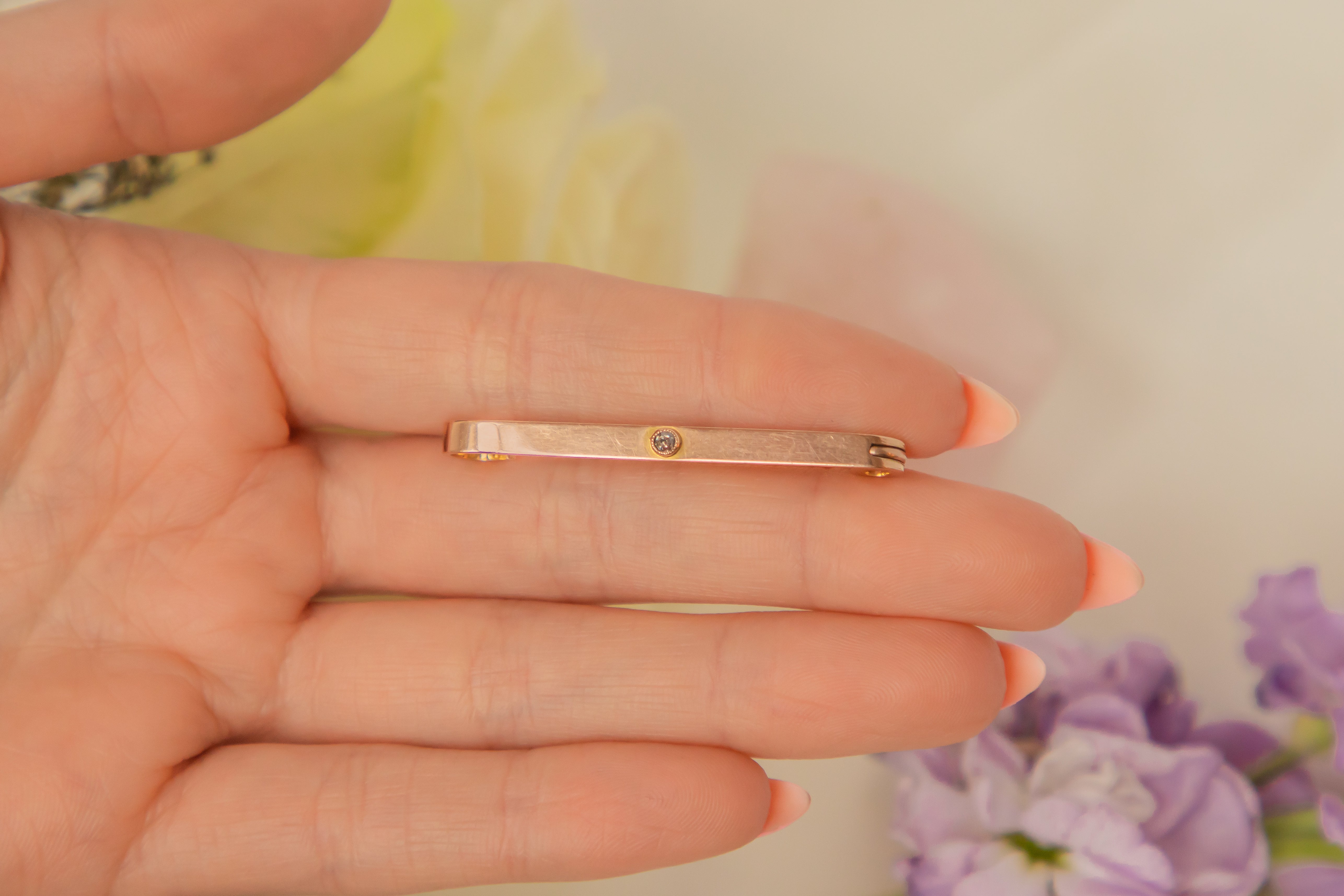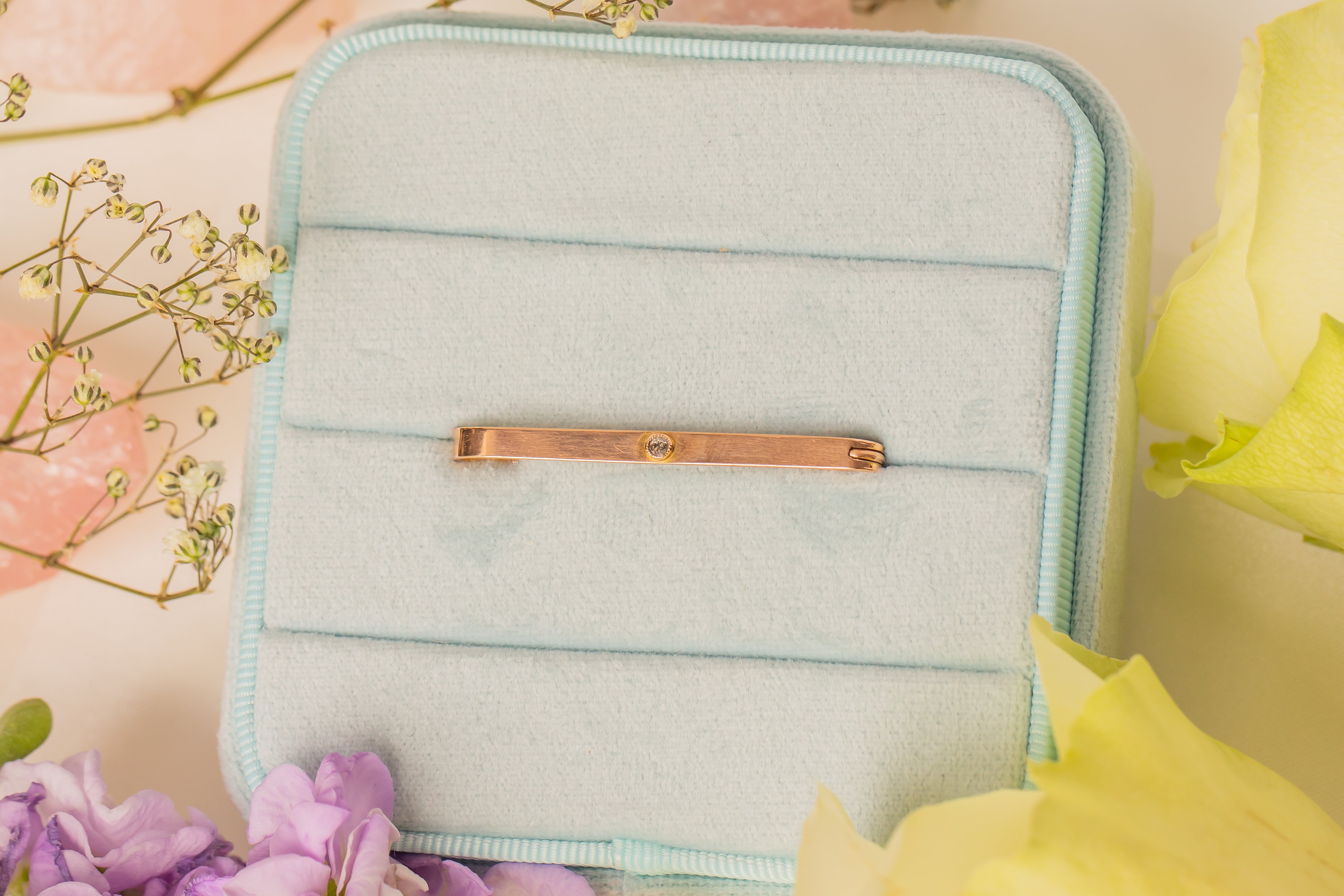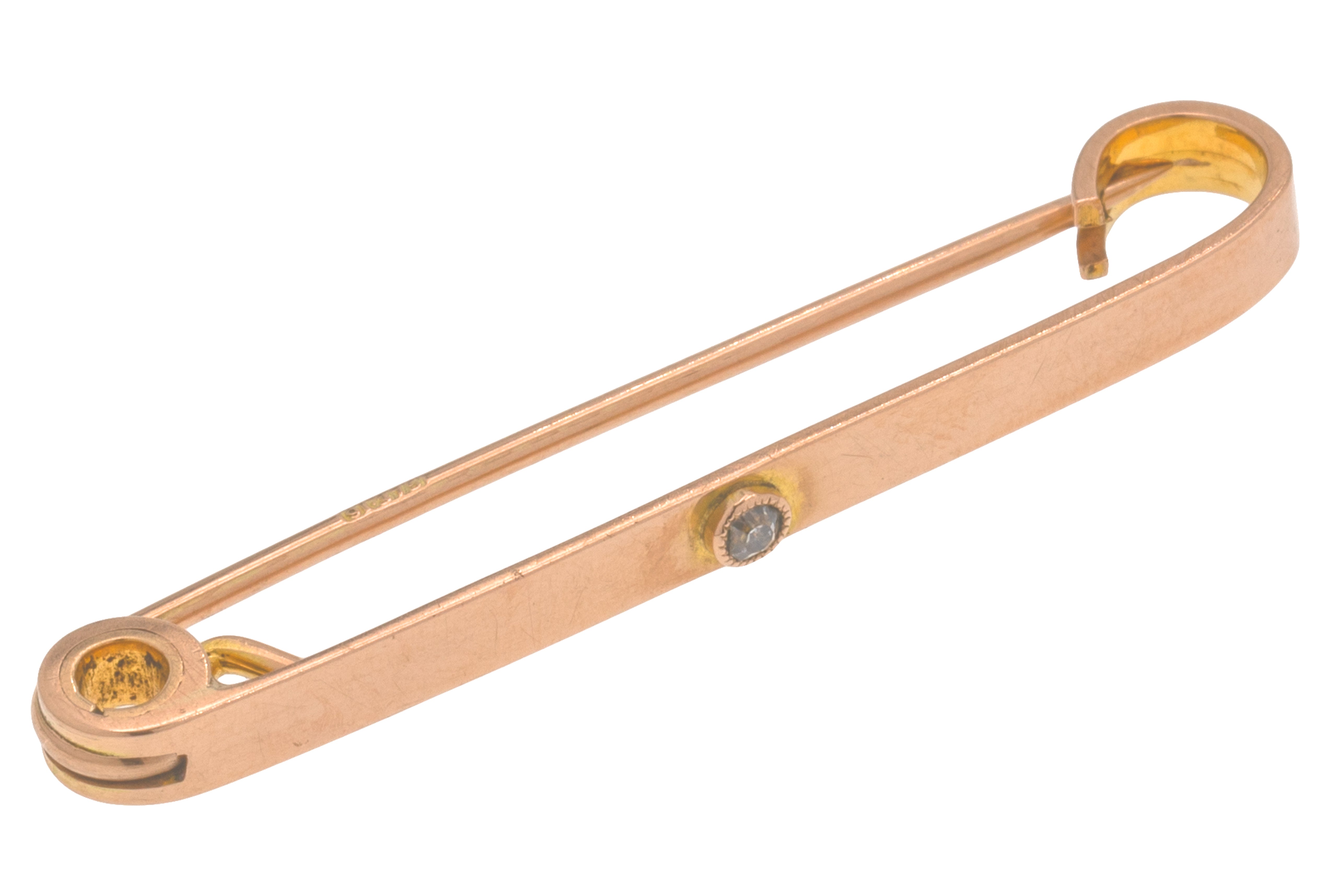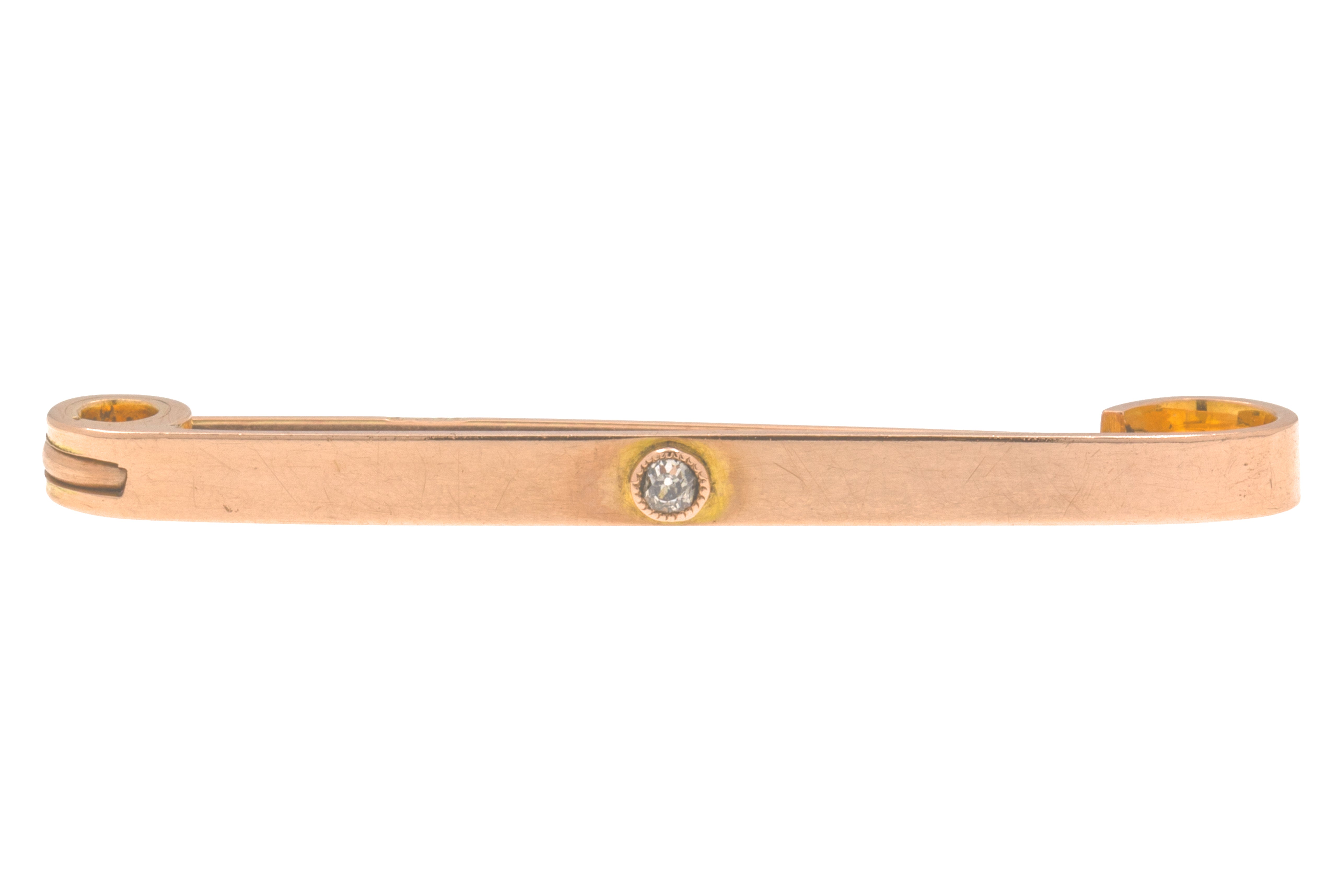 EXCELLENT. This antique 9ct Rose Gold Diamond bar brooch is in excellent condition. This treasure has a lovely little Diamond at its centre, which is free from any fleabites and securely set. The pin has a gorgeous hue and is in perfect working order, promising you decades of wear!