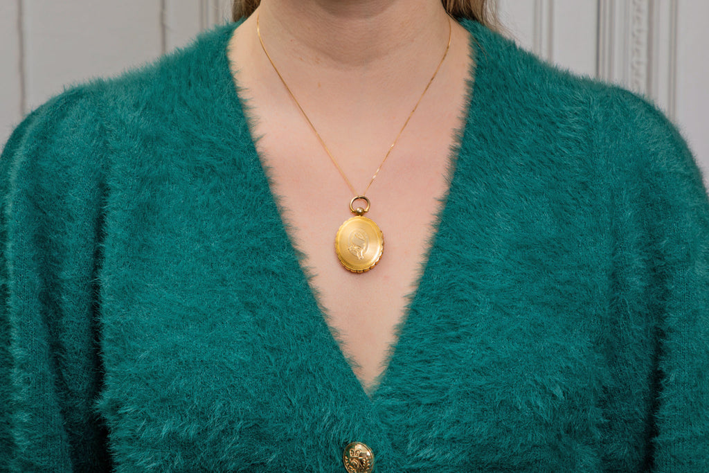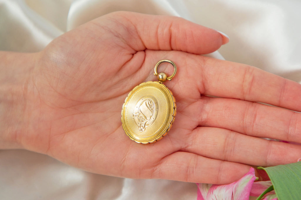 VERY GOOD. This antique 9ct Gold engine turned scallop edge locket is in very good condition overall! The Gold is gorgeous and bright and the engraved front and back are just delightful. The locket closes securely but does require a healthy push to open, and its two Gold plated frames will keep your photos safe. The metal bale has lost some of its glow over the course of its lifetime, but she can be forgiven because of her grand age! There is some wear to the inside of the locket, but it is very much structurally intact and only visible once the locket is opened.