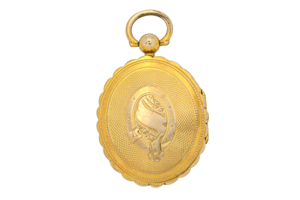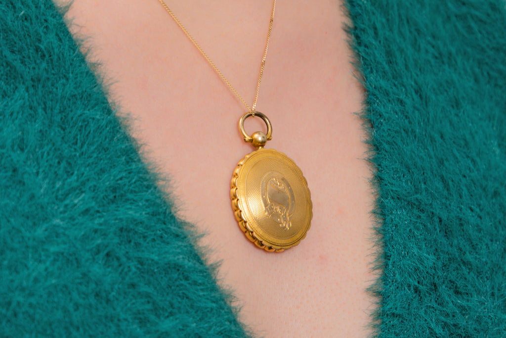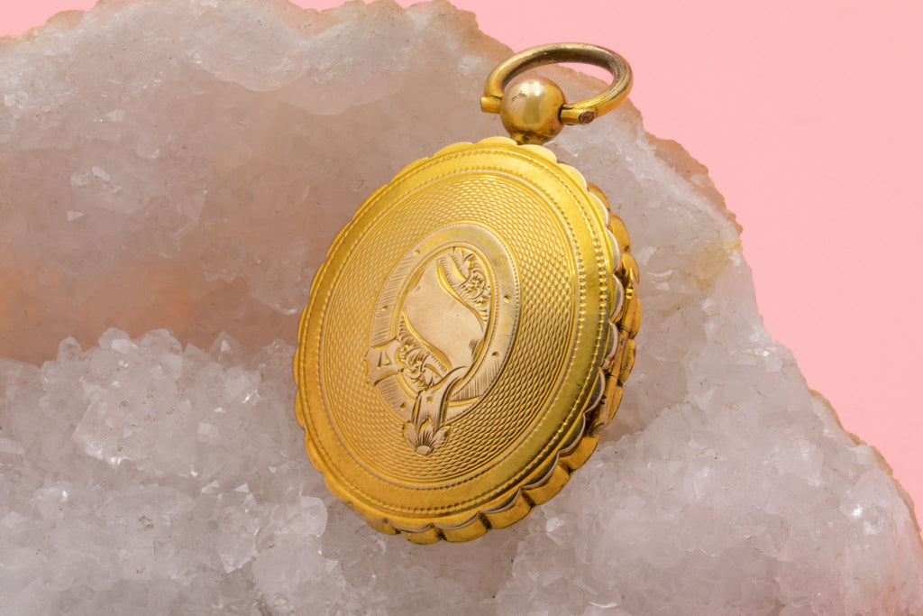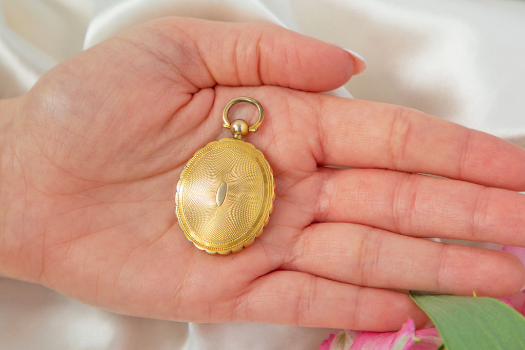This is a fine antique 9ct Gold engine turned scallop edge locket! This Victorian locket features an engine-turned front, a special technique used to create a mesmerising effect; this is accompanied by a sweet scalloped edge adding a touch of intrigue.