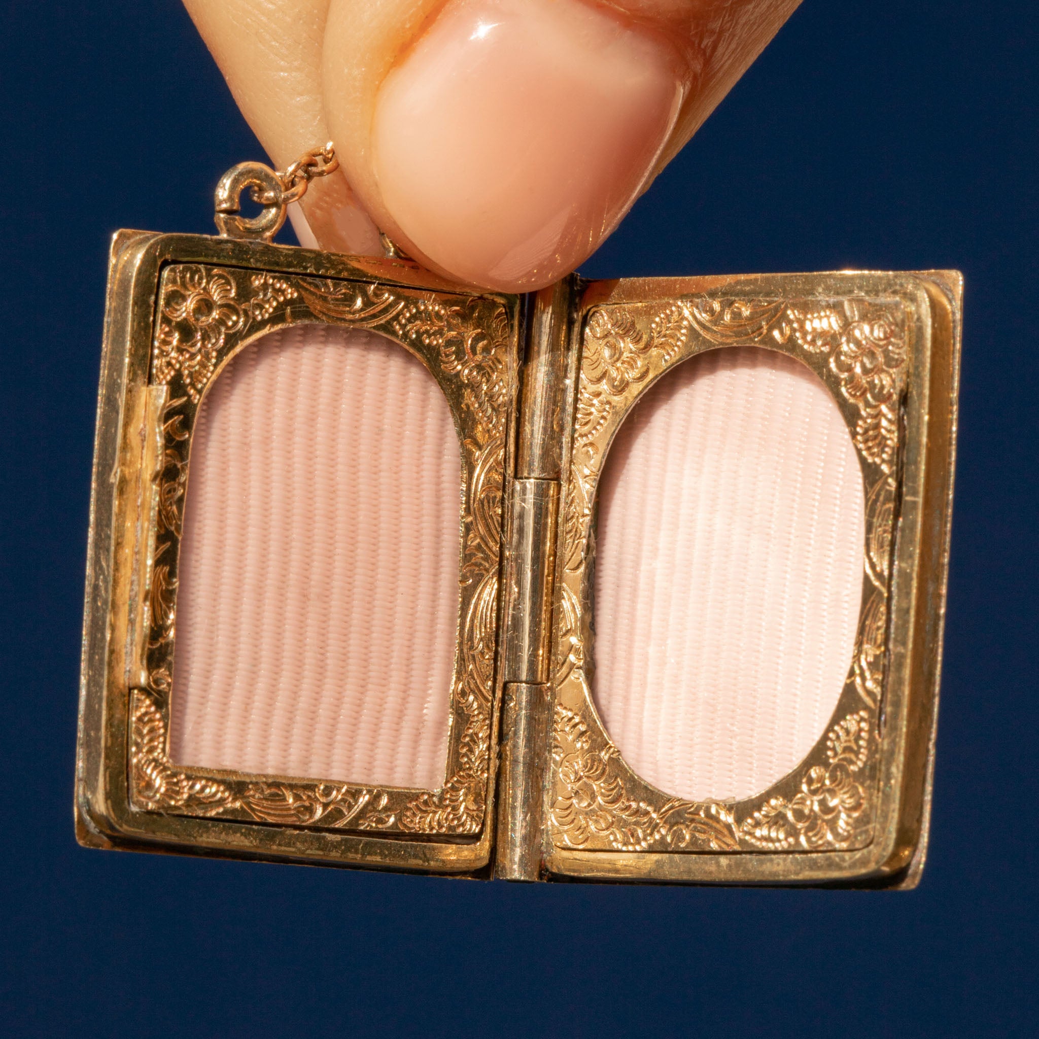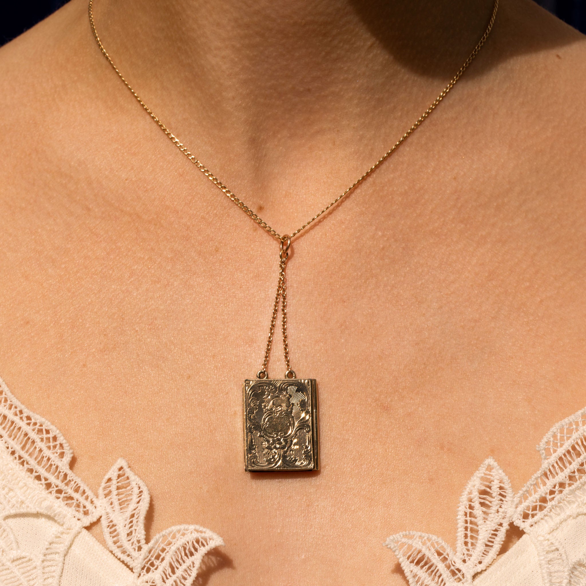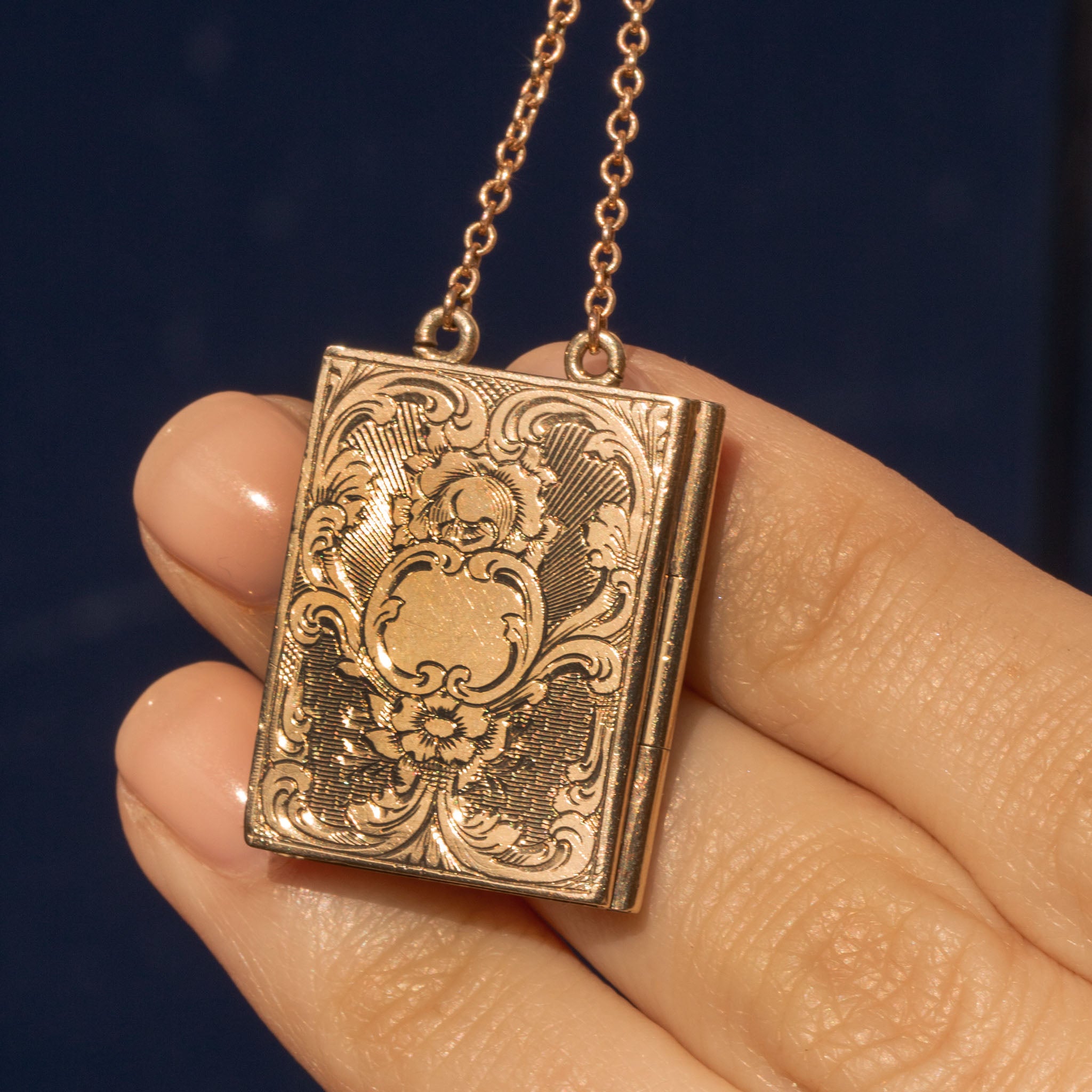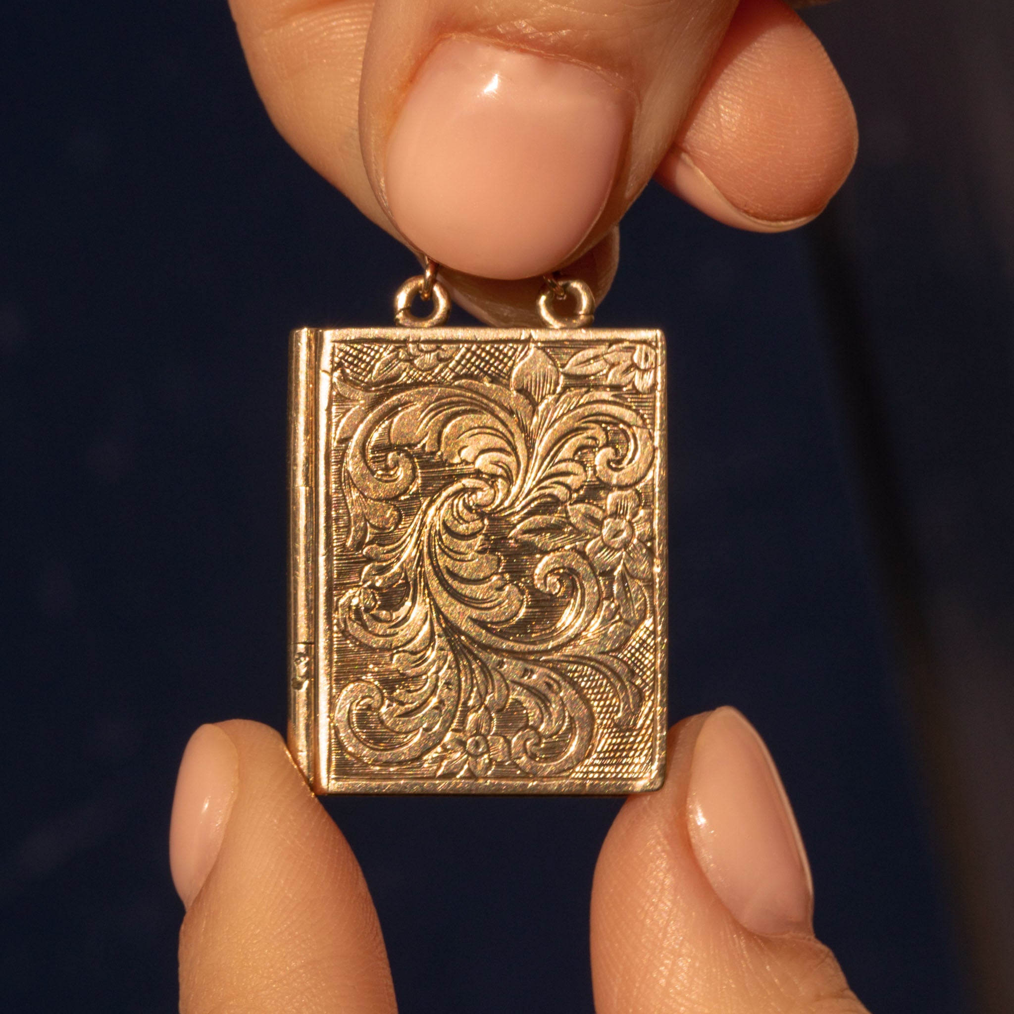 Keep your most precious photographs close to your heart at all times with this enchanting antique 9ct Gold engraved book locket! Exquisitely crafted from buttery 9ct Gold, the attention to detail on this Victorian locket is next to none.