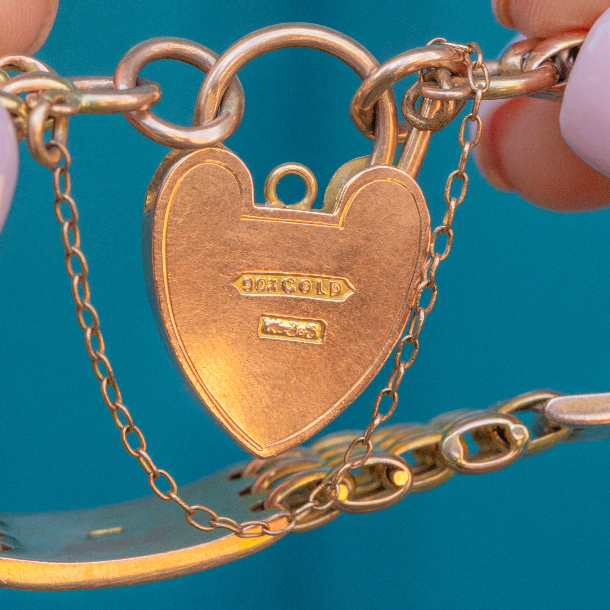 Antique 9ct Gold Engraved Gate Bracelet, Heart Padlock