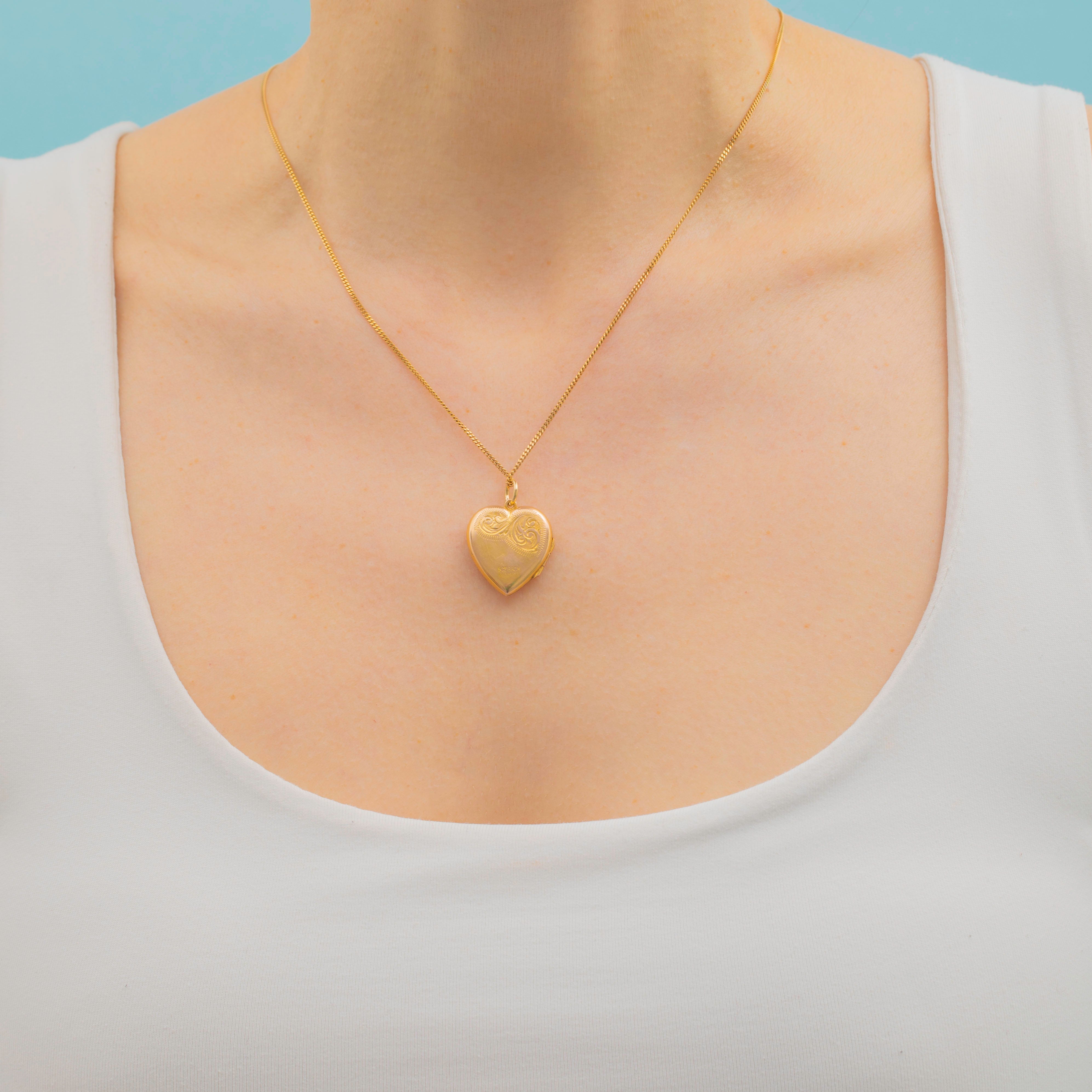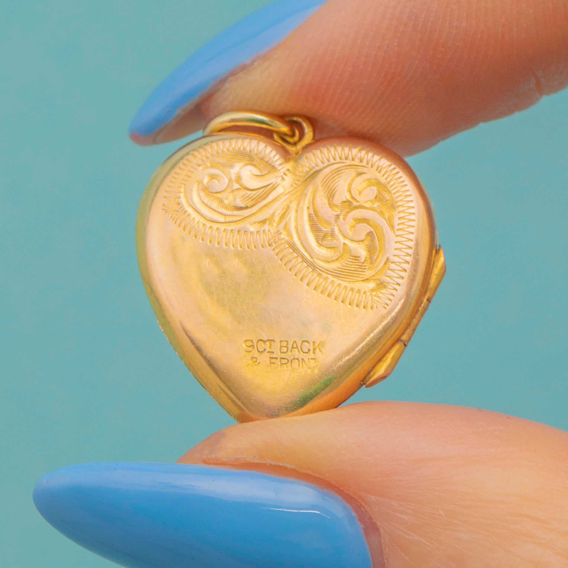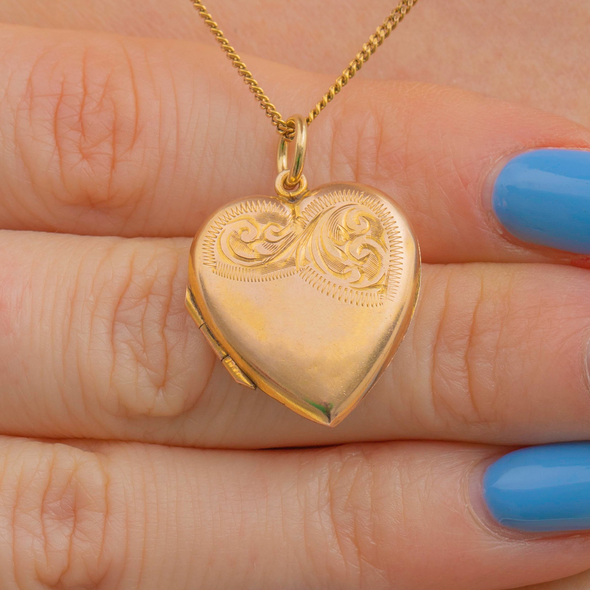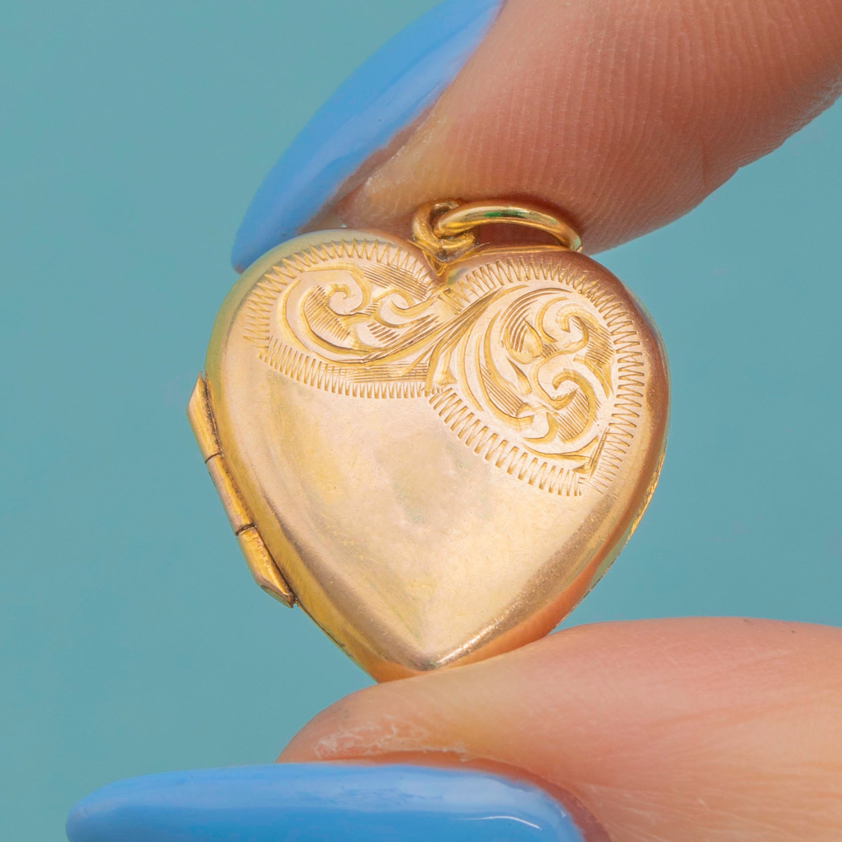 EXCELLENT. This antique 9ct Gold engraved heart locket is in excellent condition, especially when considering its grand age. The Gold is buttery and the engraved details have remained crisp, with only very minor age-related wear. Both original frames are present and the locket closes securely allowing you to enjoy it confidently for years to come!