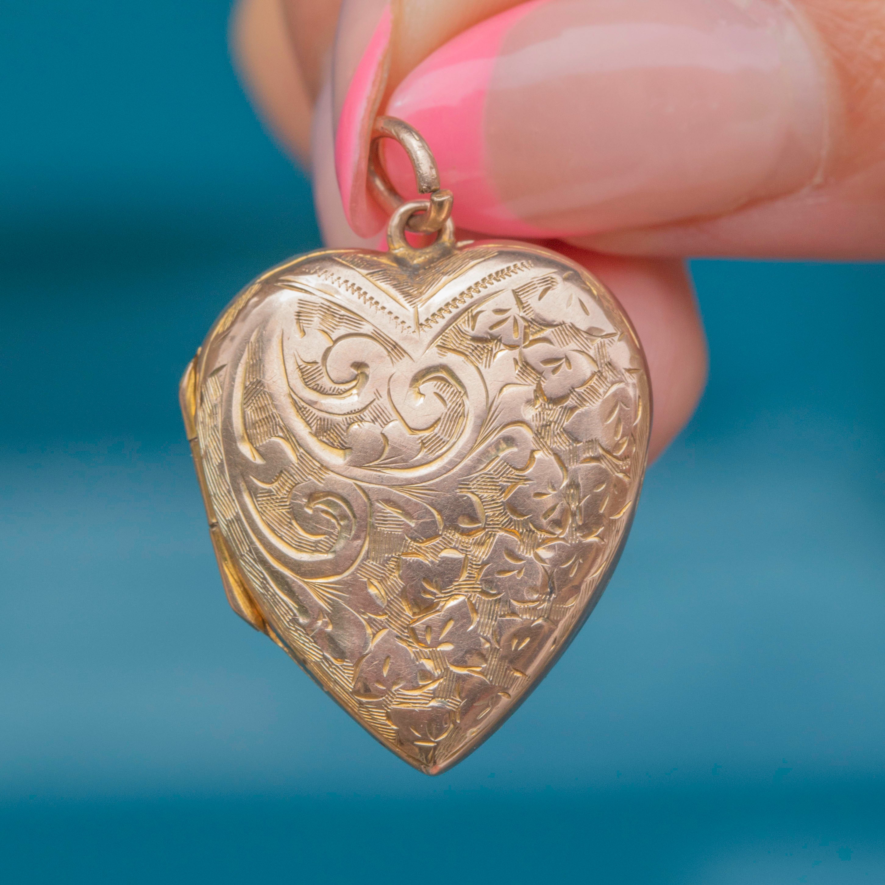 VERY GOOD-EXCELLENT: This Victorian 9ct Gold engraved heart locket is in great condition. The Gold is bright and buttery and her engravings have remained crisp. There are some small signs of wear inside the locket, though this is expected with age. With a securely soldered jump ring, she can be worn with utmost confidence!