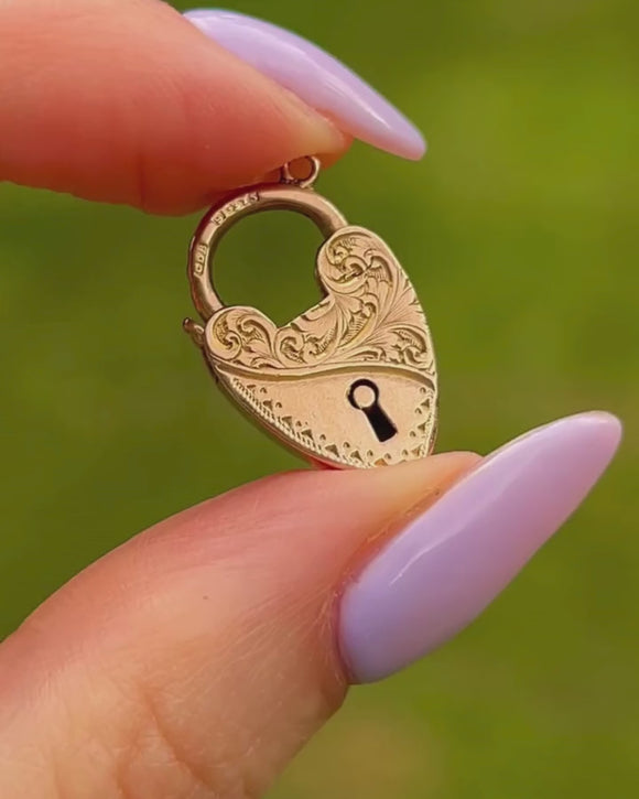 EXCELLENT. This antique 9ct Gold engraved heart padlock is in excellent condition. Her engravings are crisp and the Gold has a wonderful saturation throughout. With the padlock mechanism closing with a firm 'click', she can be worn with the utmost confidence!