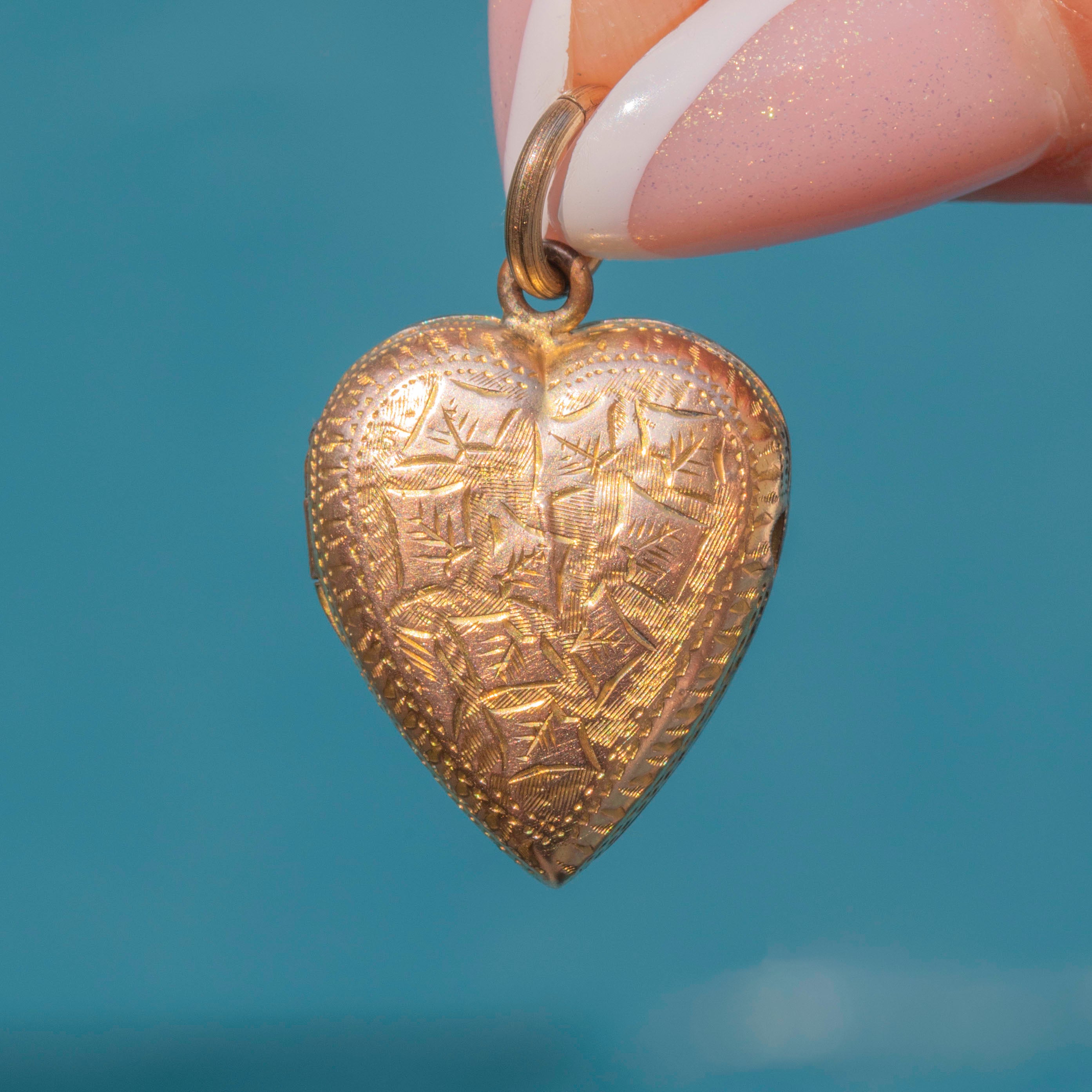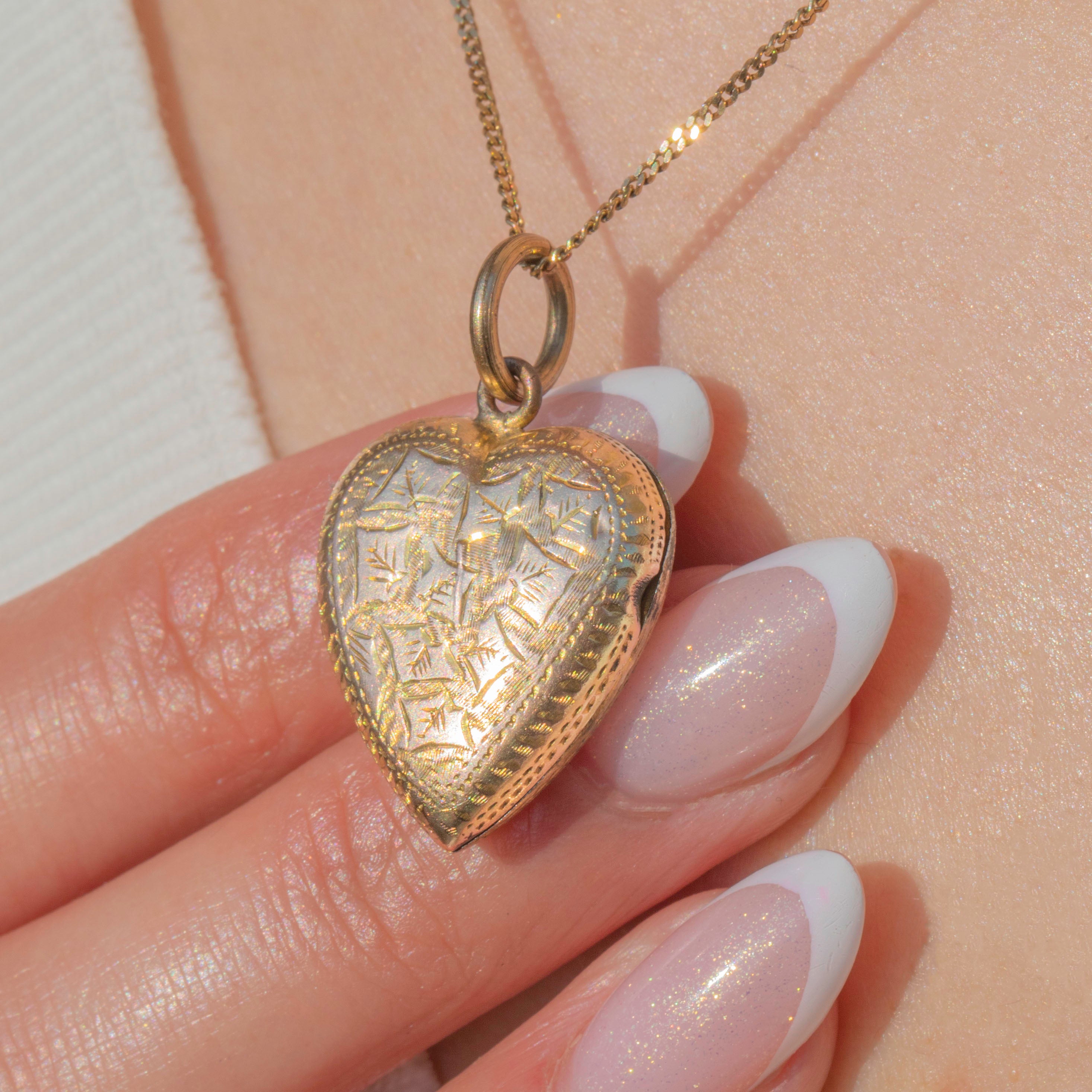 EXCELLENT: This antique 9ct Gold engraved ivy leaf heart locket is in tip-top condition. The engraved details are crisp and the Gold is bright. The locket opens easily and closes securely, allowing you to wear the locket with confidence. The original frames are intact inside, so you can easily add photographs of your beloved.