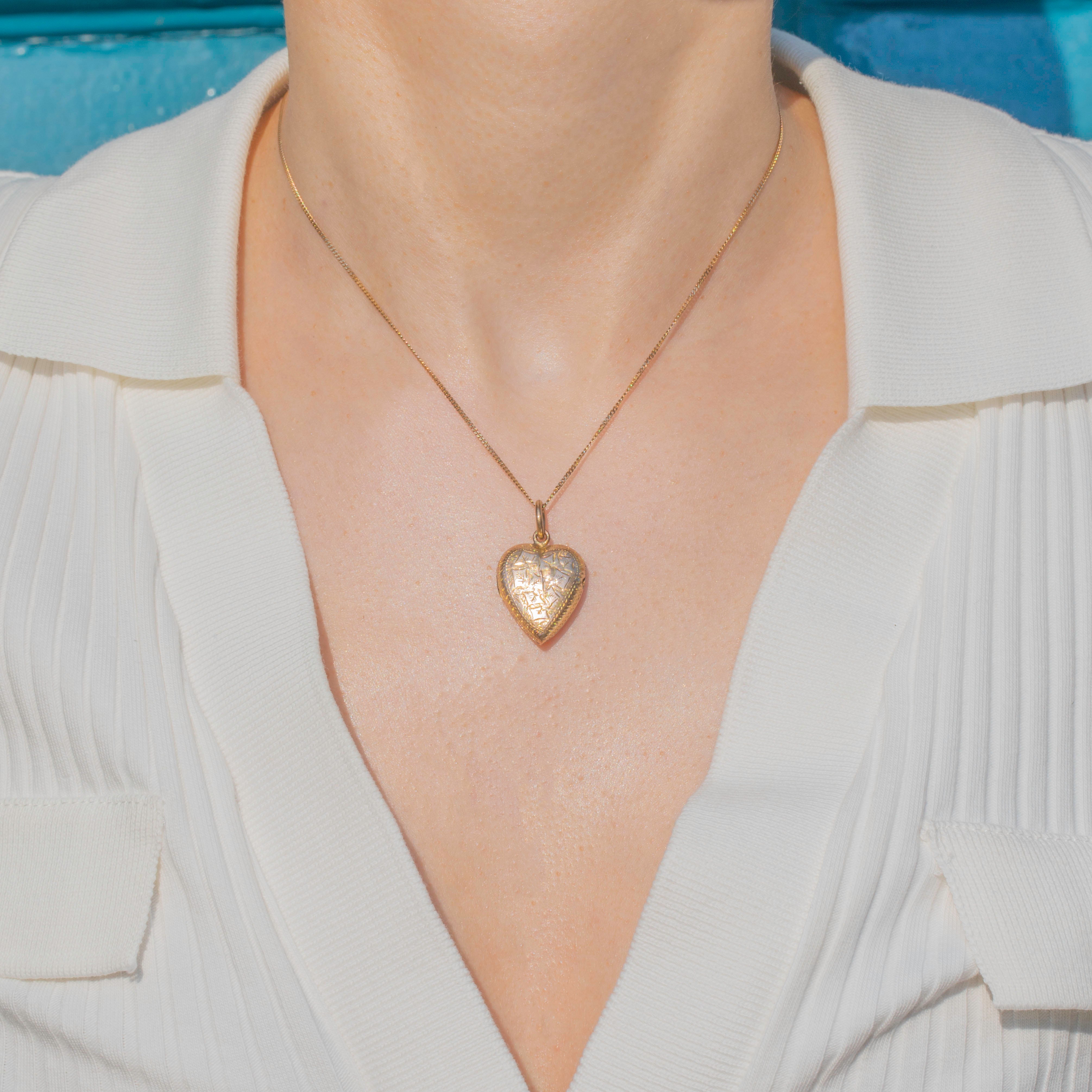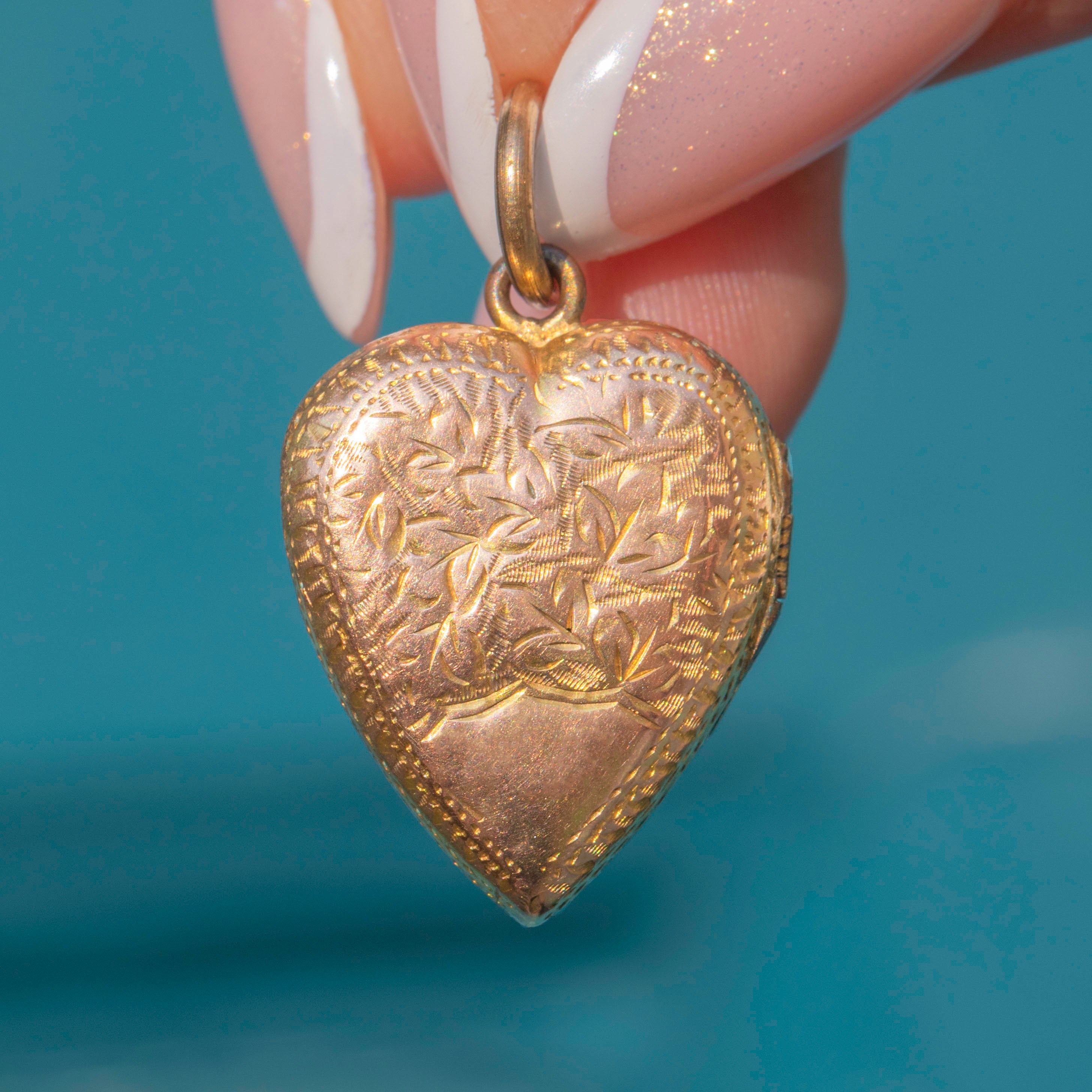This antique 9ct Gold engraved ivy leaf heart locket is a beautiful way to cherish your nearest and dearest. The entirety of the locket is covered with engraved ivy leaves, symbolic of everlasting love and commitment.