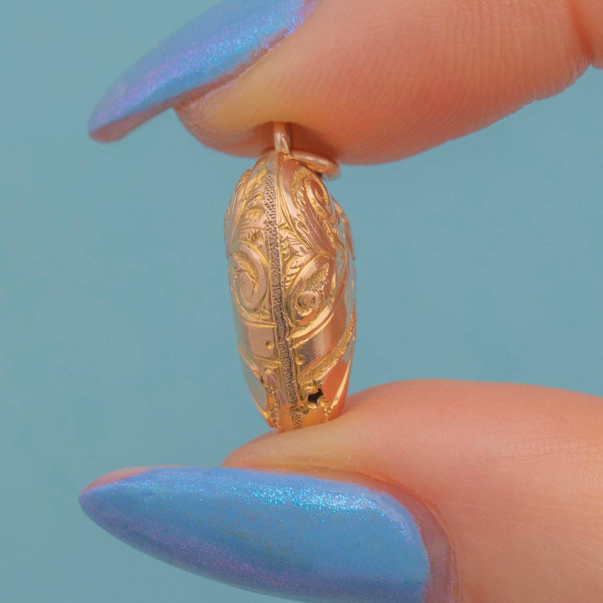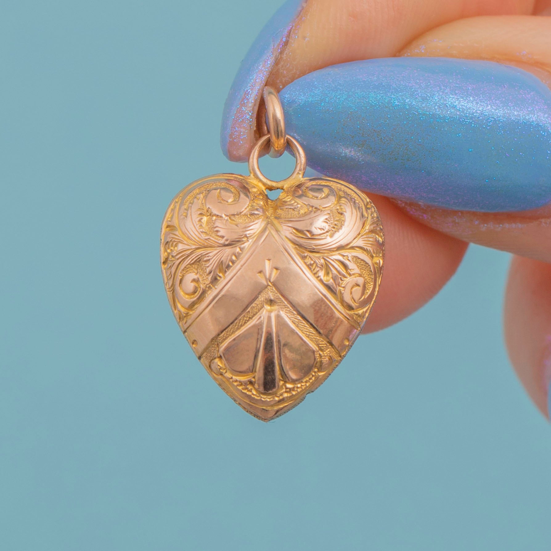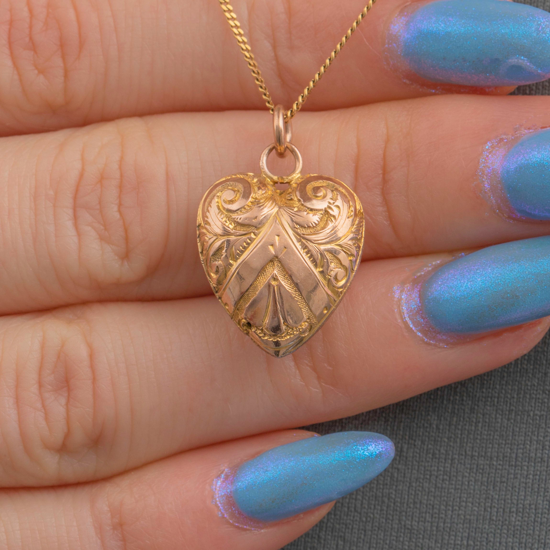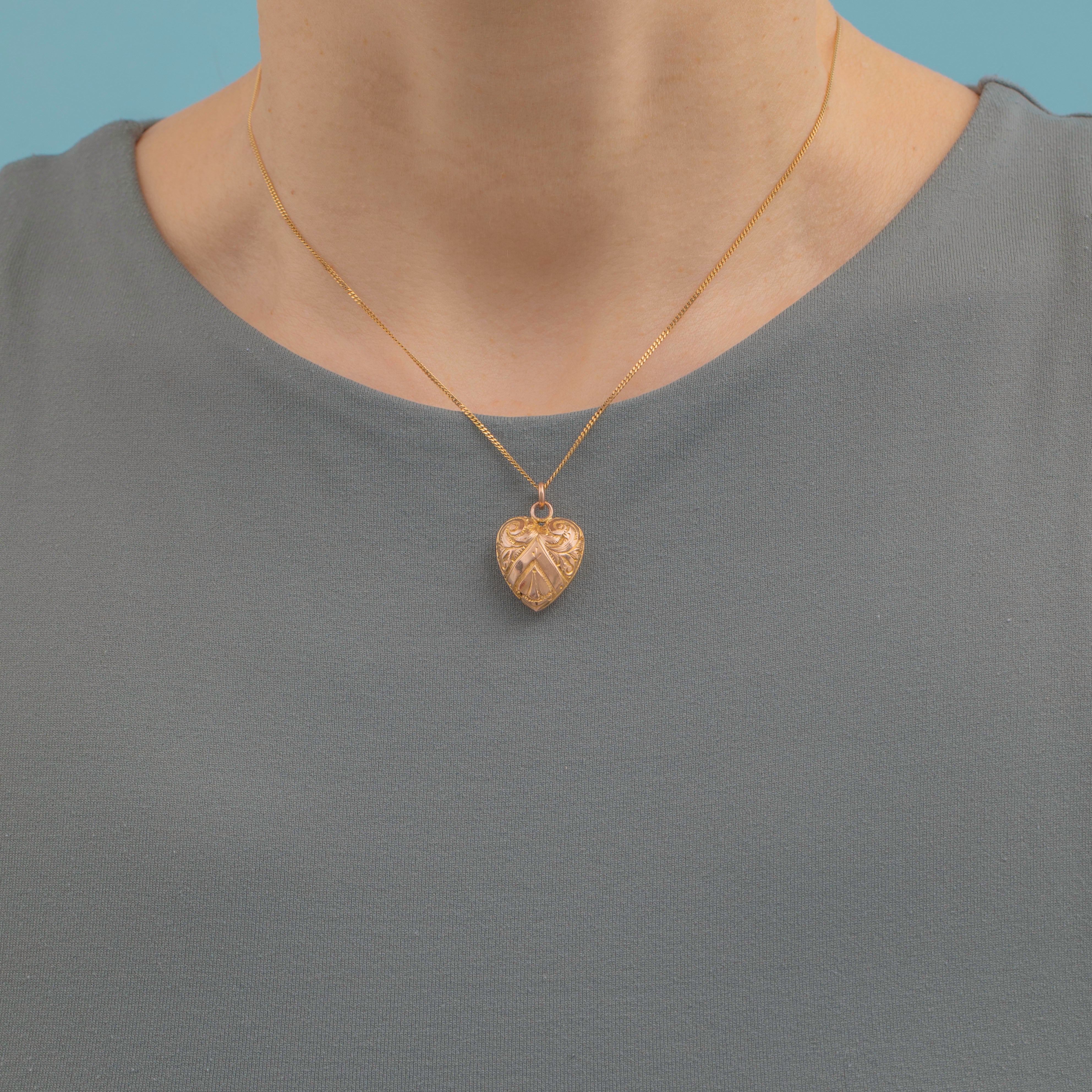 A timeless symbol of love, this antique 9ct Gold engraved puffy heart pendant would make a gorgeous gift choice! Romantic florals sweep across both sides of the puffy heart form, intricately engraved into rosy 9ct Gold.