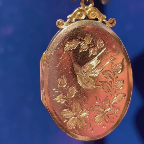Antique 9ct Gold Engraved Swallow Oval Locket
