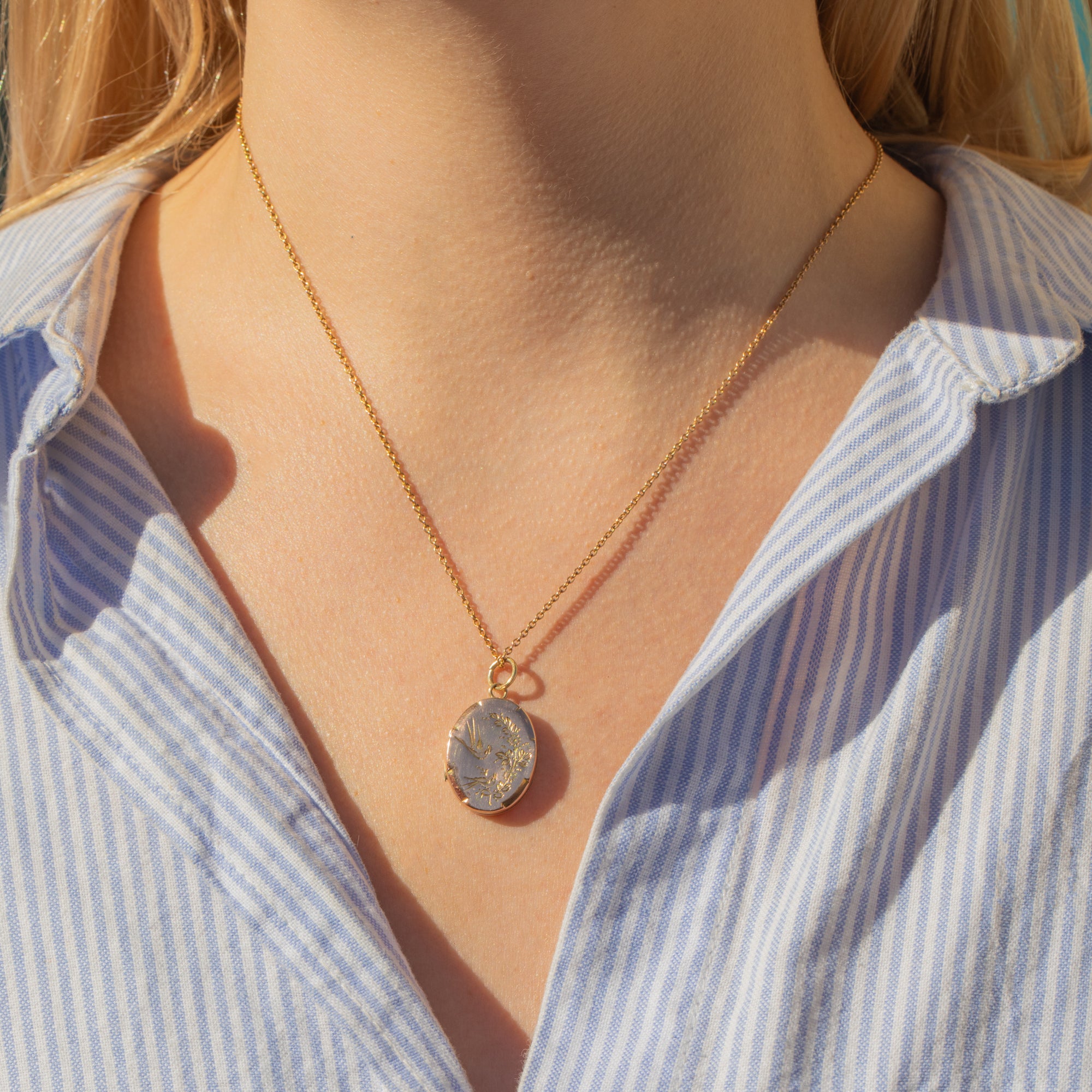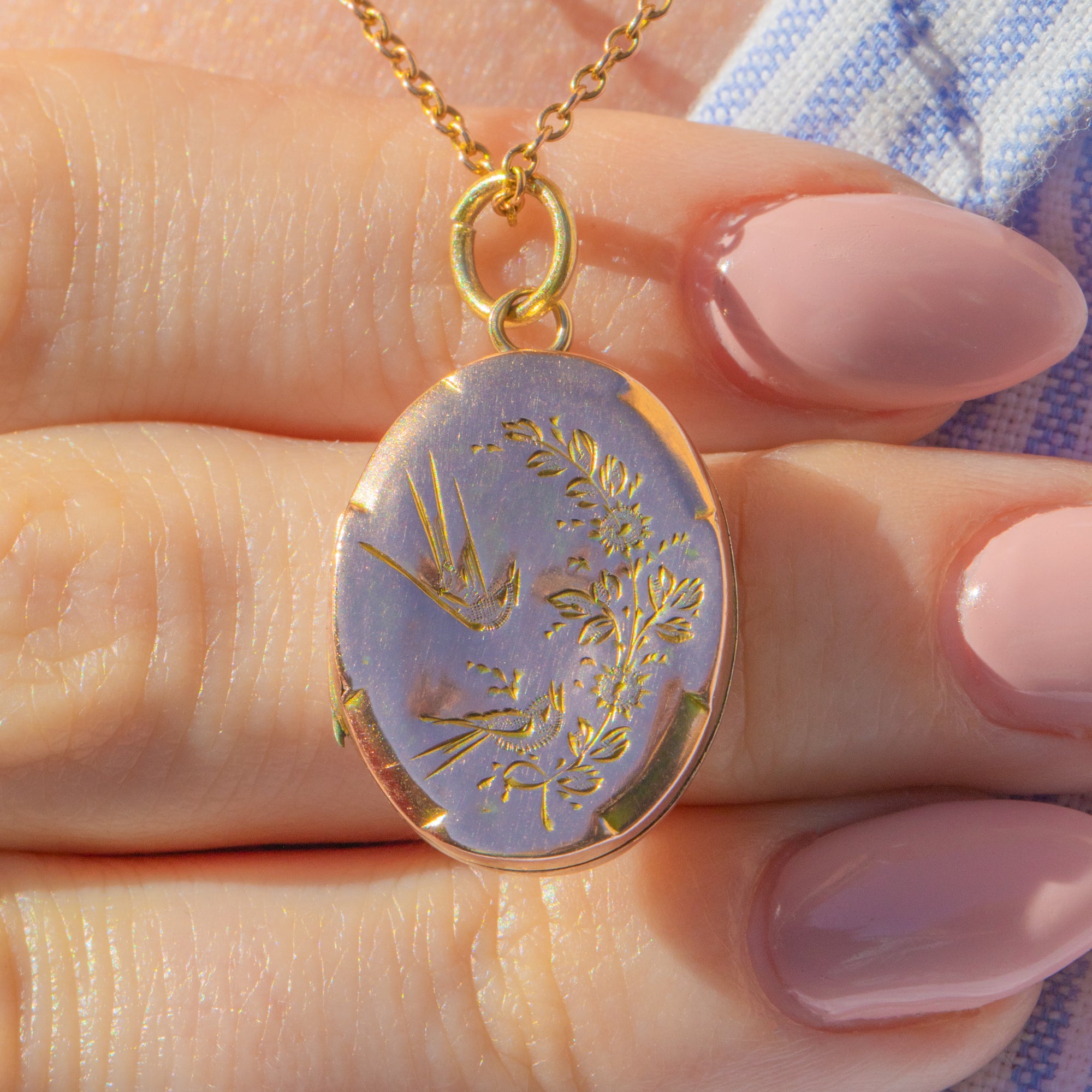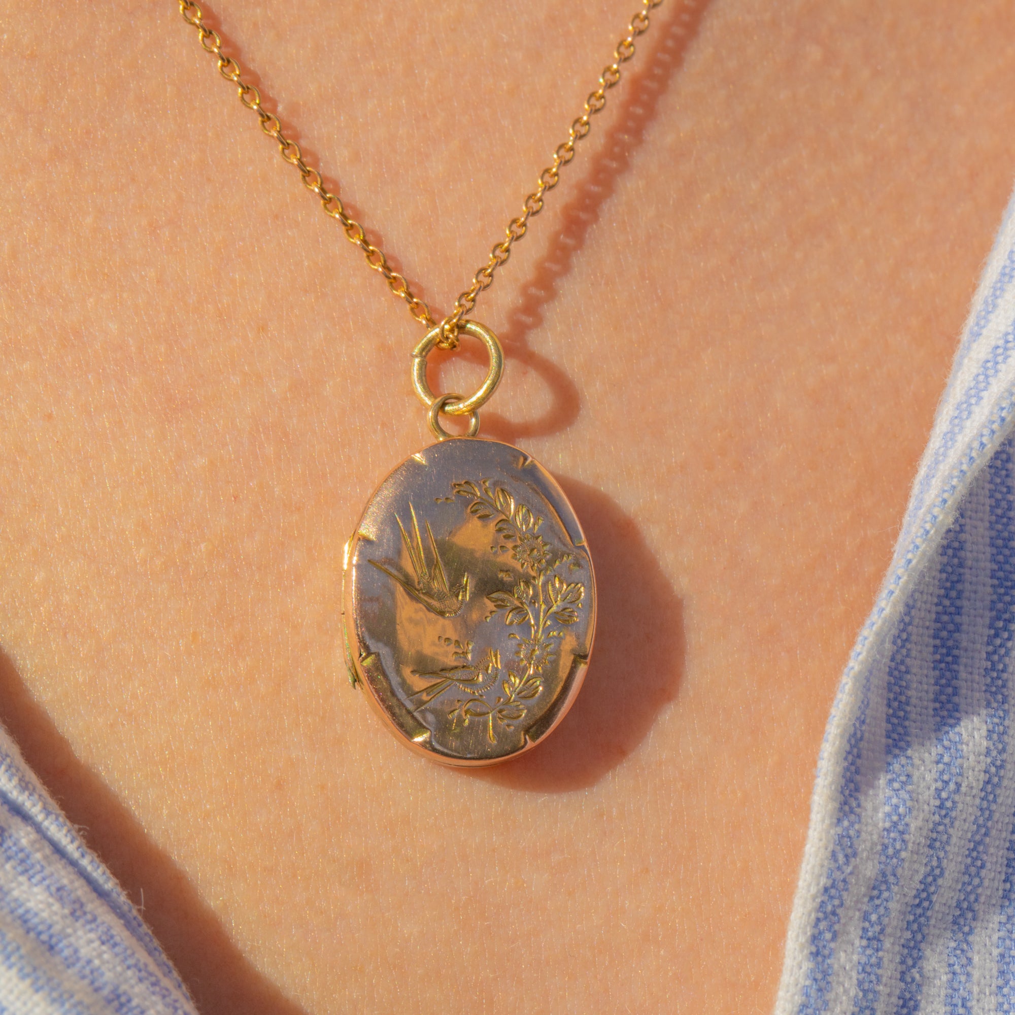 Antique 9ct Gold Engraved Swallow Oval Locket