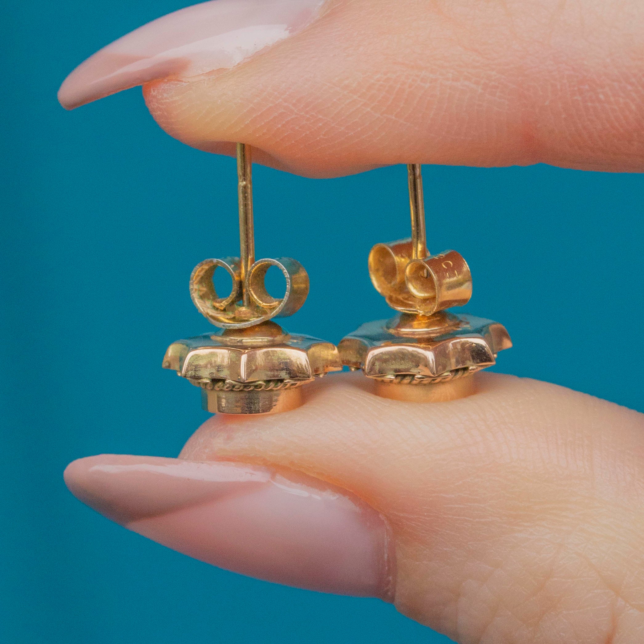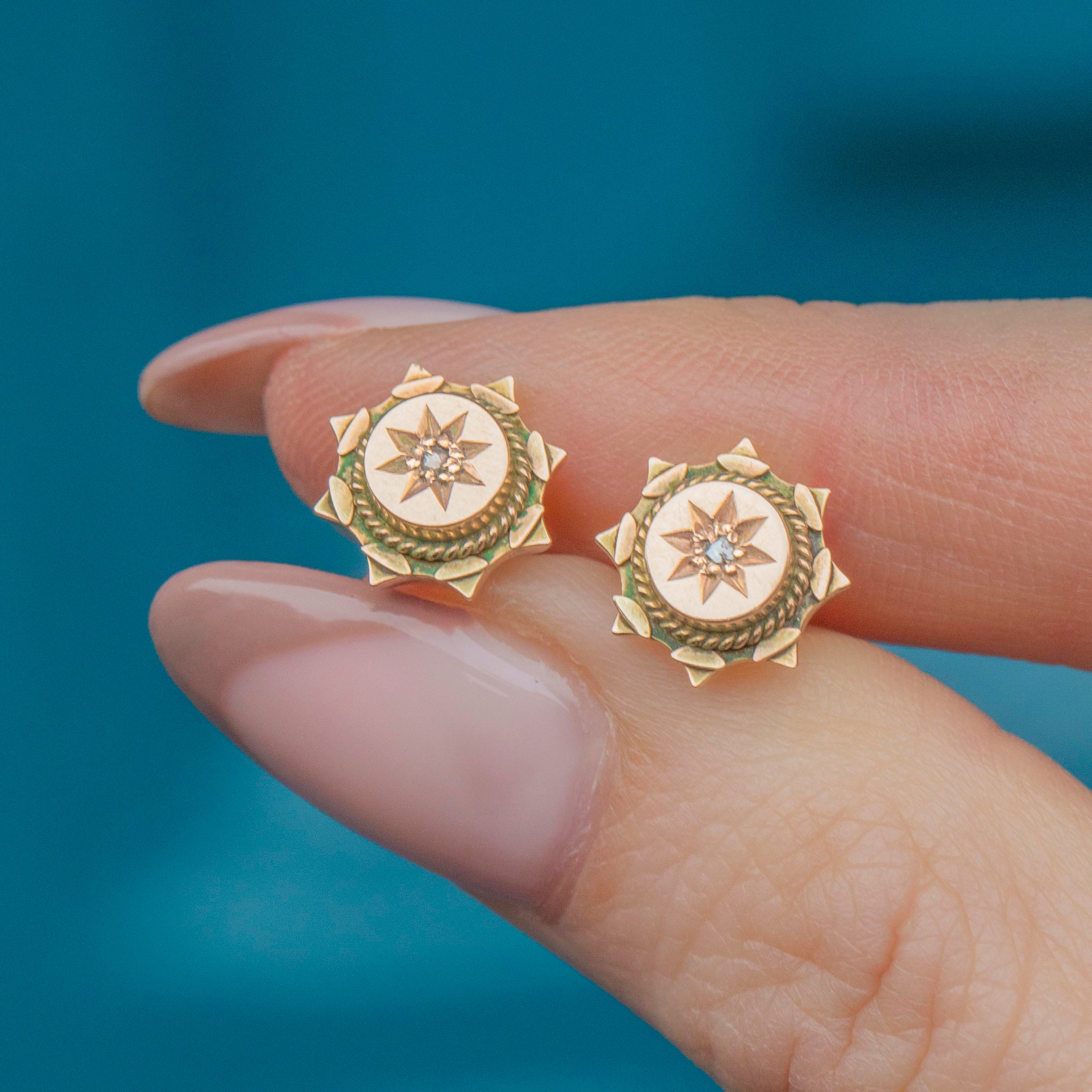 These Victorian beauties may be dainty but bring high impact. The rose-cut Diamonds twinkle flirtatiously catching your eye, and are set in a gorgeously luxurious 9ct Gold. Designed in the Etruscan style with a lovely border and sunburst corners creating the most joyous atmosphere!