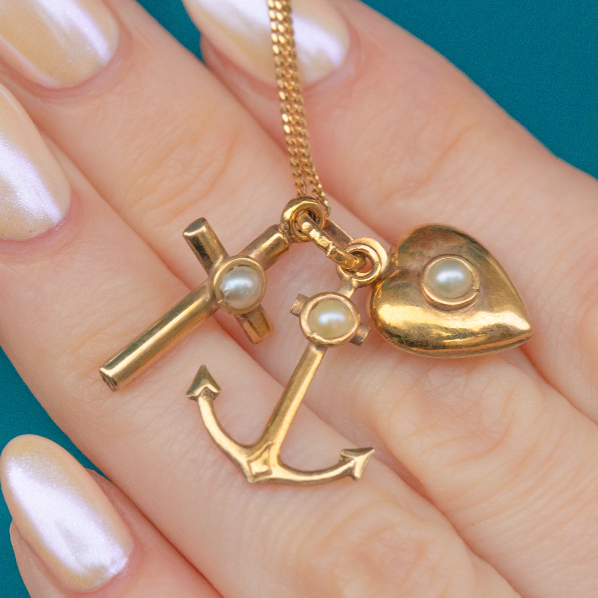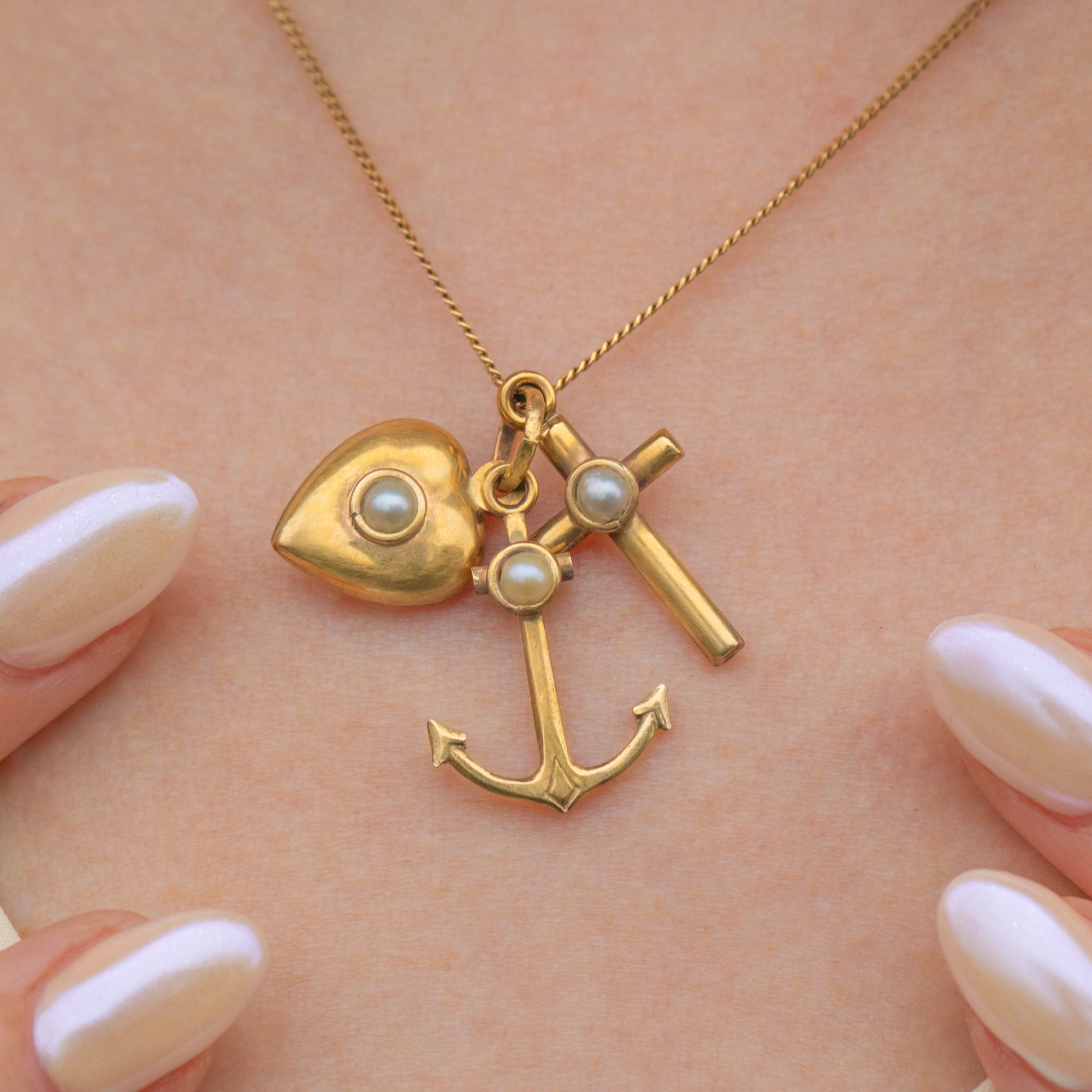 EXCELLENT. This antique 9ct Gold faith hope charity pendant is in excellent condition. The Gold has a lovely pale buttery hue and each charm is free from dings or scuffs. The Pearls are securely set with their nacre remaining smooth with no surface wear. This sweet Victorian faith hope charity charm trio will make a fab addition to your collection!