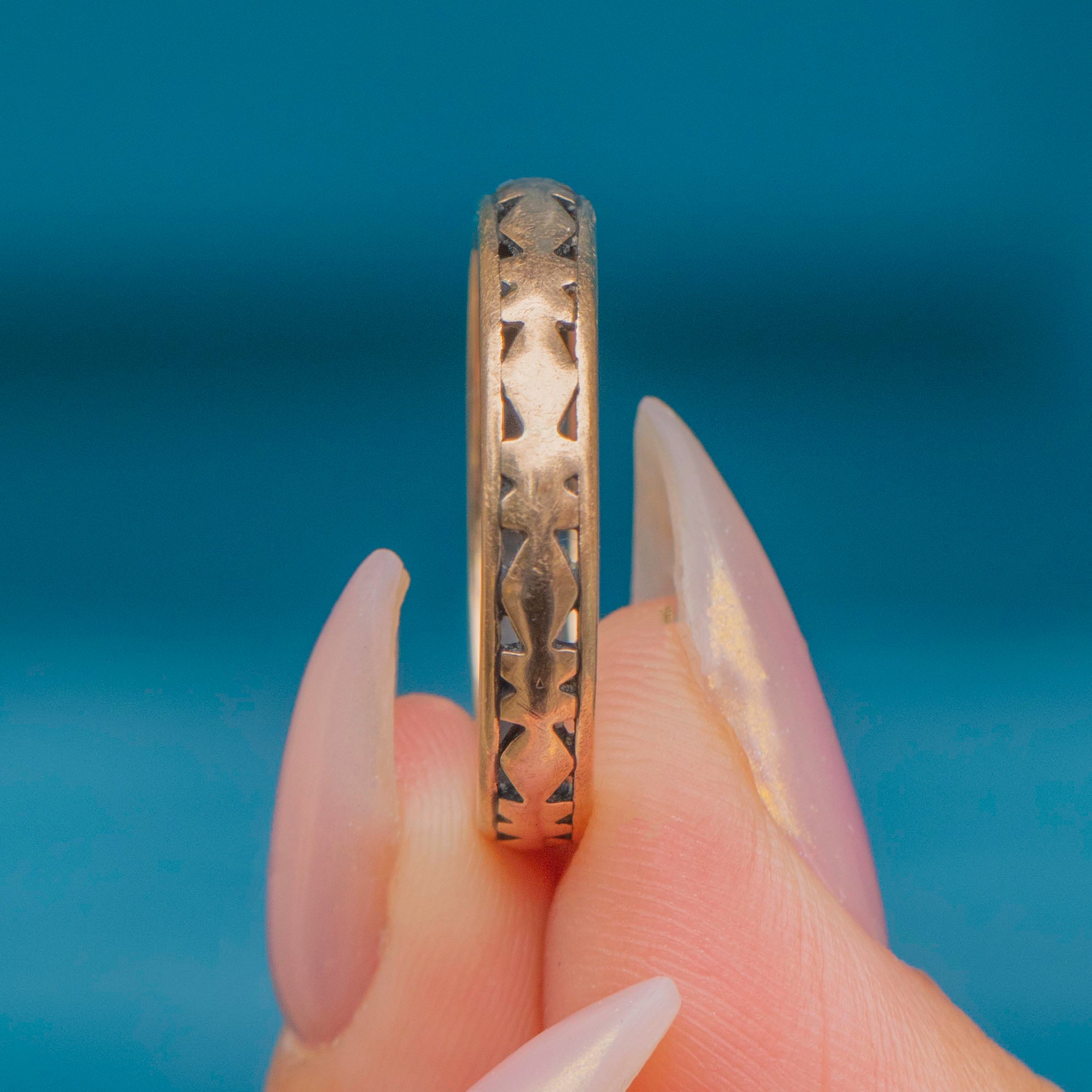 This exquisite Victorian band is crafted from 9ct Gold and features intricate pierced detailing, creating a delicate and elegant pattern around the finger.